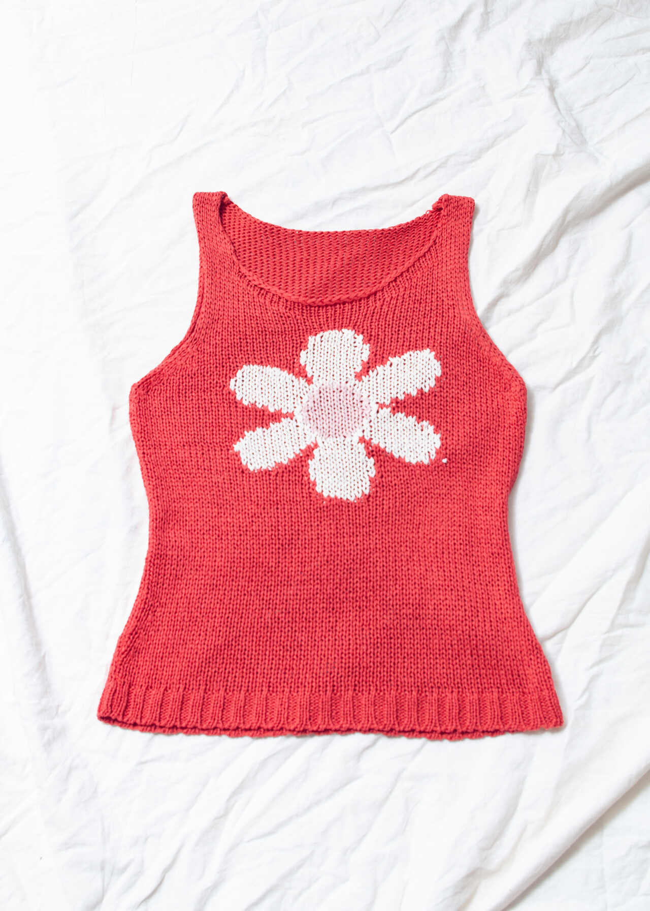Tags: 00s grunge look, 2000s style clothing, alt fashion, cute flower top, daisy knit top, indie knitwear, kawaii, Kidcore, knitted tank top, streetwear, y2k crochet vibe, y2k vintage fashion