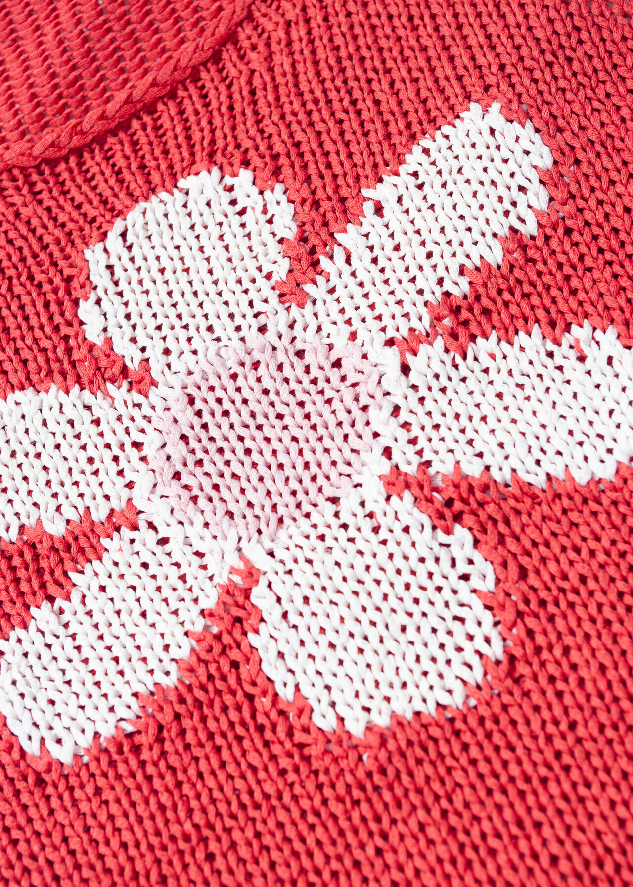 This Y2K knit tank top is basically what would happen if your childhood doodles and your grandma’s knitting skills teamed up for world domination. The bright red yarn + the chunky white flower motif = instant serotonin boost, wearable edition.