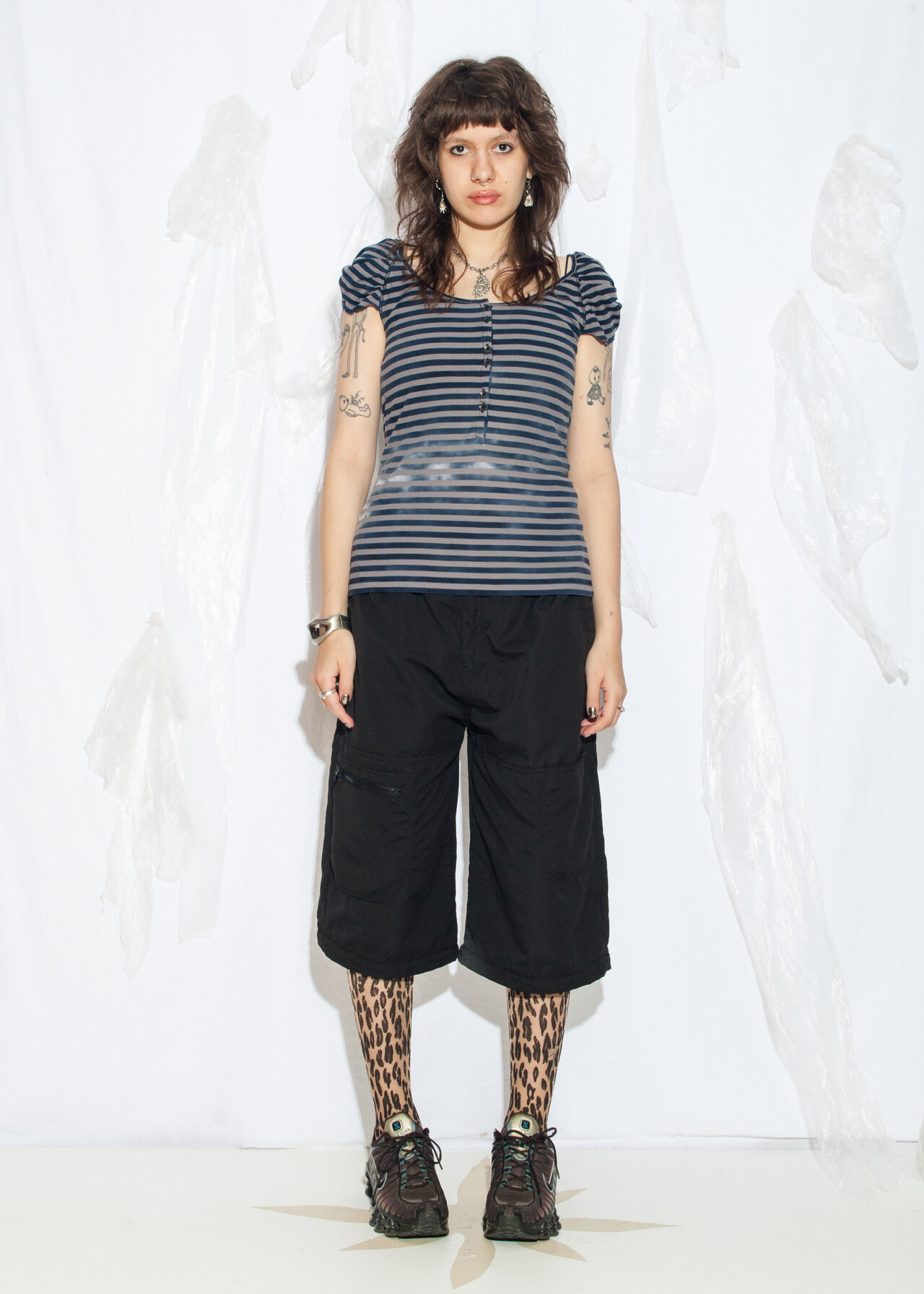 Tags: 2000s vintage fashion, clown aesthetic, designer vintage, Drykorn, fitted blouse, natural ribbed fabric, puff sleeve top, striped t-shirt, y2k style clothing