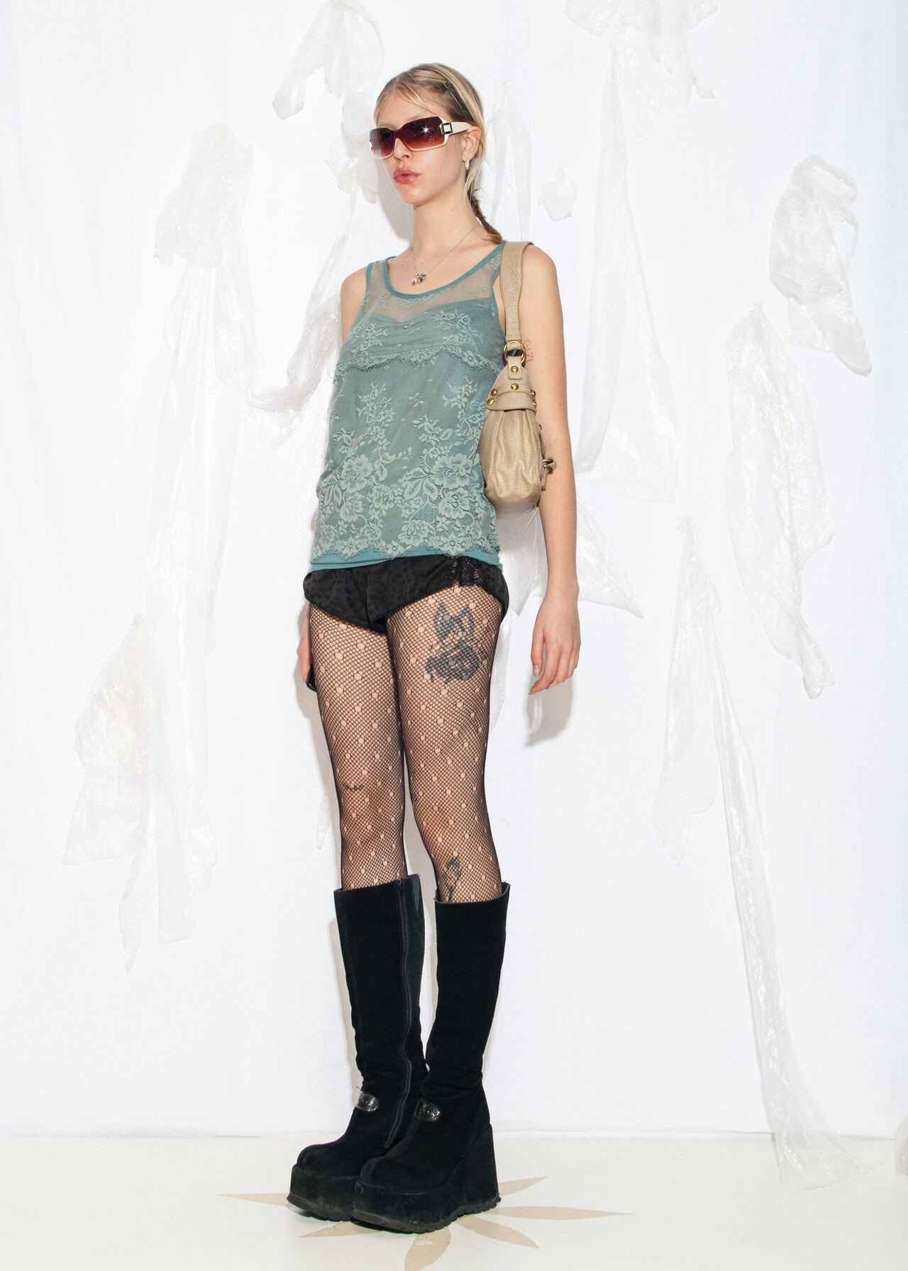 Tags: 2000s style clothing, cute coquette outfit, European vintage, Intimissimi, layered tank top, natural fabric, partywear, pastel teal lace, whimsi twee look, whimsigoth, y2k vintage fashion
