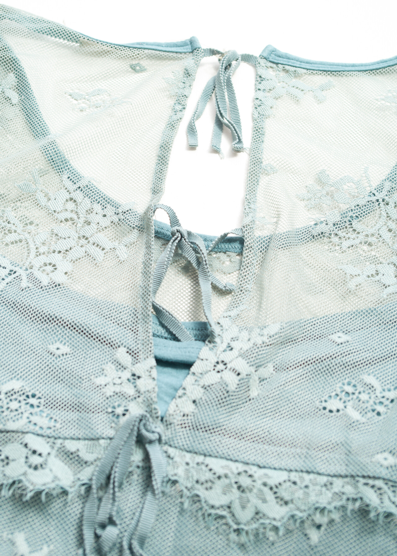 This Y2K vintage top by Intimissimi is your ticket to a pastel teal lace wonderland, where every layer whispers “partywear”.