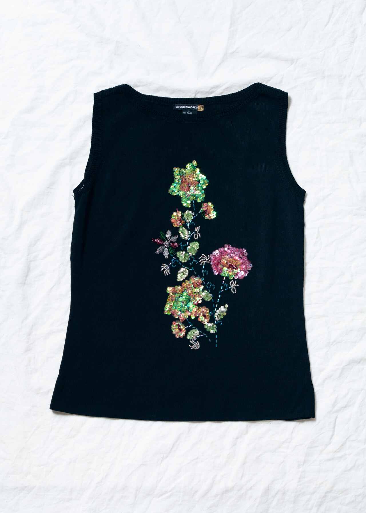 Tags: 2000s style clothing, designer vintage, flower embroidery, party blouse, ribbed knit vest, sequin top, y2k grunge outfit, y2k vintage fashion