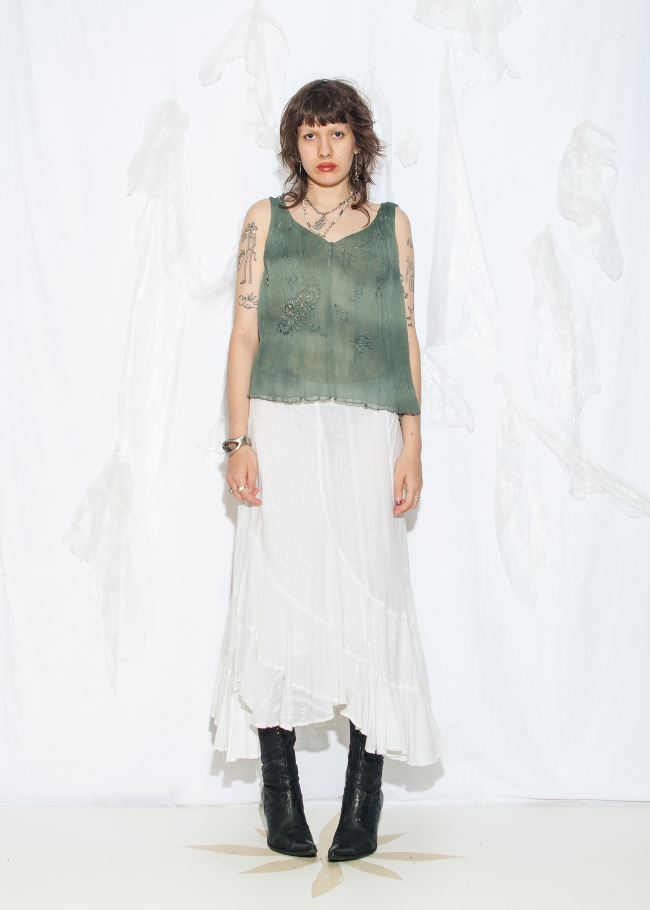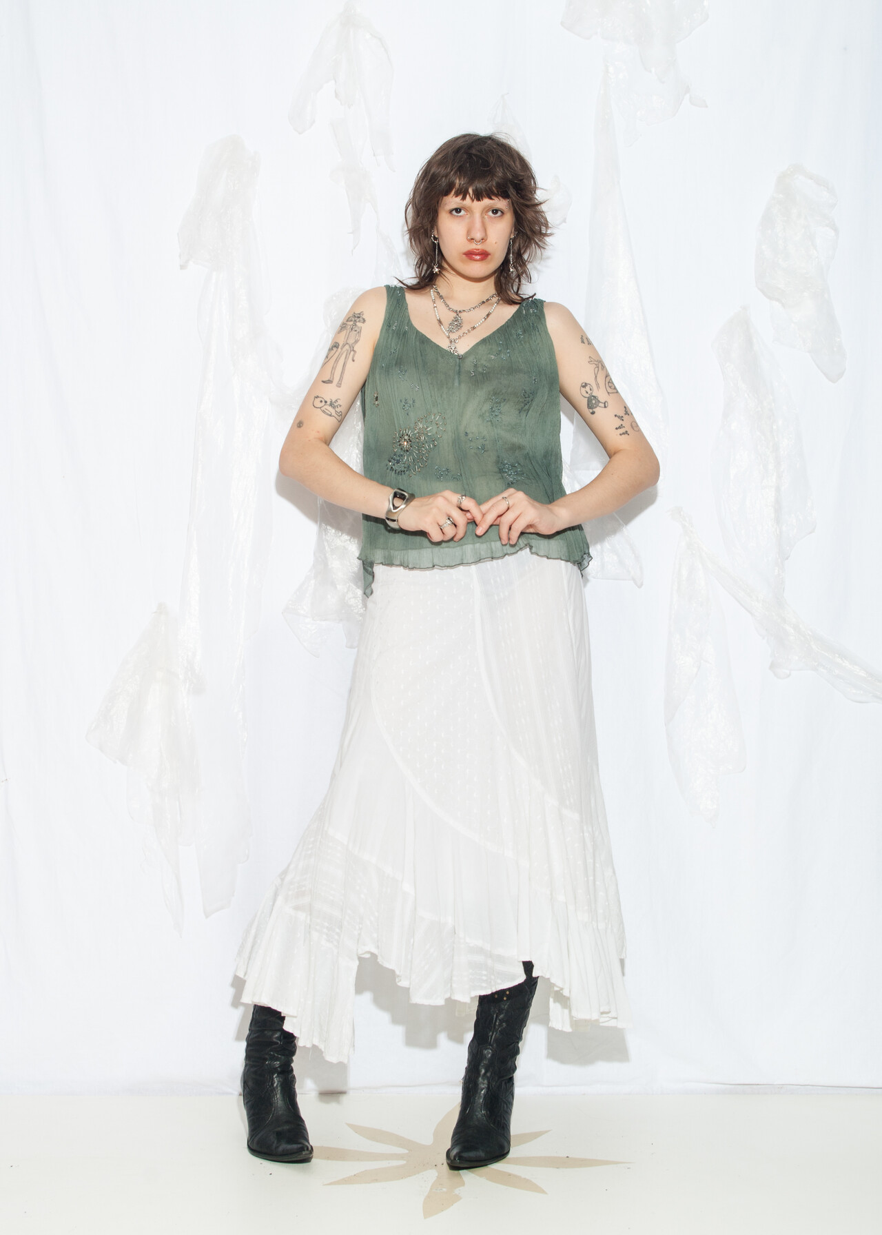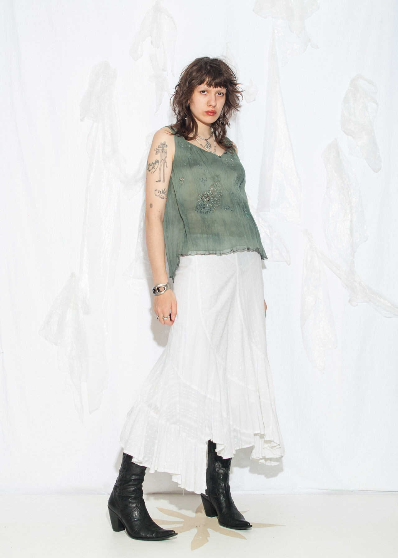This Y2K vintage top is the fairycore grunge dream made of pure silk that turns every day into a runway of embroidered nostalgia.