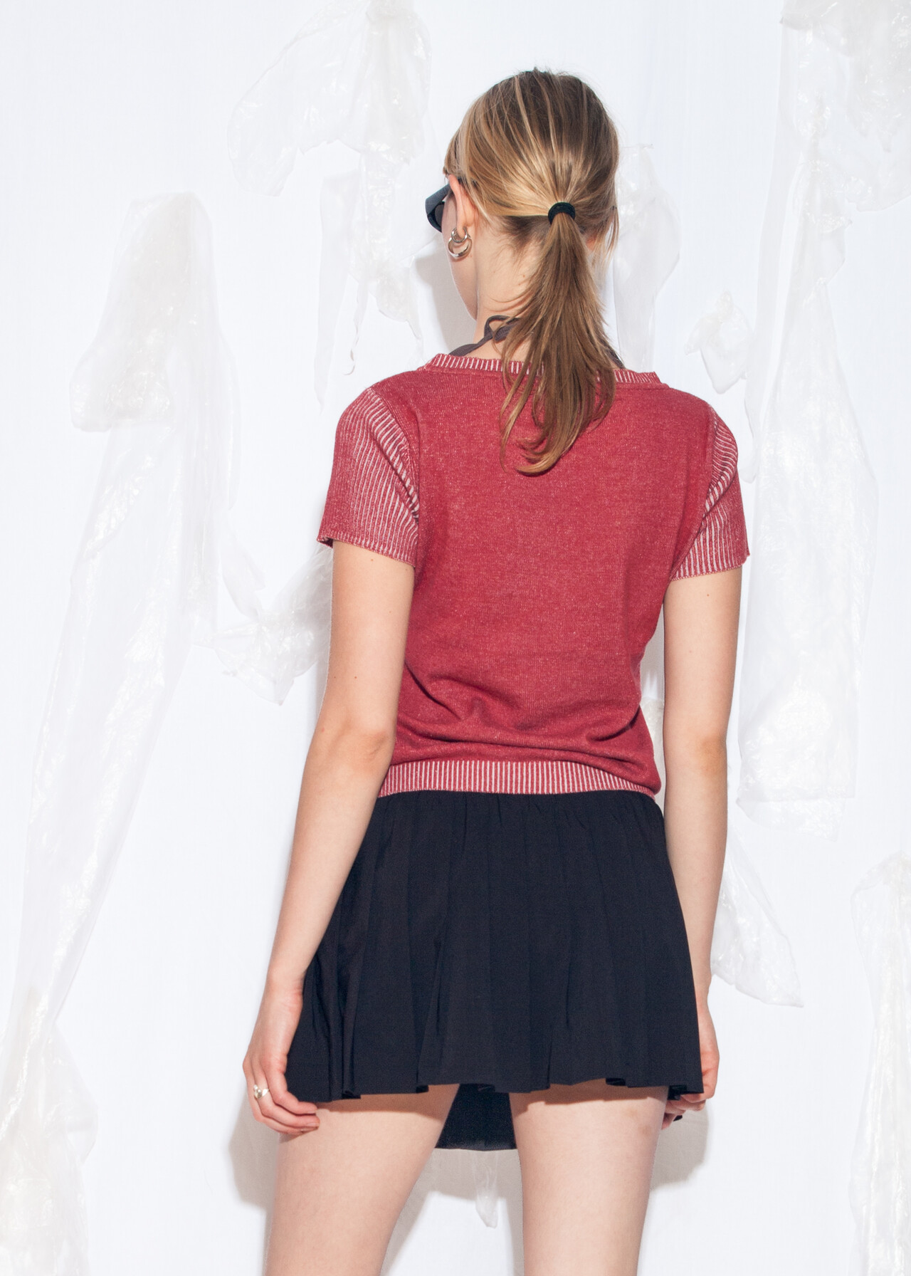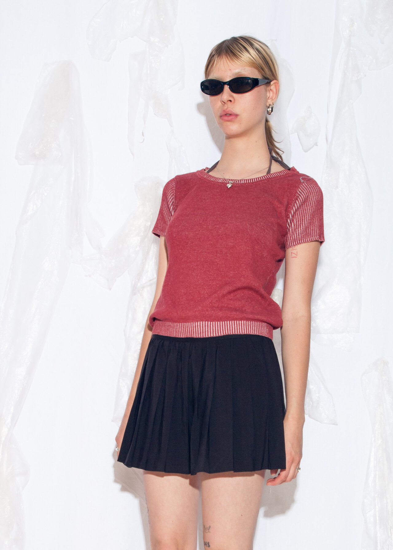 Tags: 2000s style clothing, baby tee, knitted t-shirt, maroon knit top, ribbed cotton top, y2k grunge outfit, y2k vintage fashion
