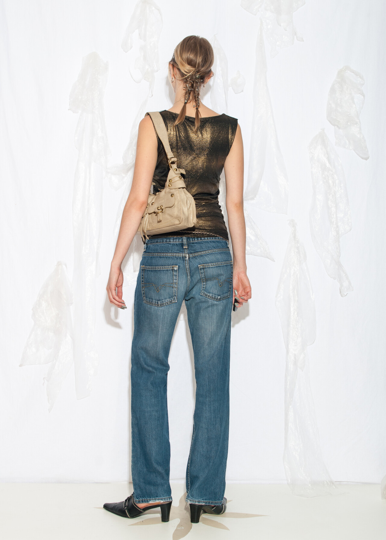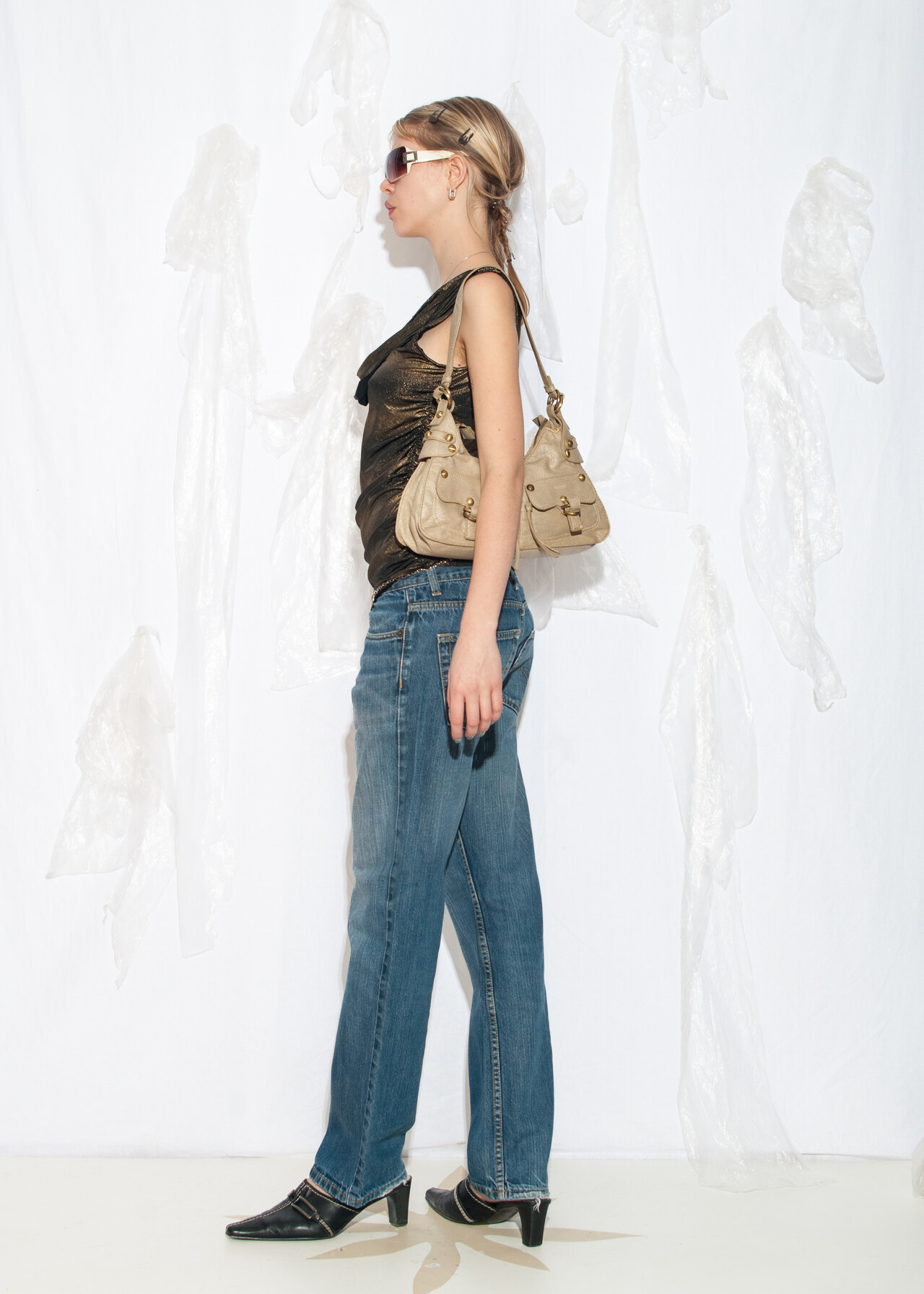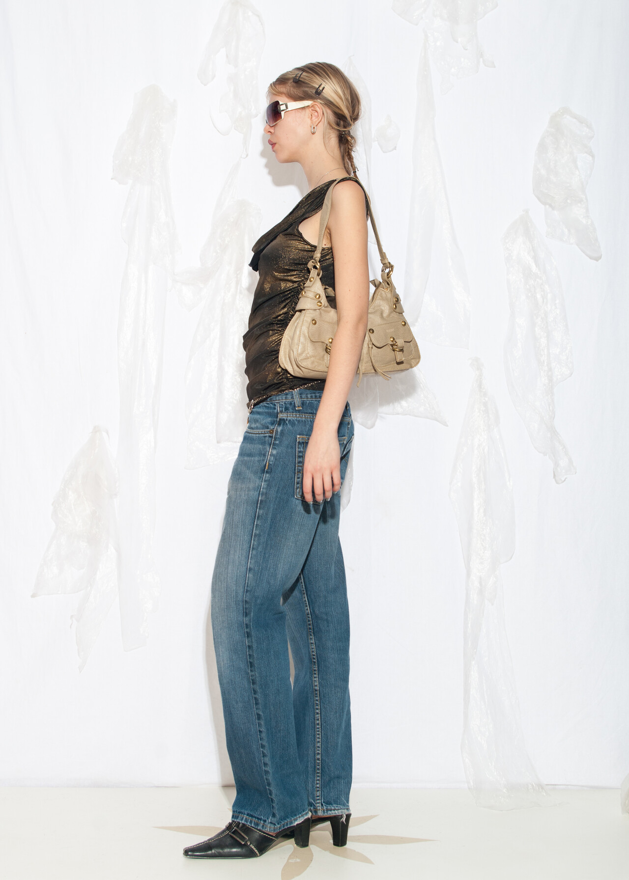 Tags: 00s partywear, 2000s style clothing, chain detail, European vintage, glam party outfit, Paris Hilton, shimmering gold, slouchy ruched top, y2k vintage fashion