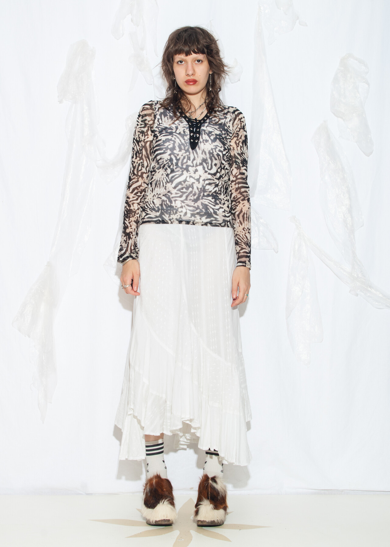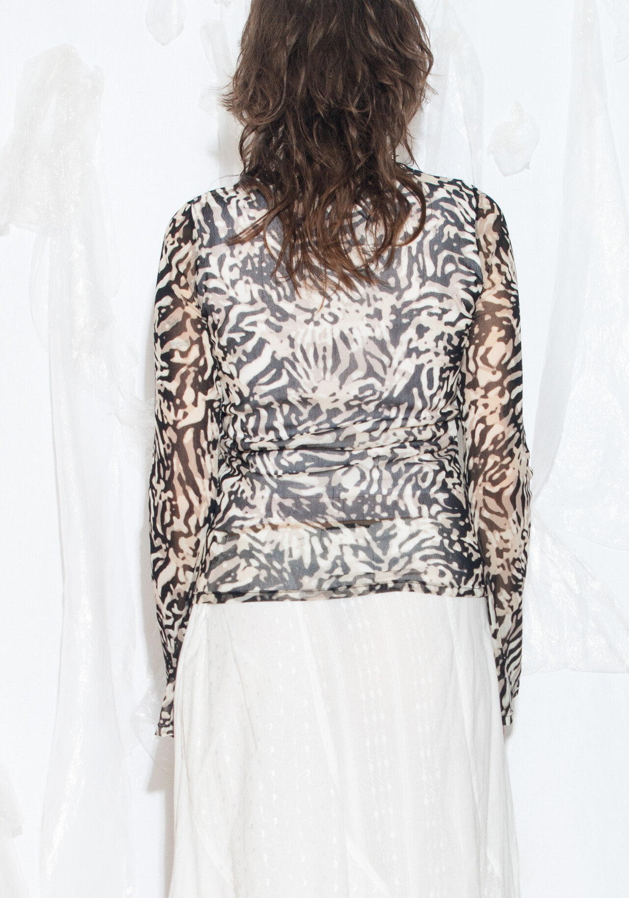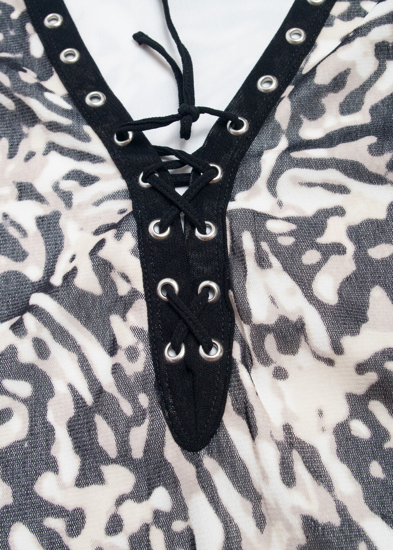 Tags: 2000s style clothing, flare sleeve top, lace up neck, long sleeve tee, mesh techno top, y2k grunge outfit, y2k vintage fashion, zebra printed
