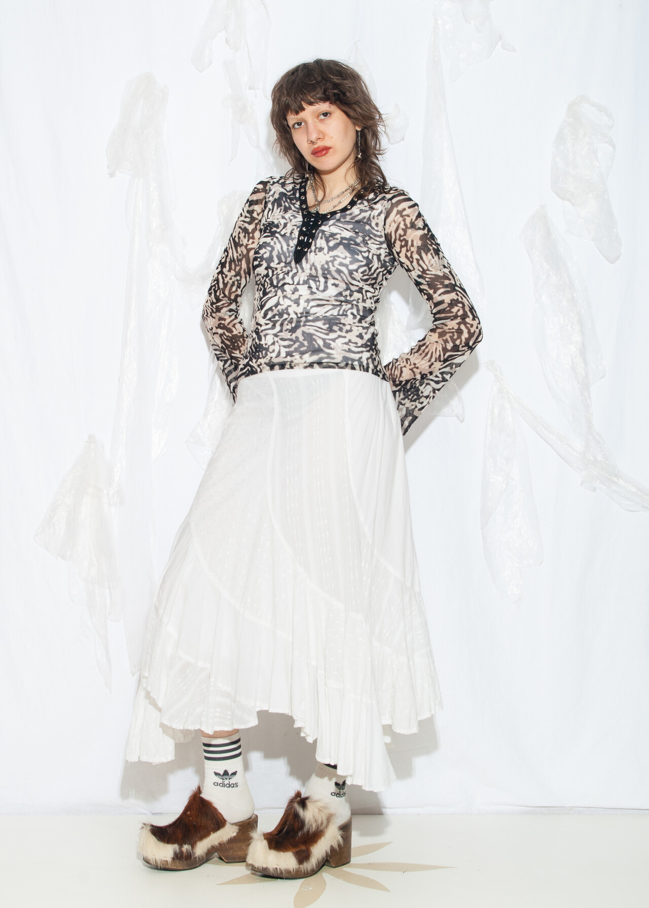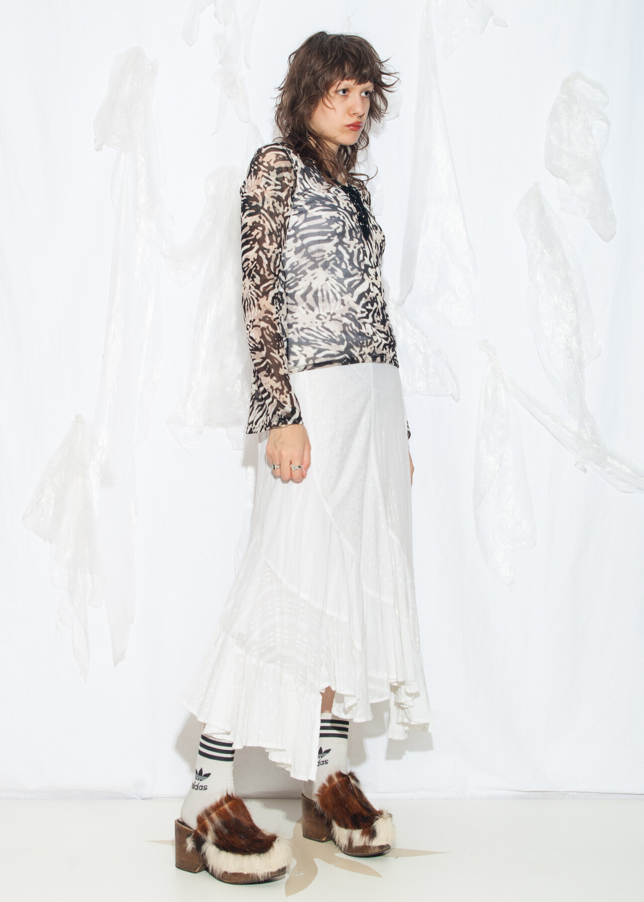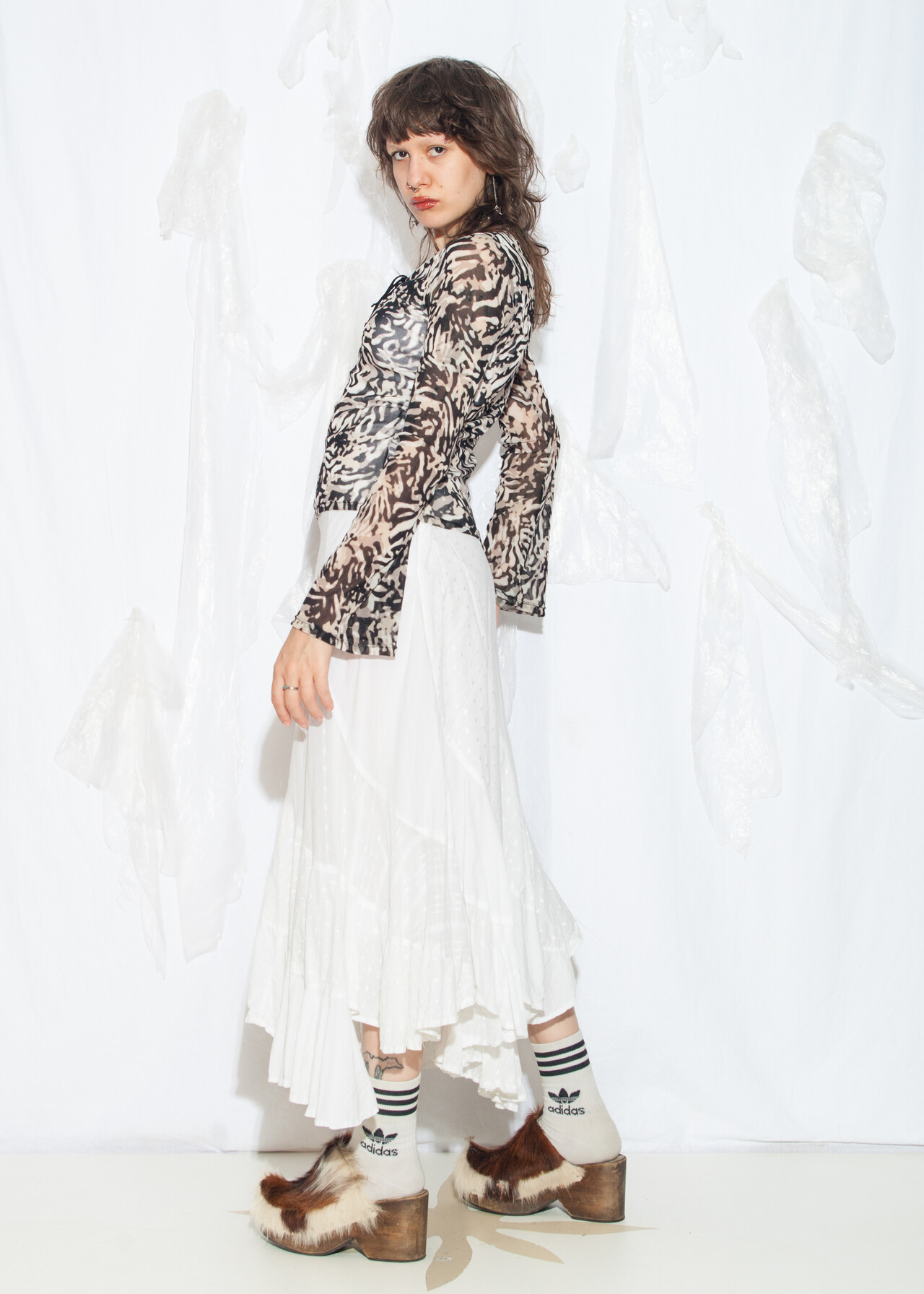Tags: 2000s style clothing, flare sleeve top, lace up neck, long sleeve tee, mesh techno top, y2k grunge outfit, y2k vintage fashion, zebra printed