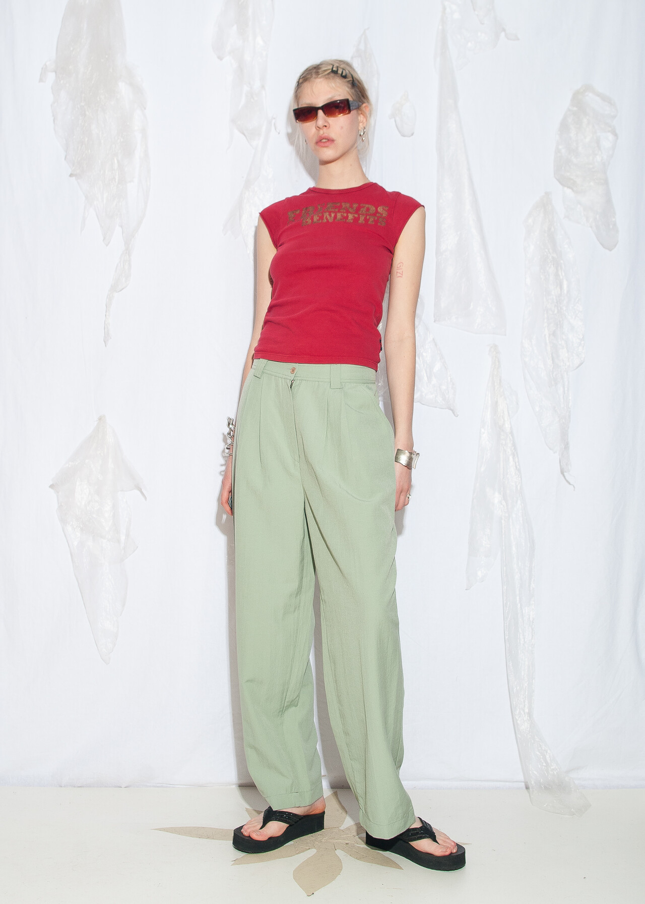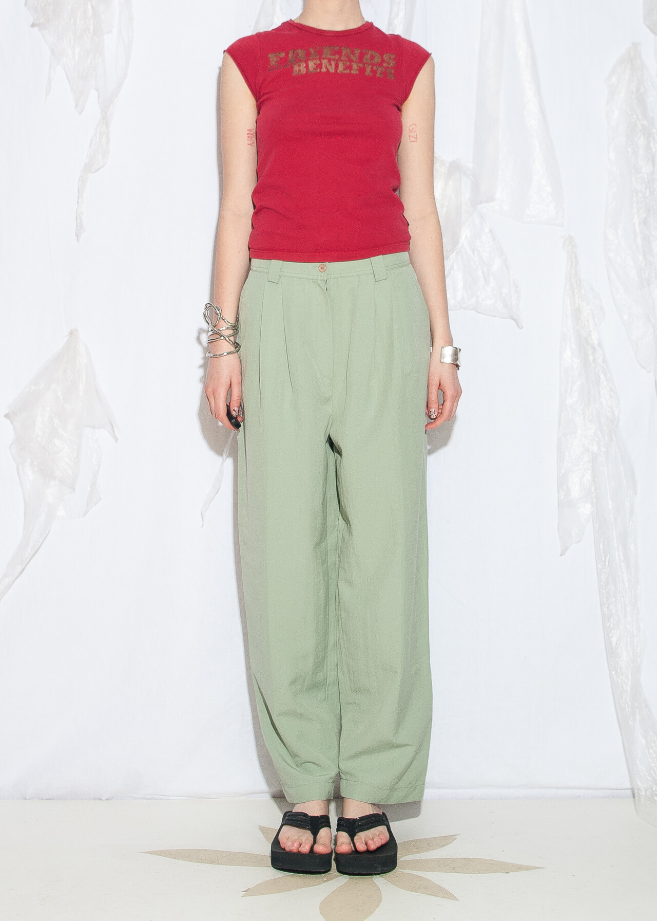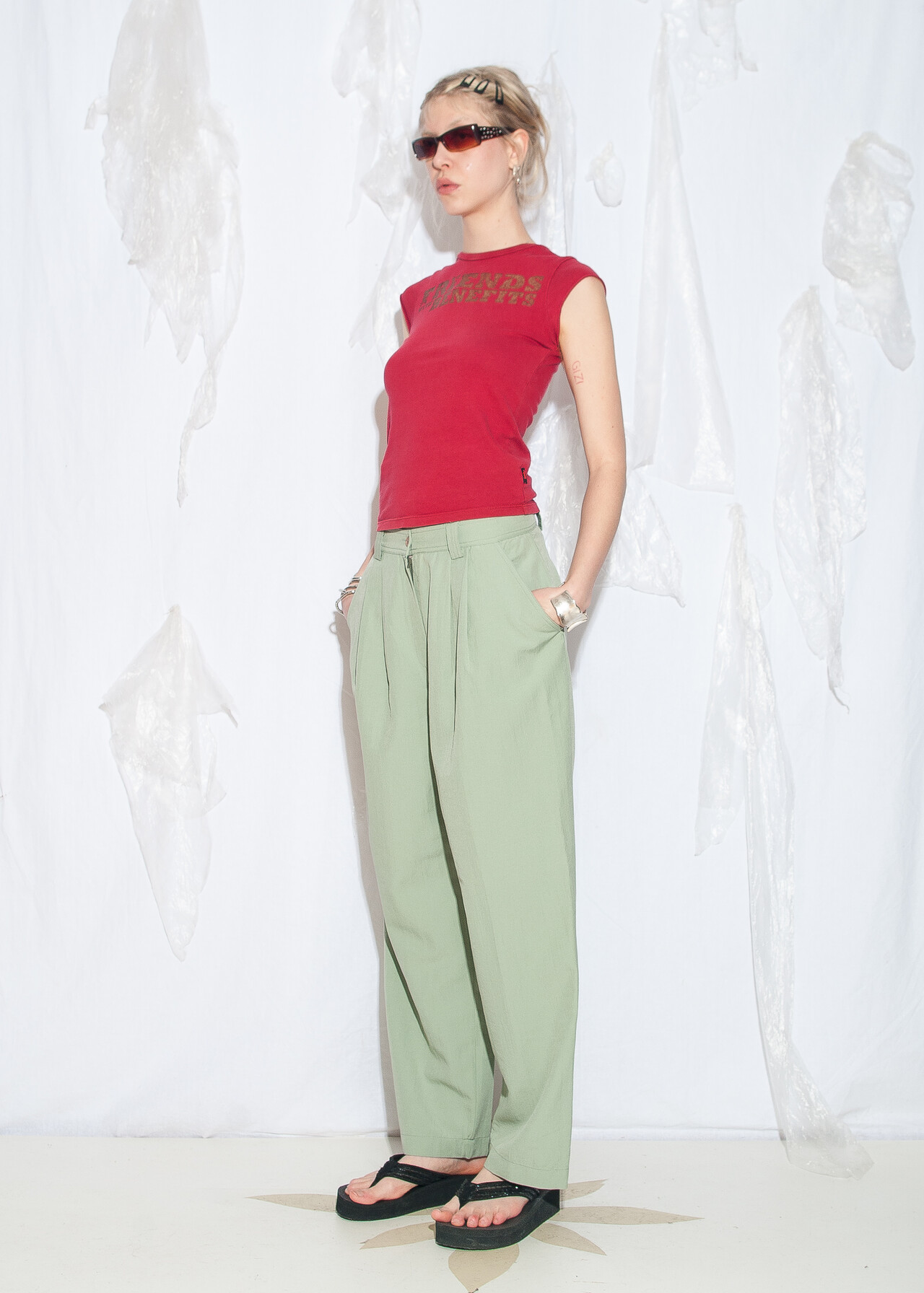 These 90s vintage trousers are the ultimate mint dream, with a pleated waist and a carrot style that’ll have you feeling like a real fashionista. Made from natural fabric, these barrel pants are basically a time machine back to the era of dial-up and funky beats.