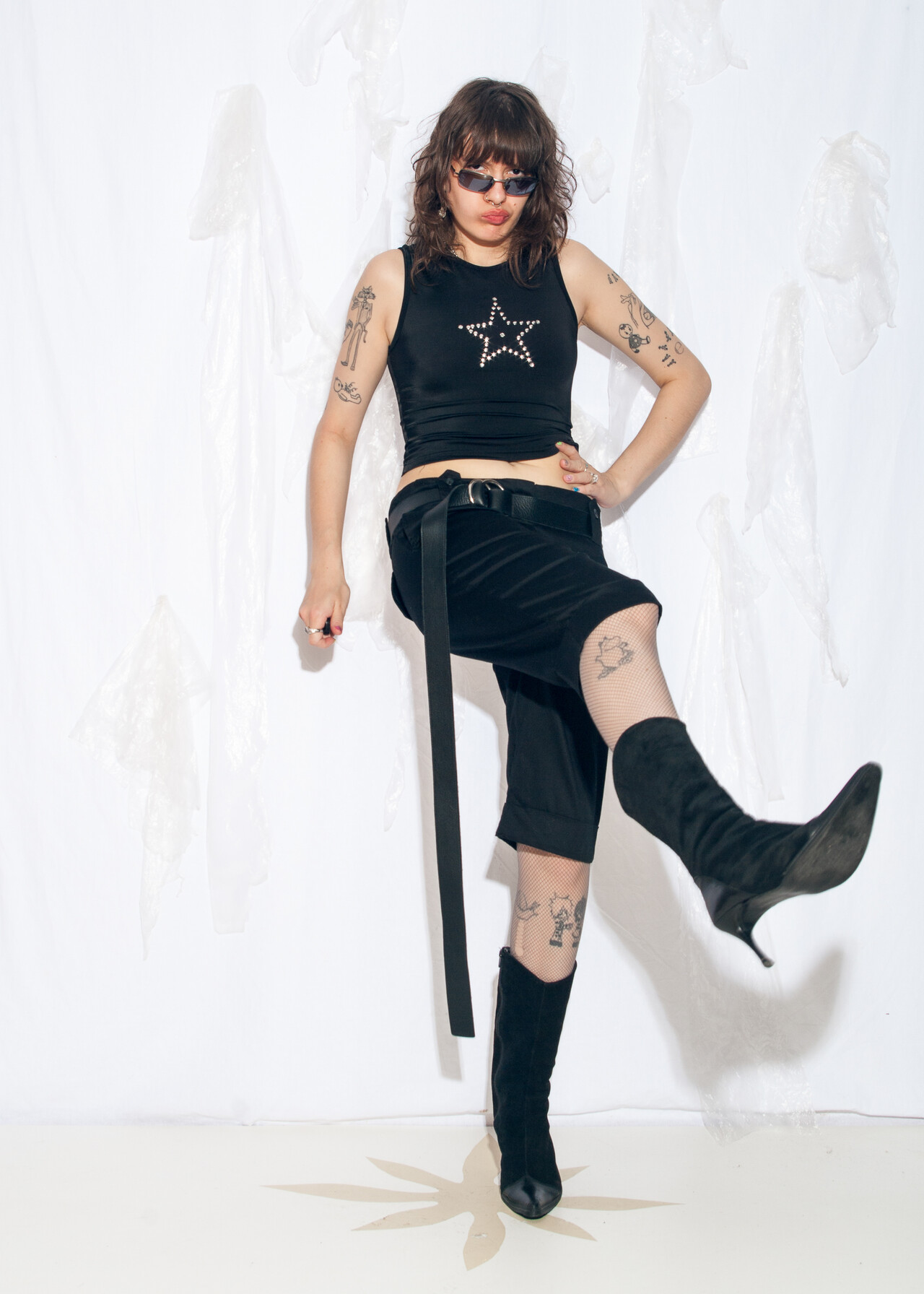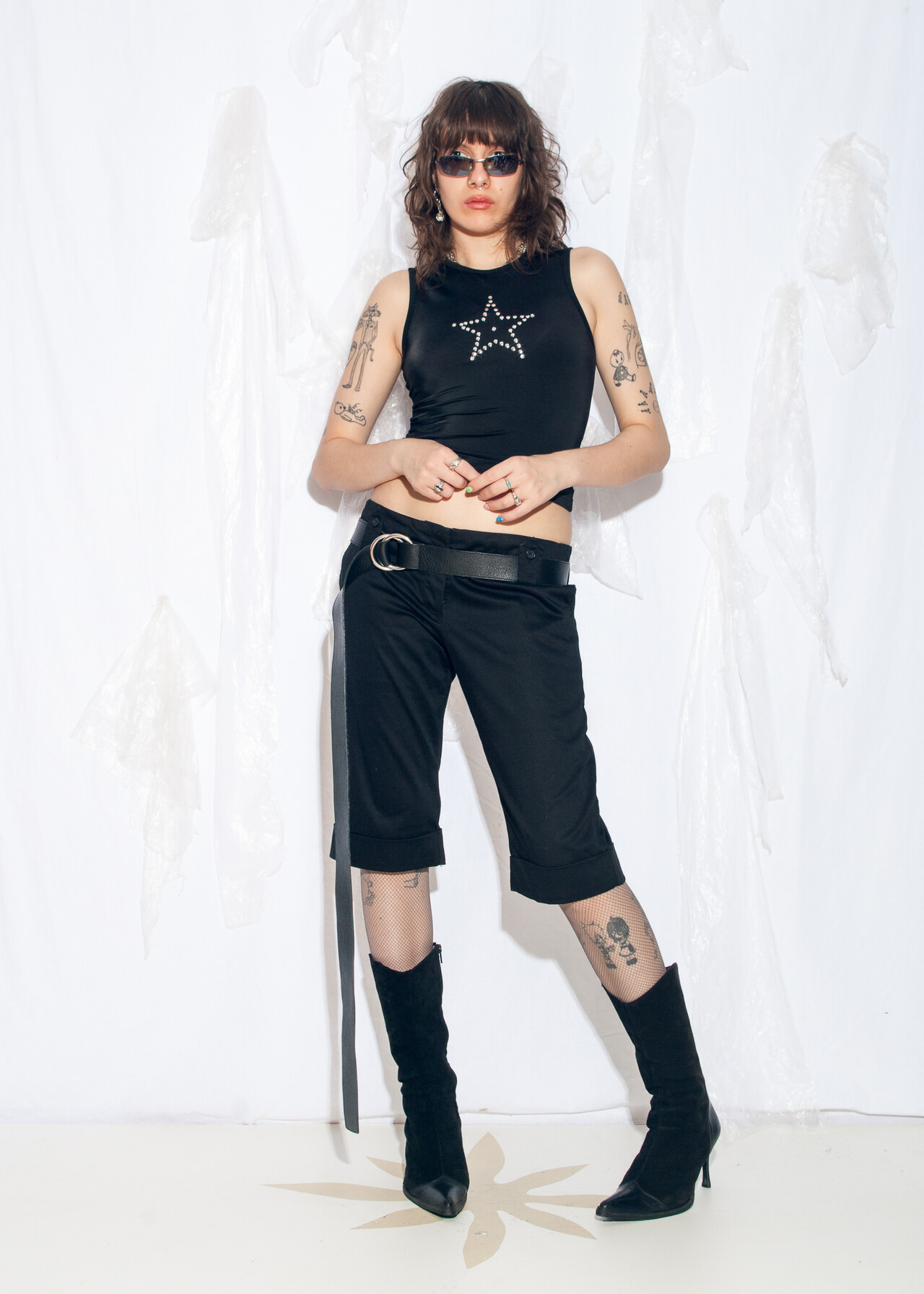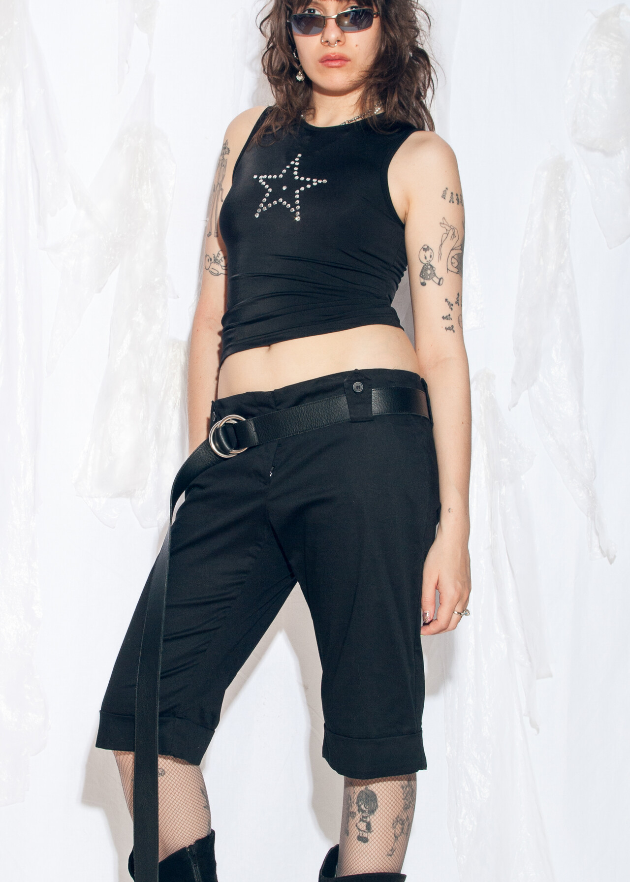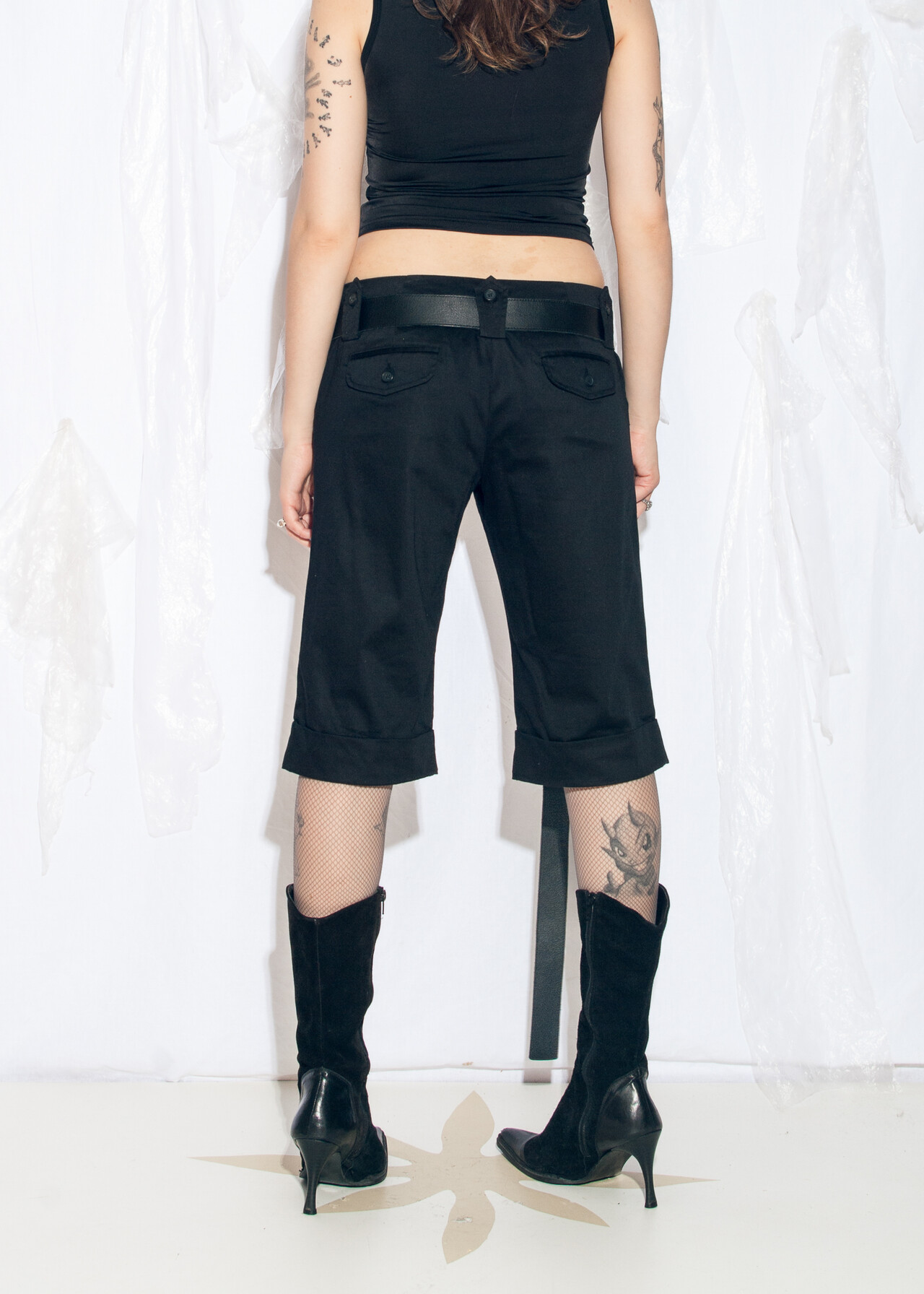 Tags: 2000s style clothing, black cotton pants, capri trousers, low rise waist, office siren, short business pants, y2k grunge outfit, y2k vintage fashion