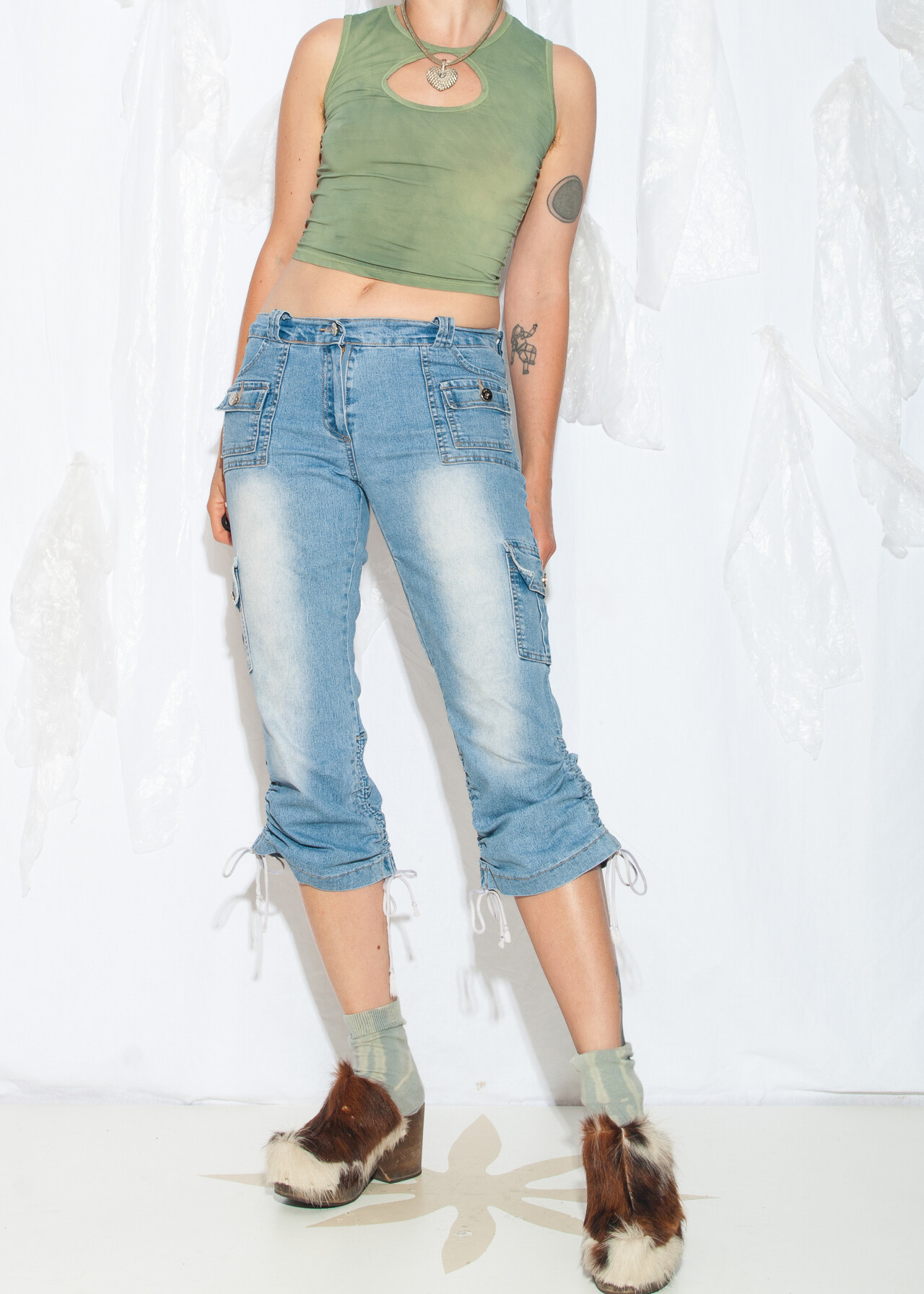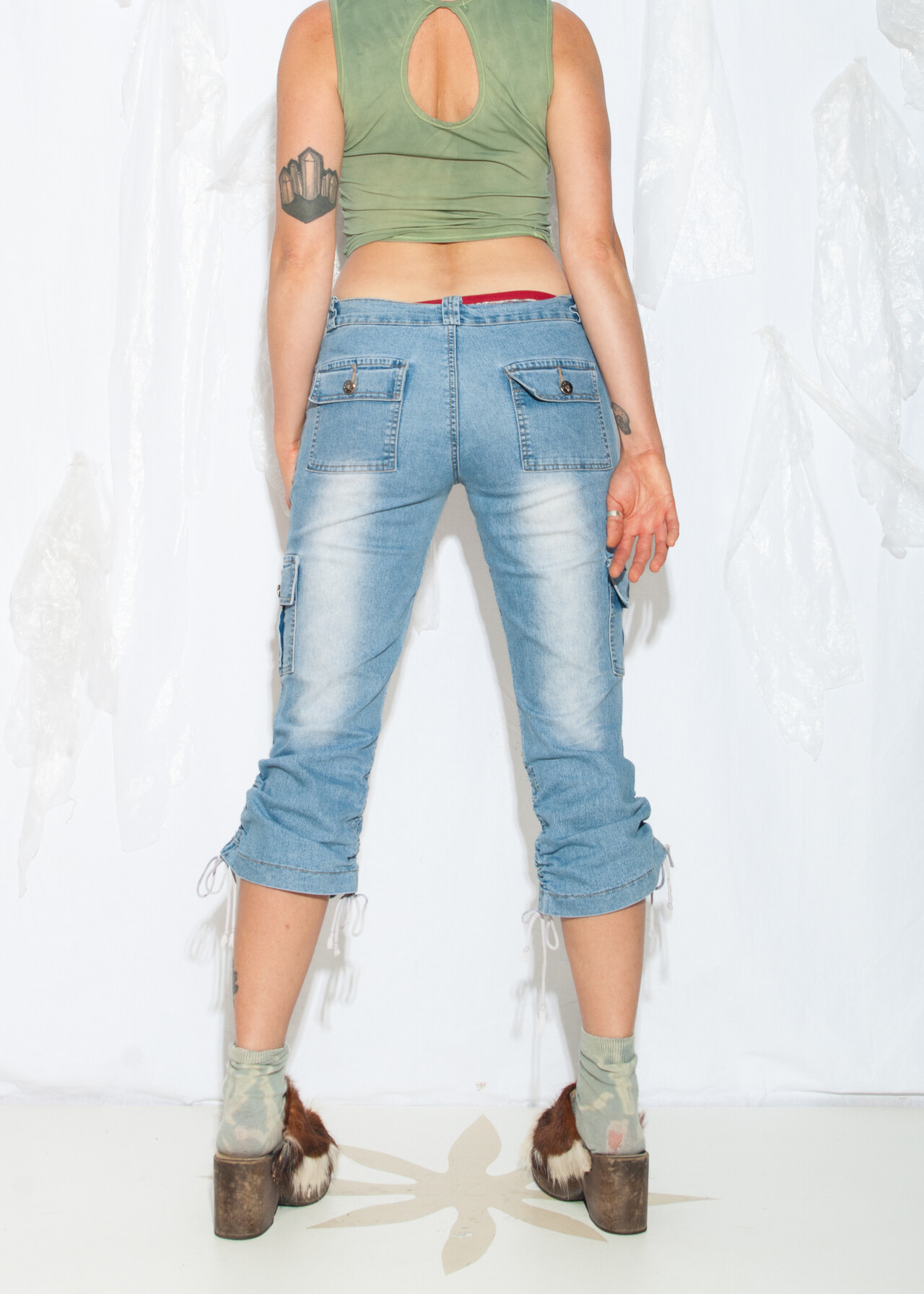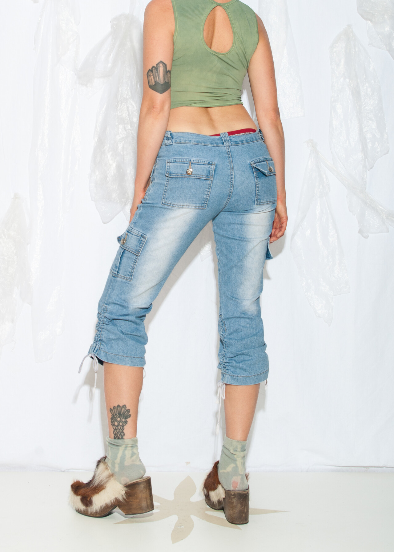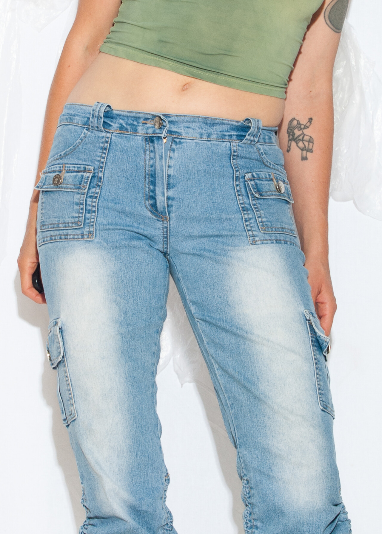 Tags: 2000s style clothing, capri jeans, cargo shorts, low rise waist, middle rise waist, ruched leg, stonewashed denim, techno cowboy outfit, y2k vintage fashion