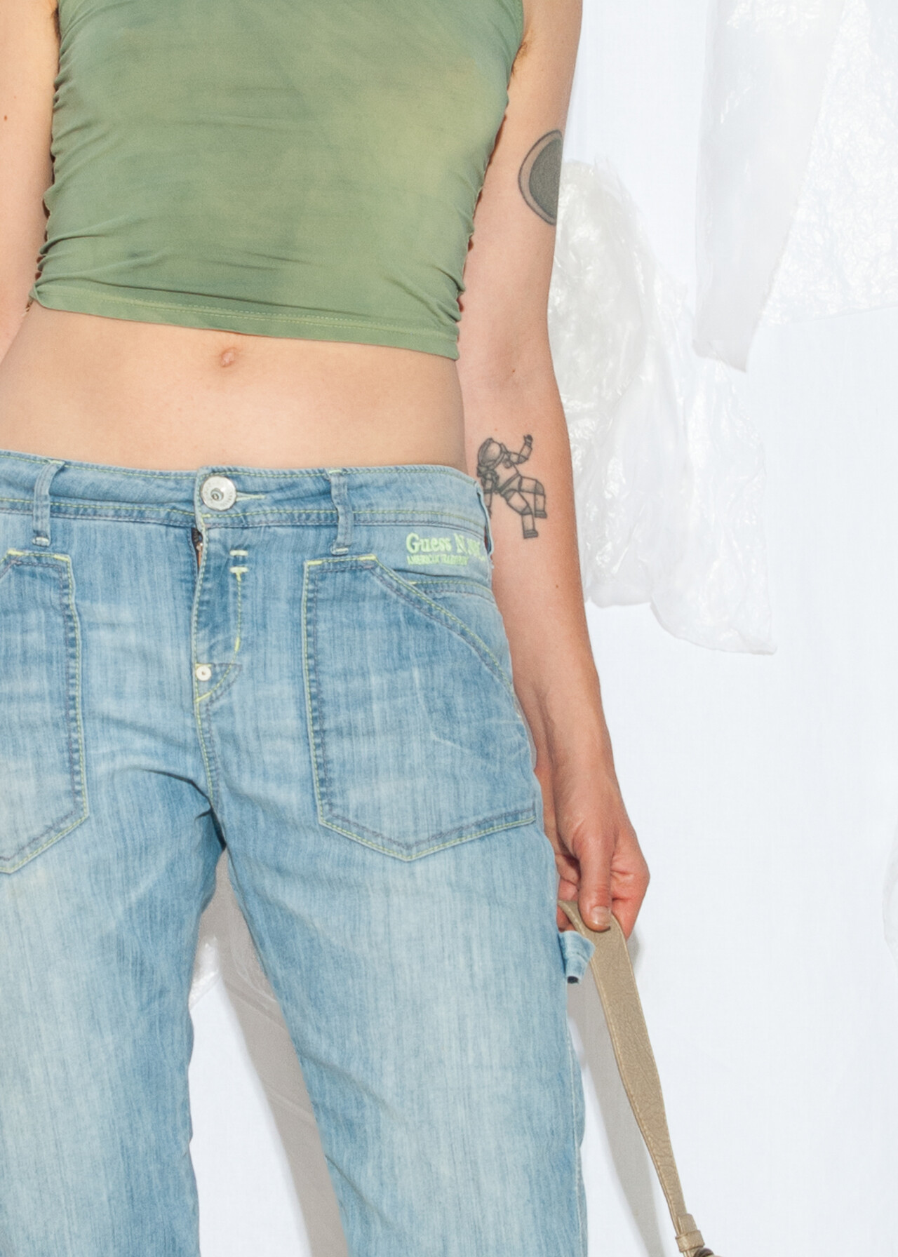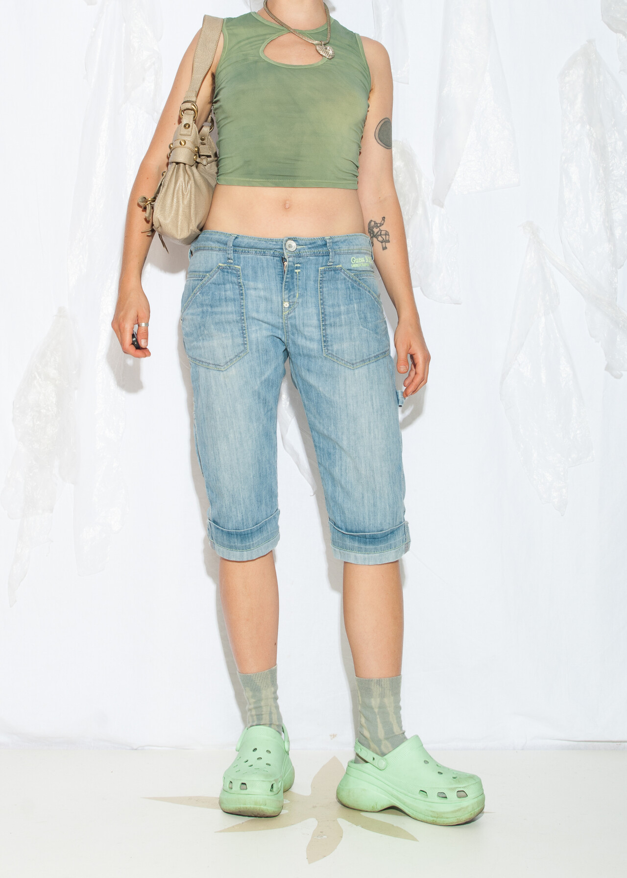 Tags: 2000s style clothing, capri jeans, cargo pants, Guess Jeans, low rise waist, short trousers, stonewashed denim, y2k vintage fashion