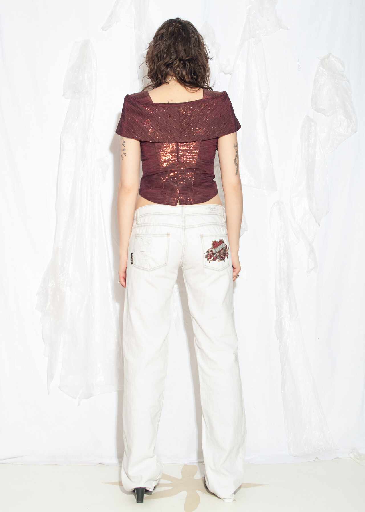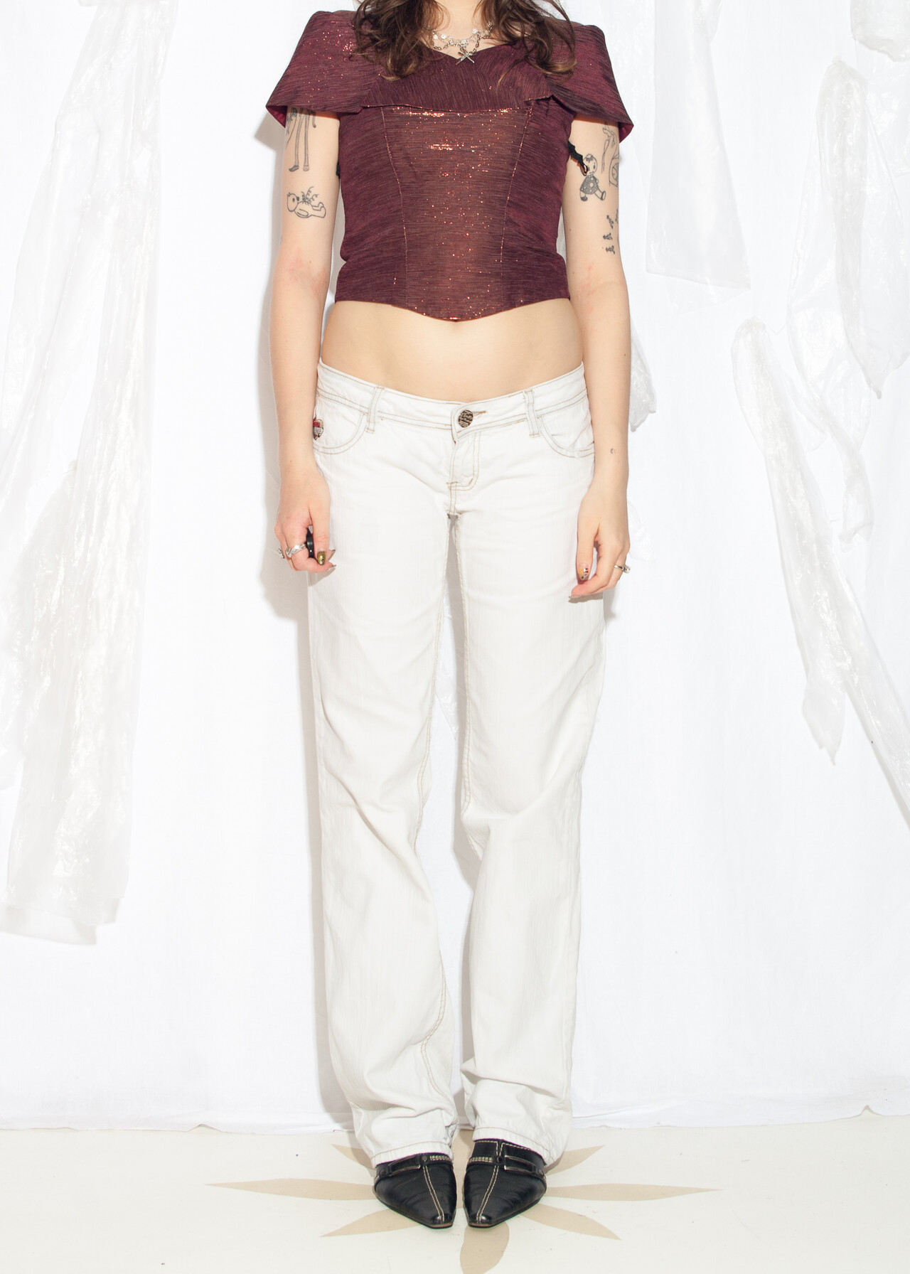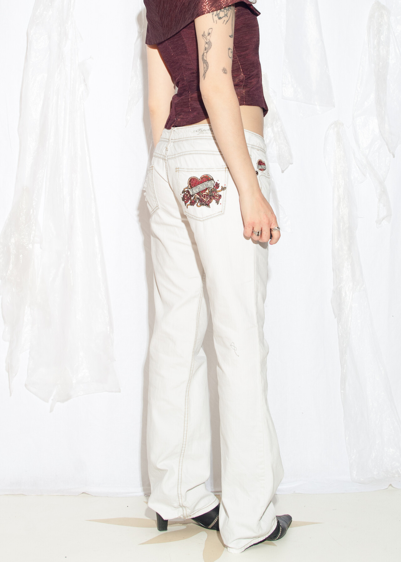 Tags: 2000s style clothing, low rise flare jeans, tattoo embroidery, white denim pants, y2k vintage fashion