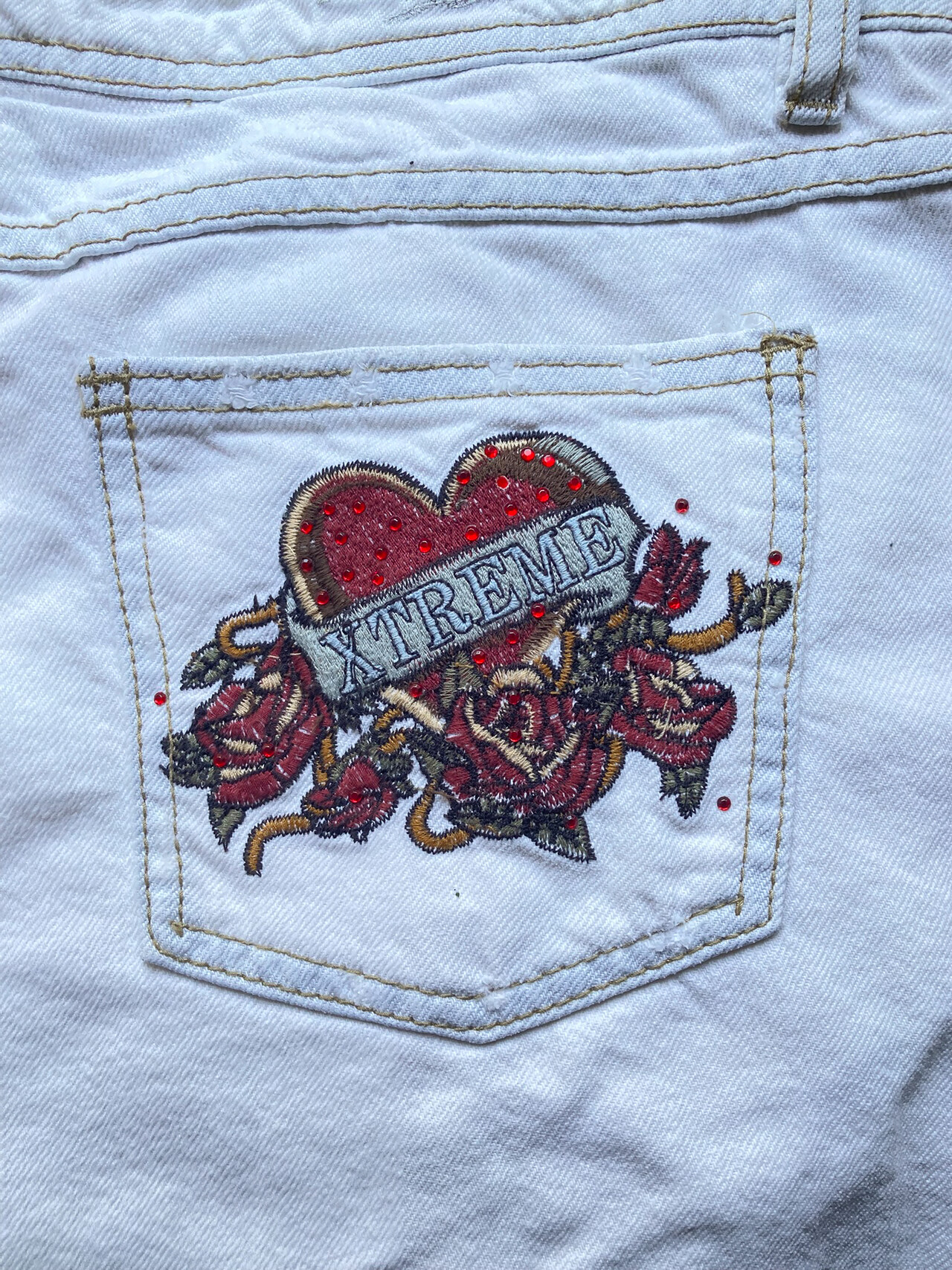 These Y2K vintage low rise flare jeans are like wearing a time capsule from the era when tattoo embroidery and white denim pants ruled the fashion scene.