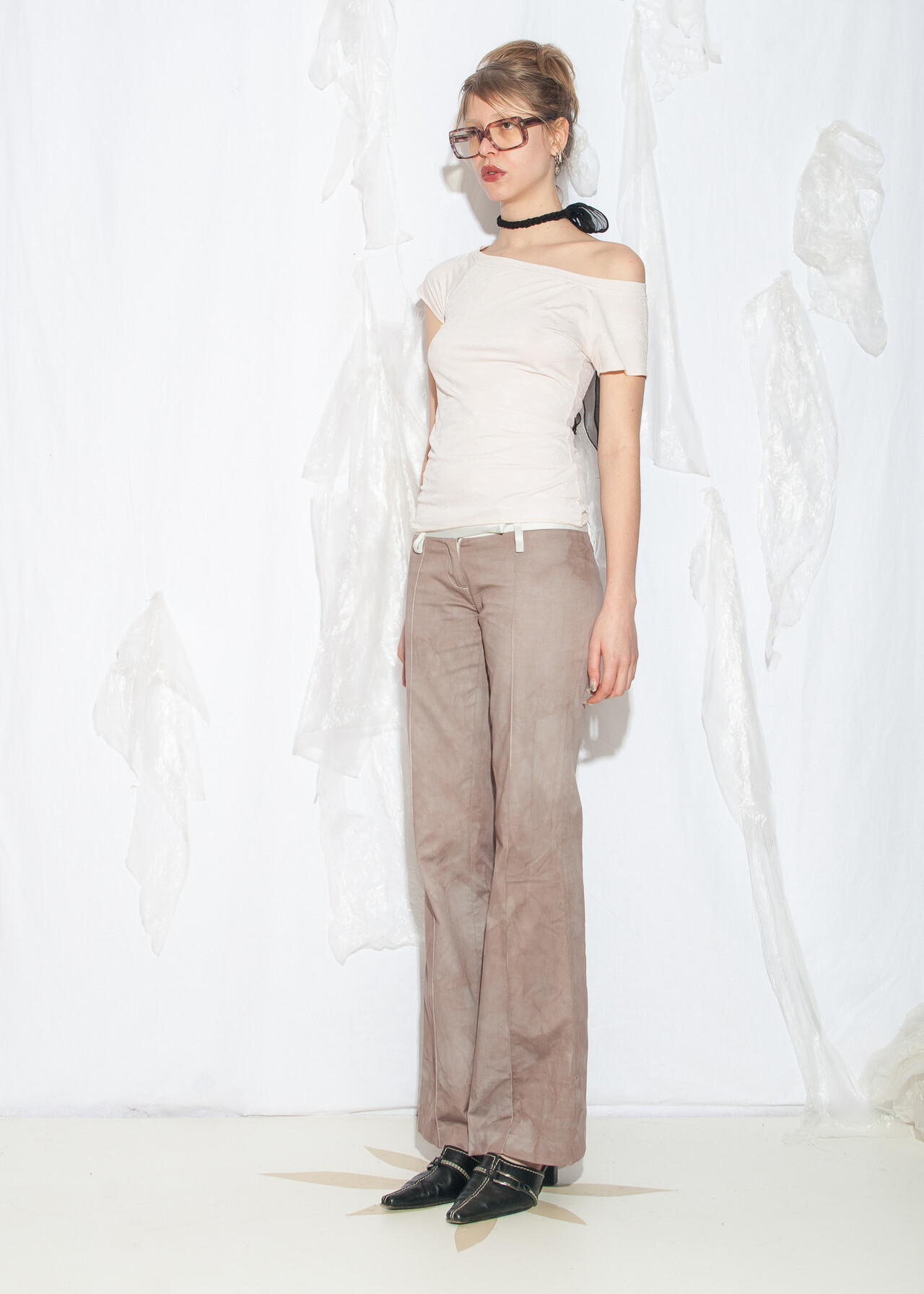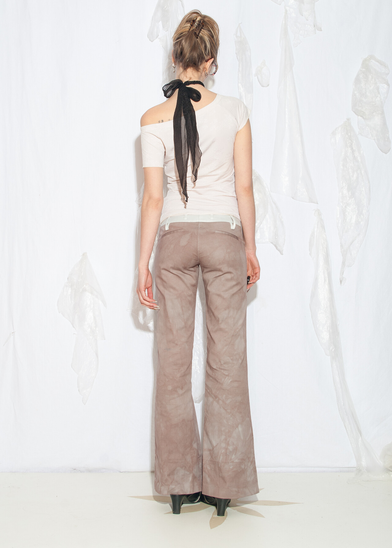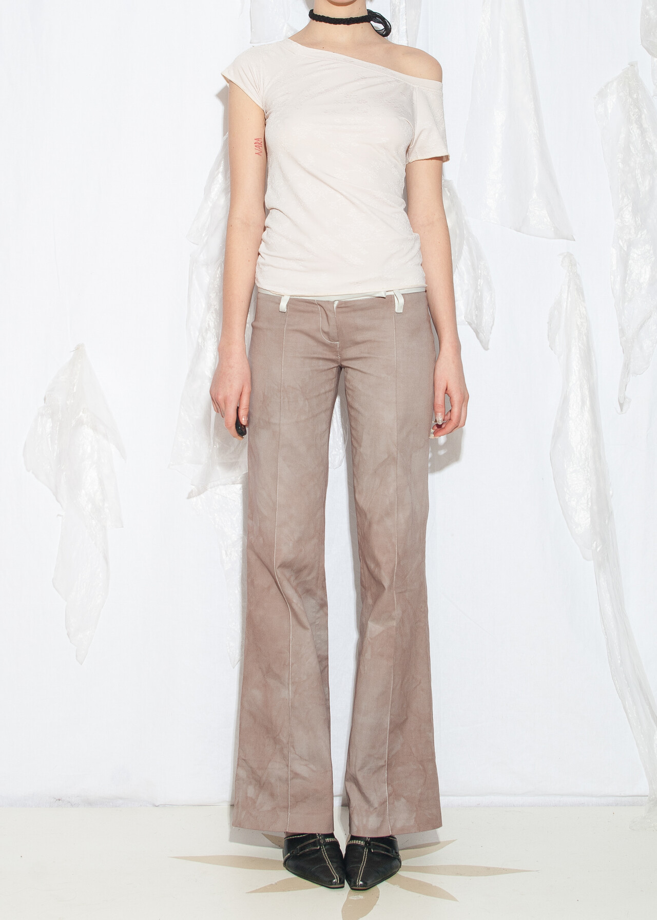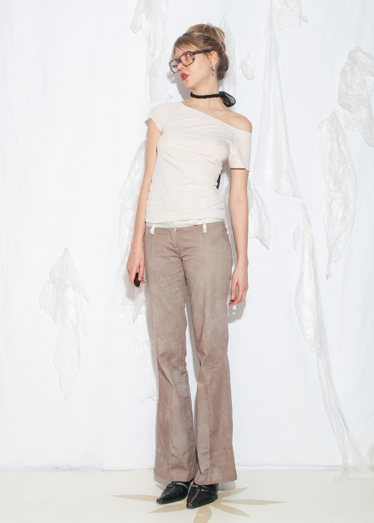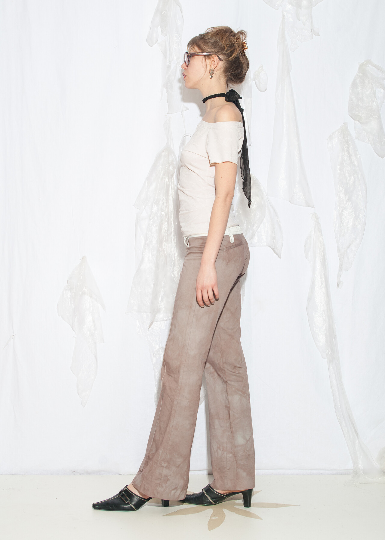 Tags: 2000s style fashion, cute coquette, low rise pants, low waisted trousers, overdyed brown, reworked, satin waist, y2k vintage clothing
