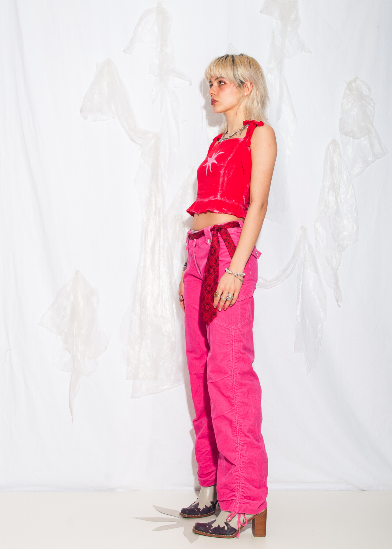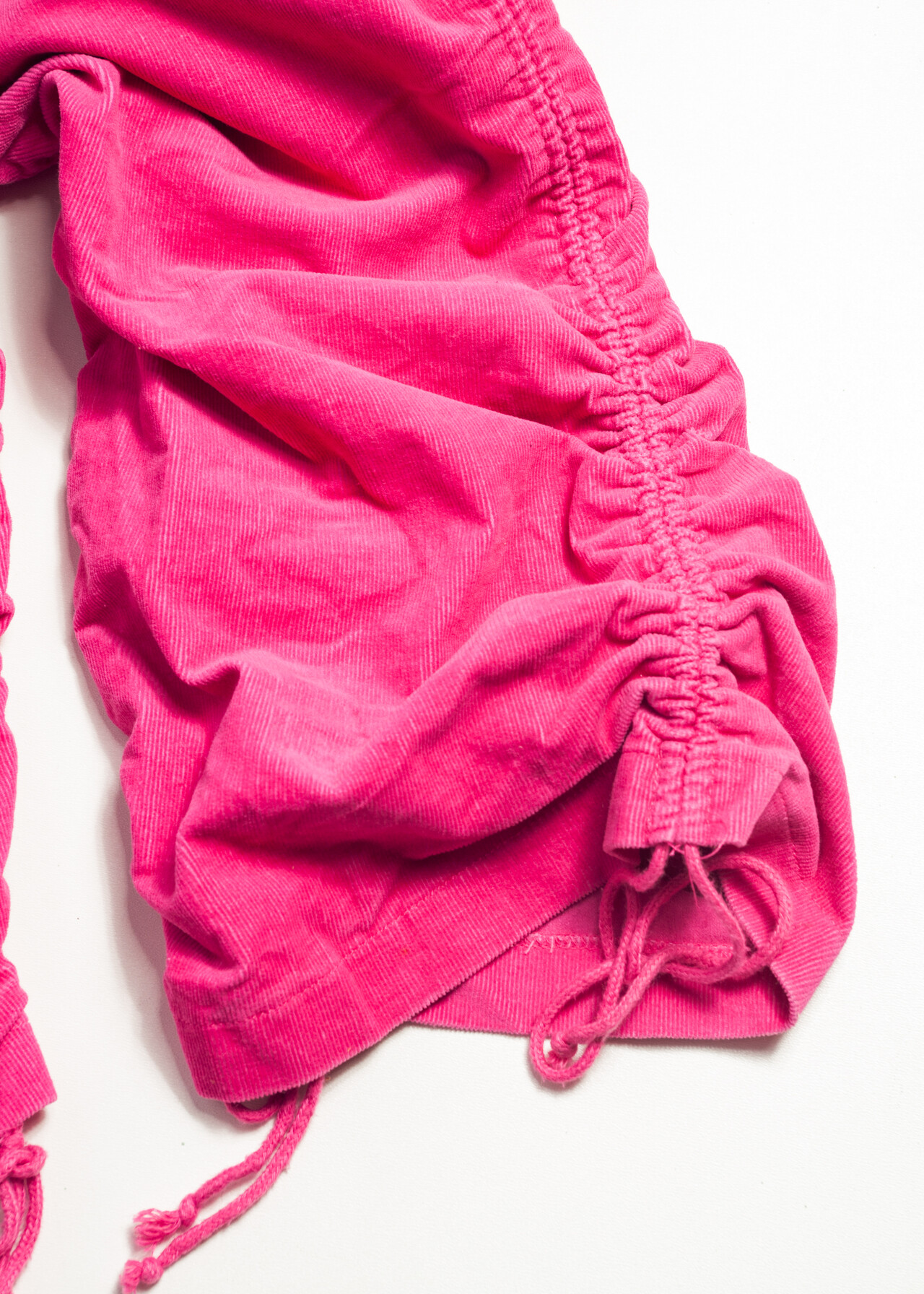 Tags: 2000s style clothing, flare trousers, kidcore aesthetic, pink parachute pants, ruched leg detail, whimsi twee, wide leg pants, y2k vintage fashion