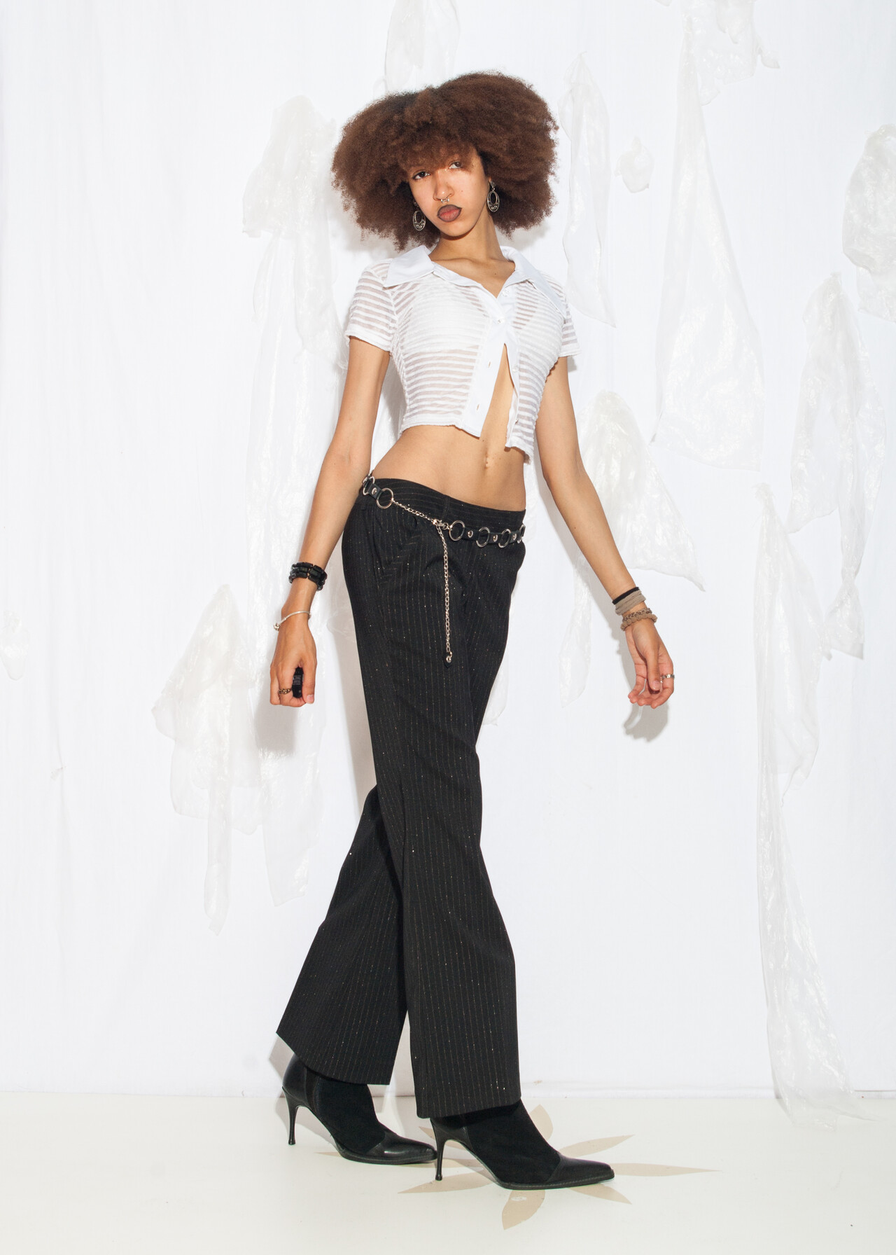 Tags: 2000s style clothing, flare trousers, low rise bottoms, low waisted pants, office siren, officecore aesthetic, pinstriped suit, whimsigoth, y2k grunge outfit, y2k vintage fashion