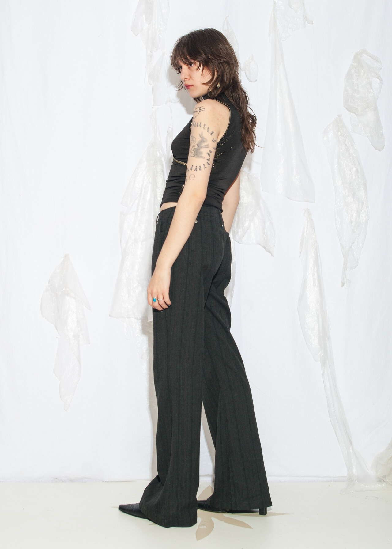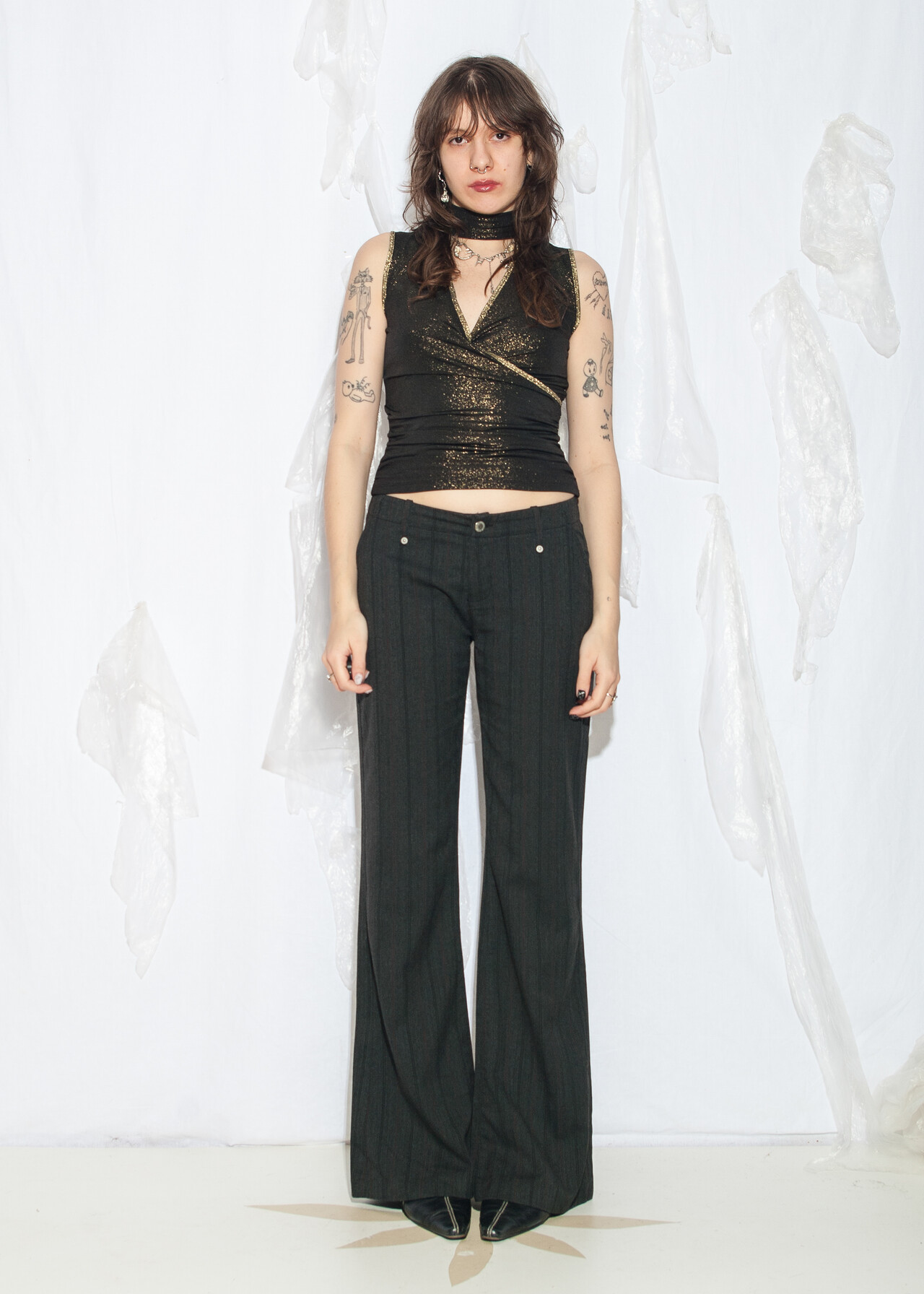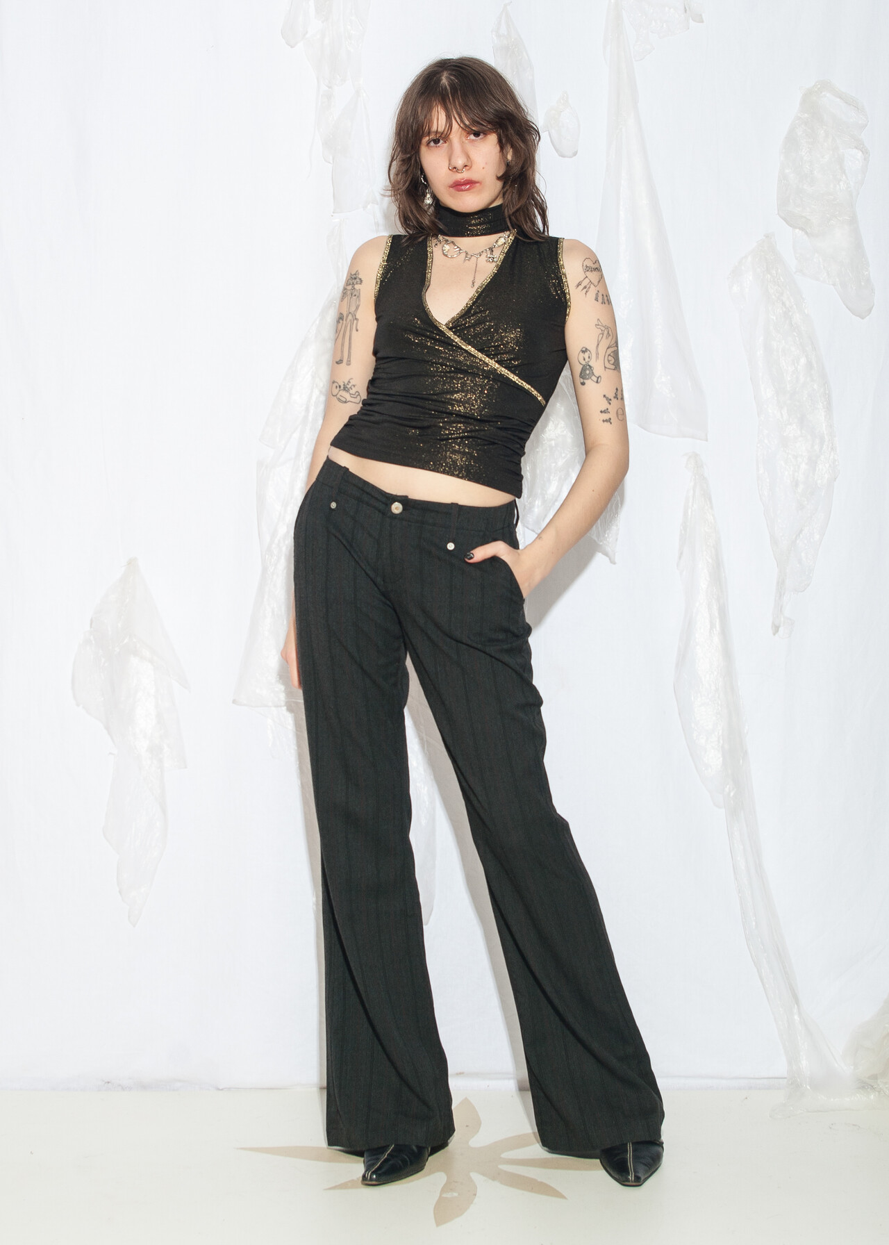 Tags: 2000s style fashion, European vintage, fishbone, flare trousers, low rise waist, office siren, pinstriped, wide leg pants, y2k vintage clothing