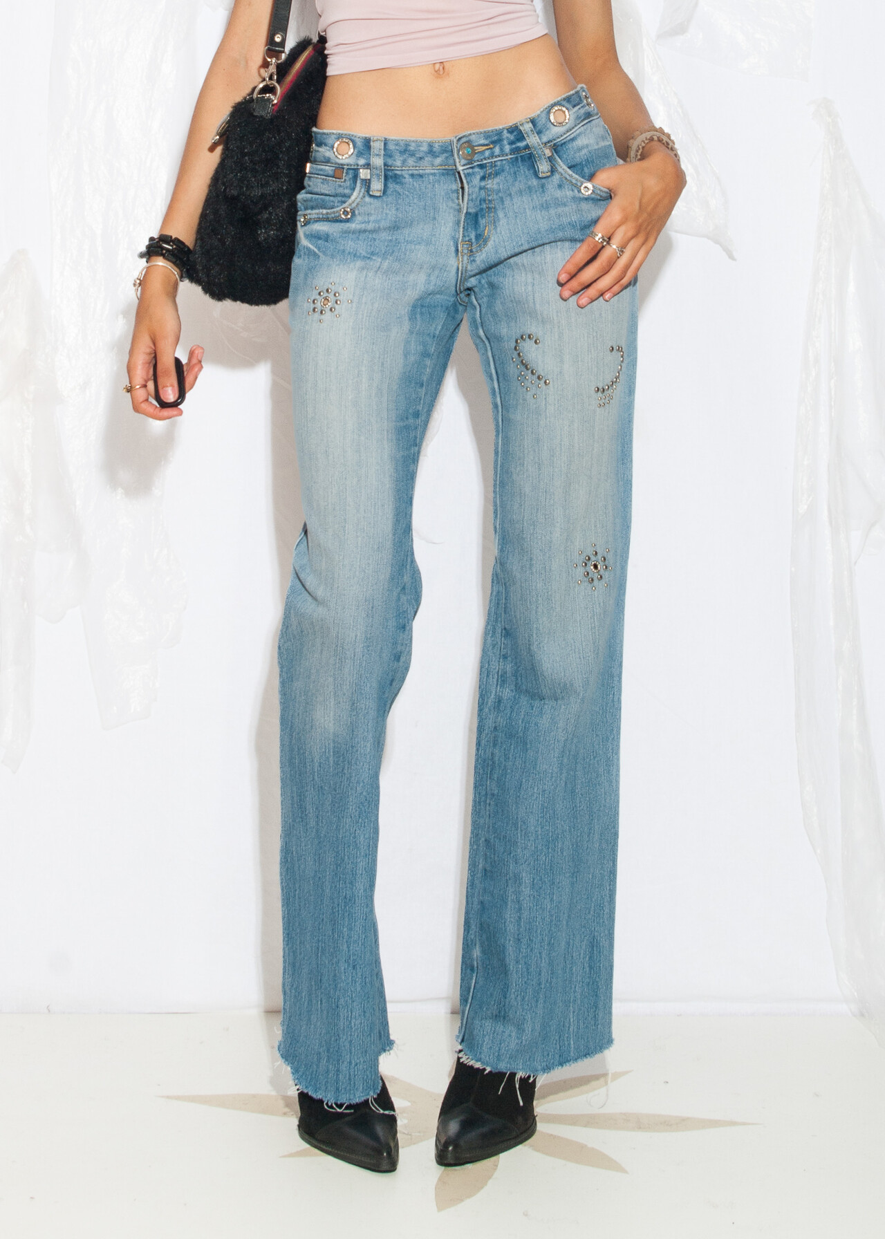 Tags: 00s streetwear, 2000s style clothing, low rise bottoms, low waisted trousers, Paris Hilton, raw hem pants, stonewashed denim, studded jeans, y2k grunge outfit, y2k vintage fashion