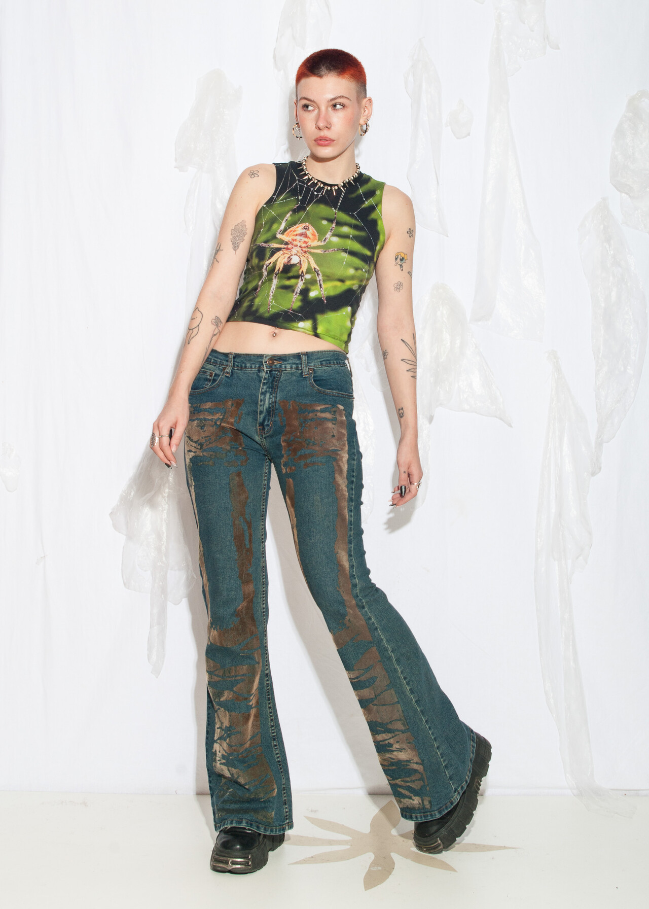 Tags: 00s streetwear, 2000s style clothing, bootcut jeans, flare denim pants, low waisted, middle rise bottoms, plush velvet printed, stretchy jeans, whimsigoth, y2k grunge outfit, y2k vintage fashion