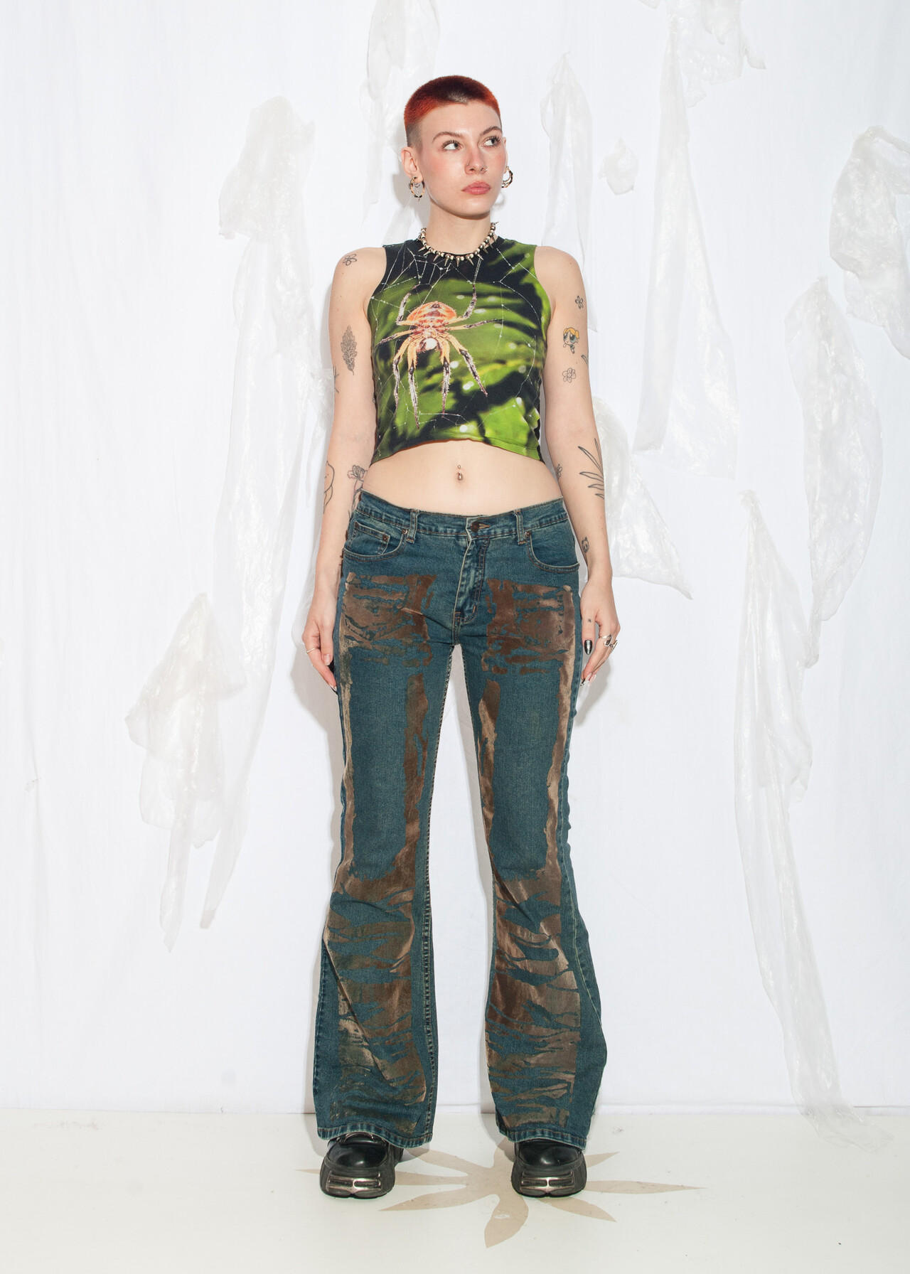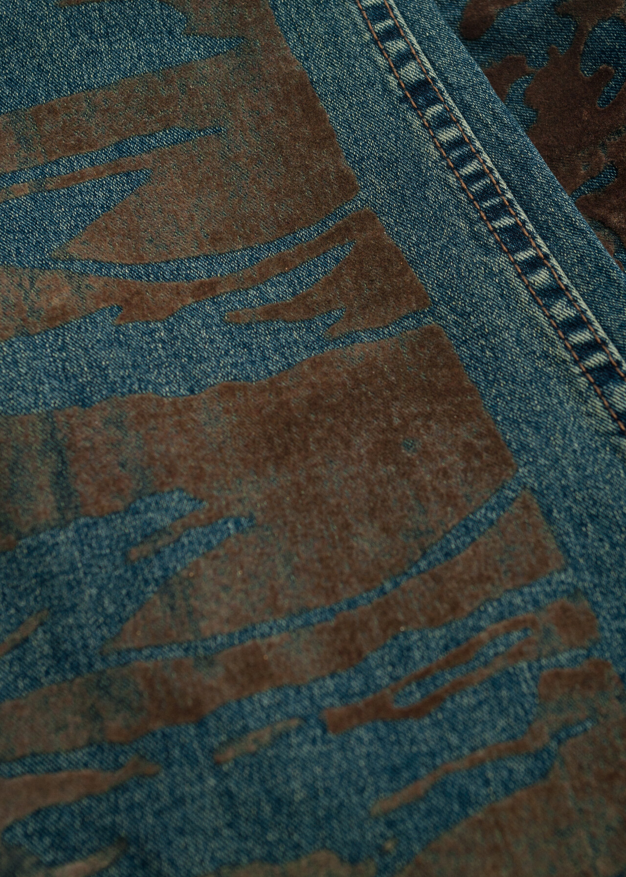 Vintage Y2K Velvet Printed Flare Jeans in Mud Brown and Blue