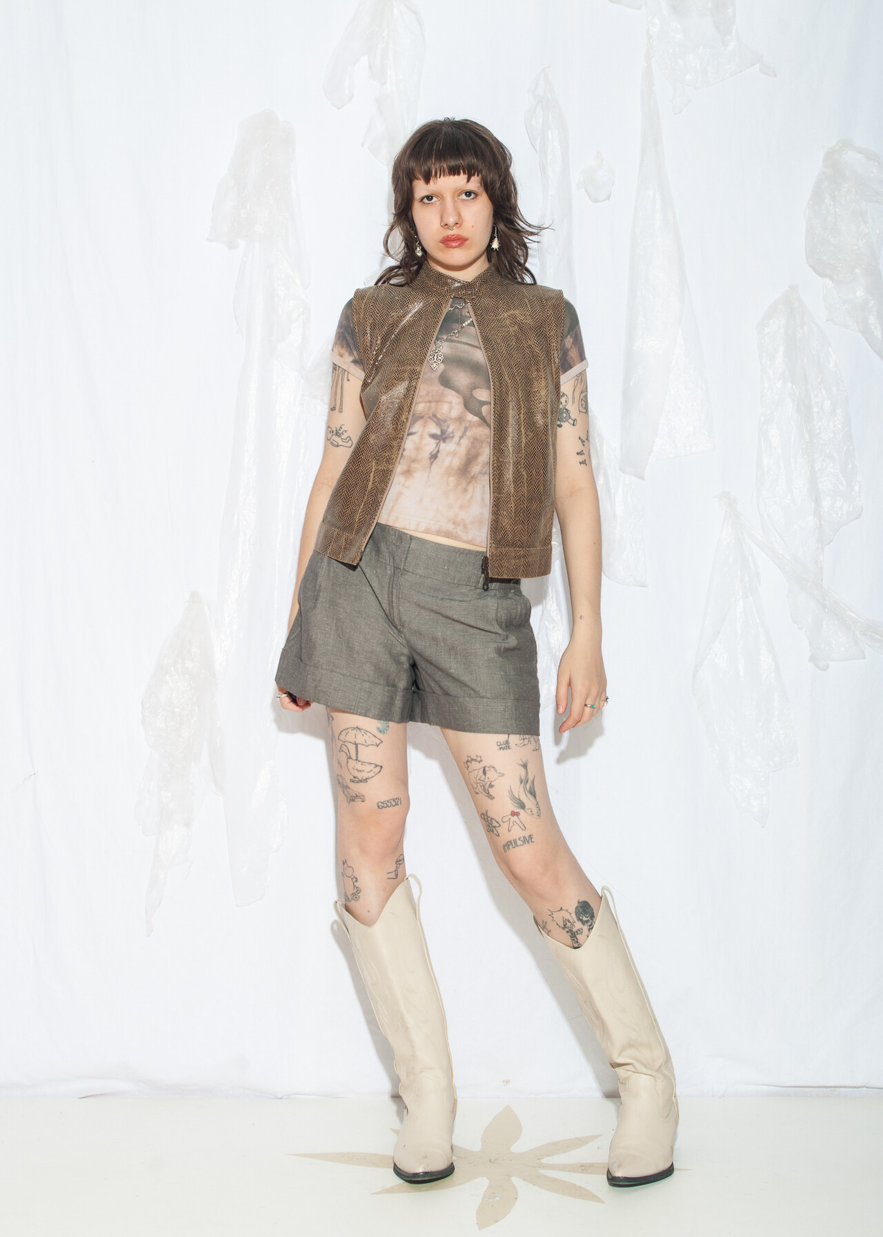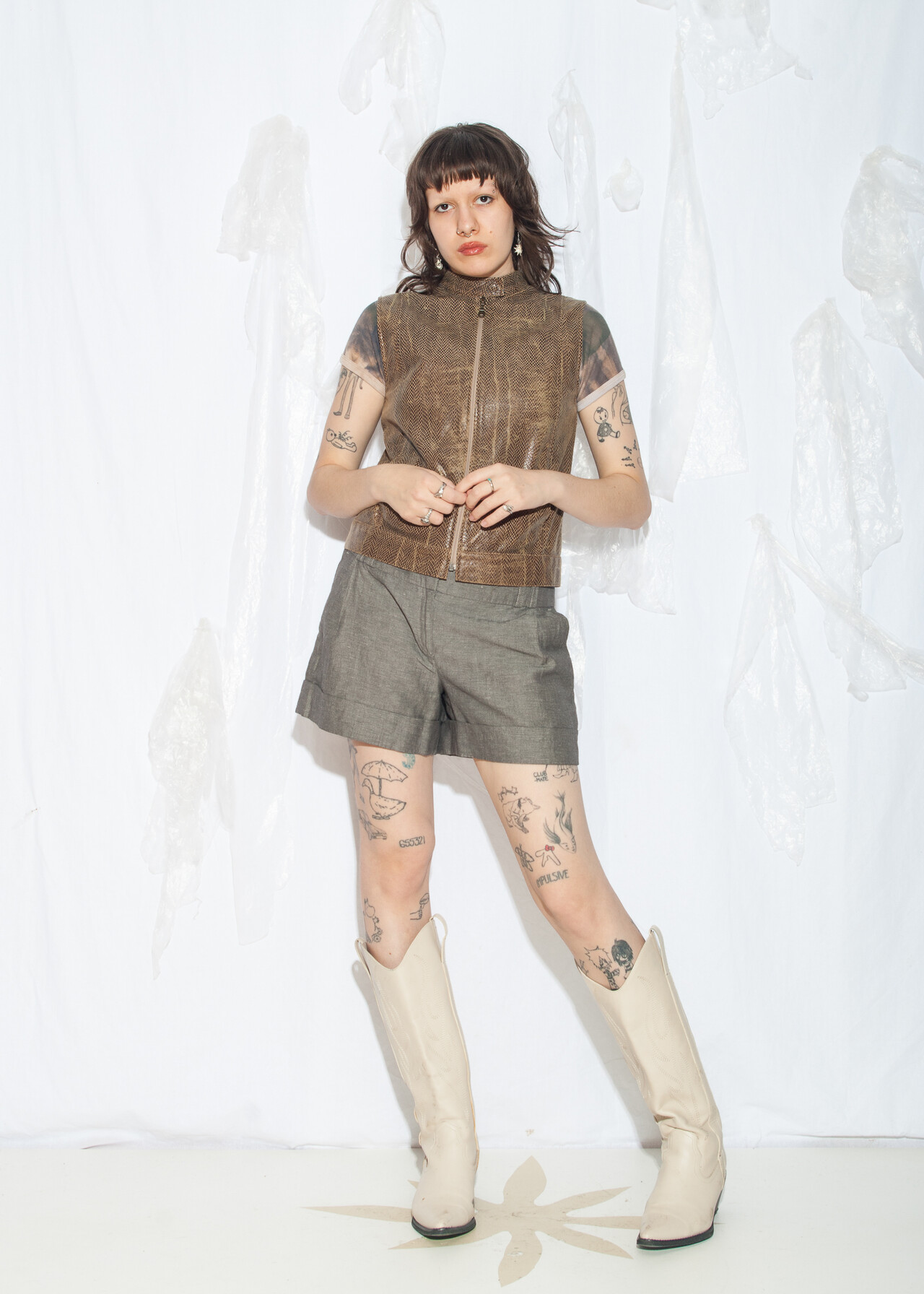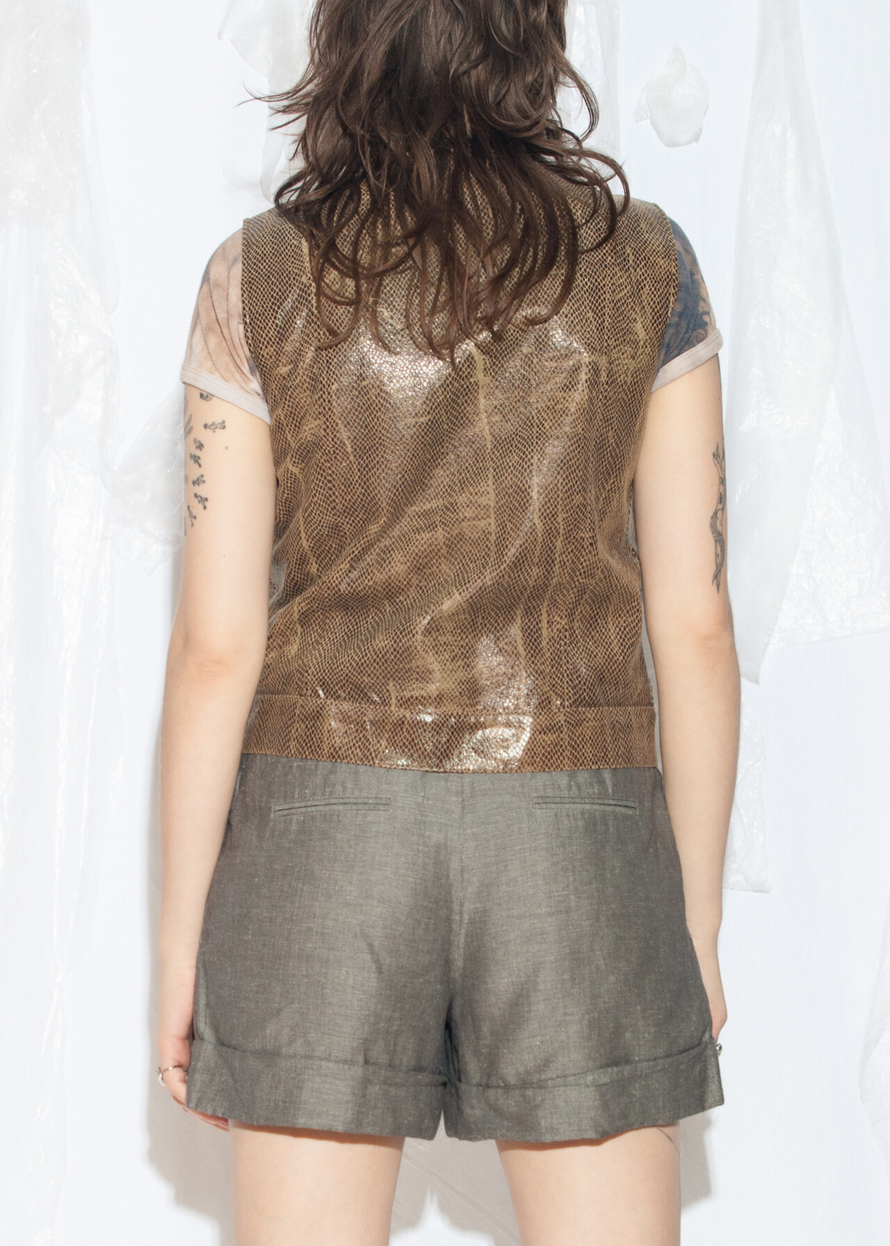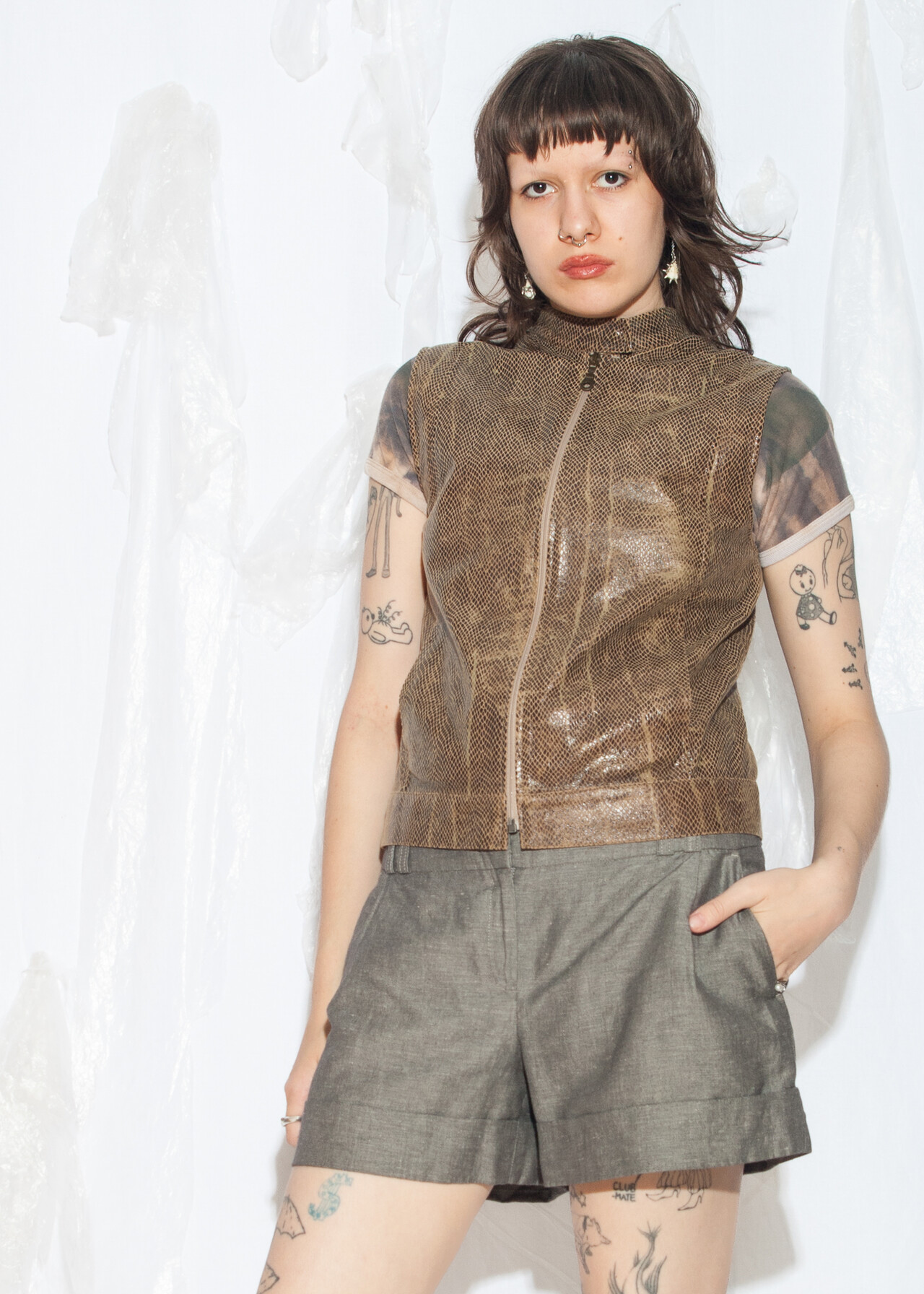 Tags: 2000s style clothing, 90s vintage fashion, faux leather, faux snake leather, slim fit vest, waistcoat, y2k grunge outfit
