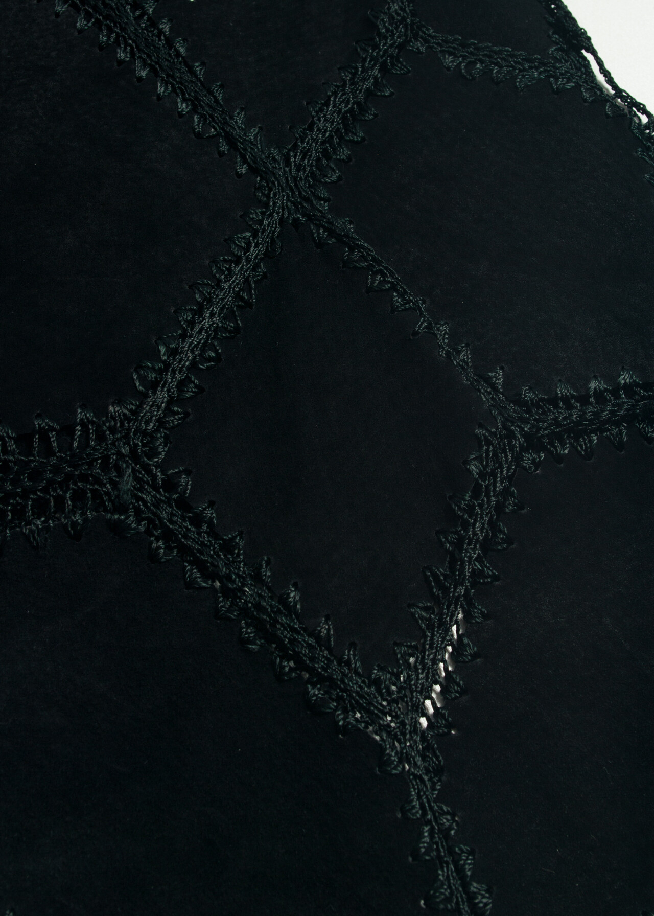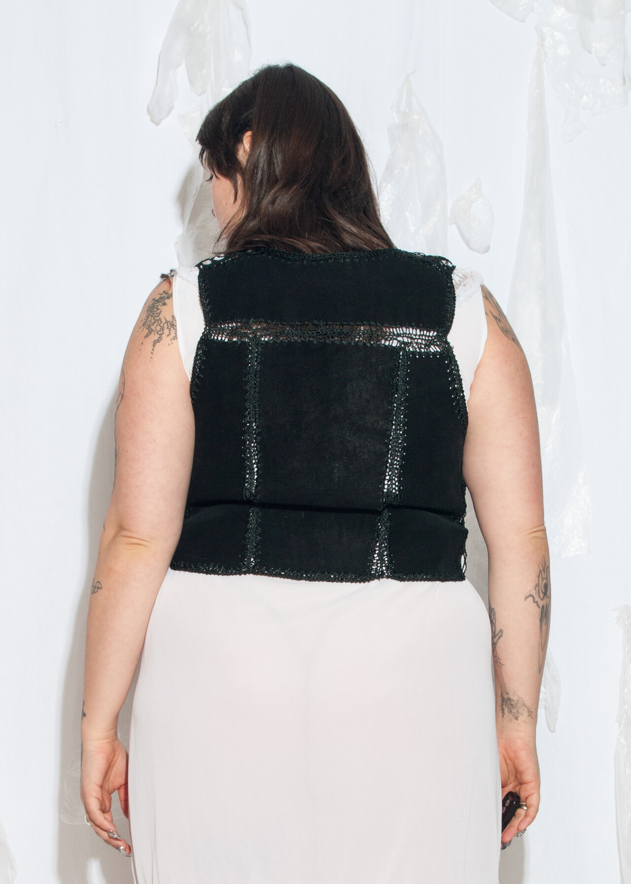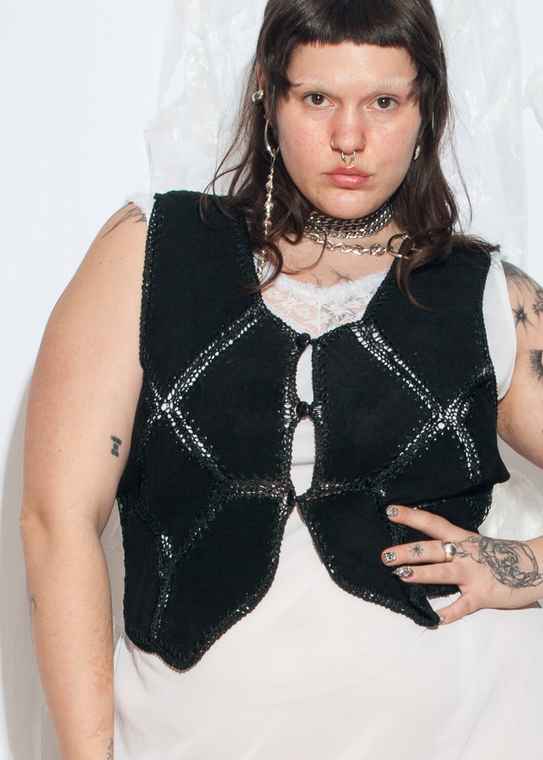 Tags: 90s vintage fashion, boho romantic, crocheted top, festival outfit, grunge look, leather vest, real suede waistcoat, whimsigoth, y2k style clothing