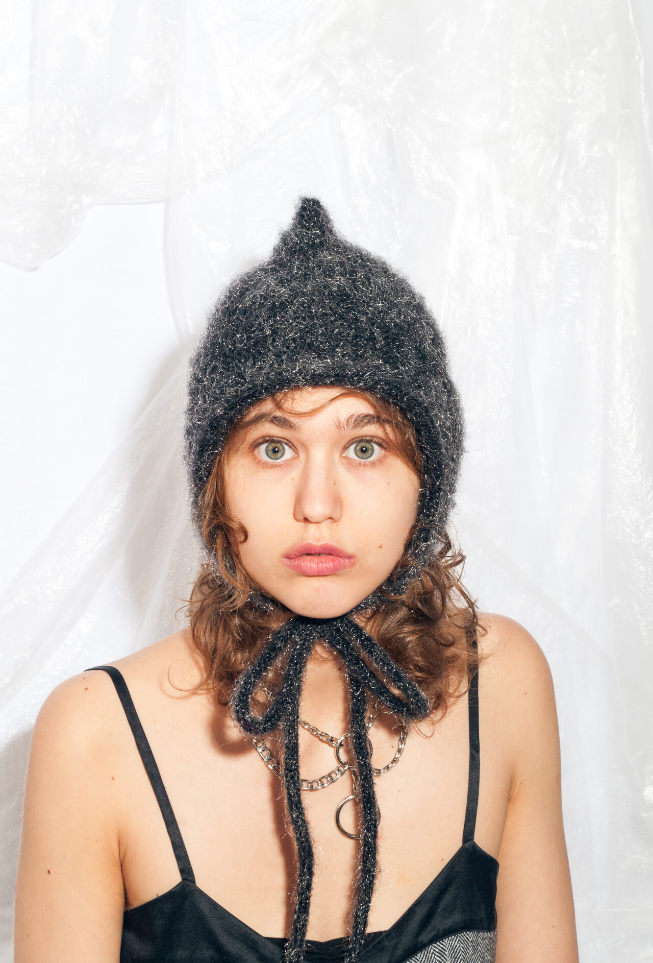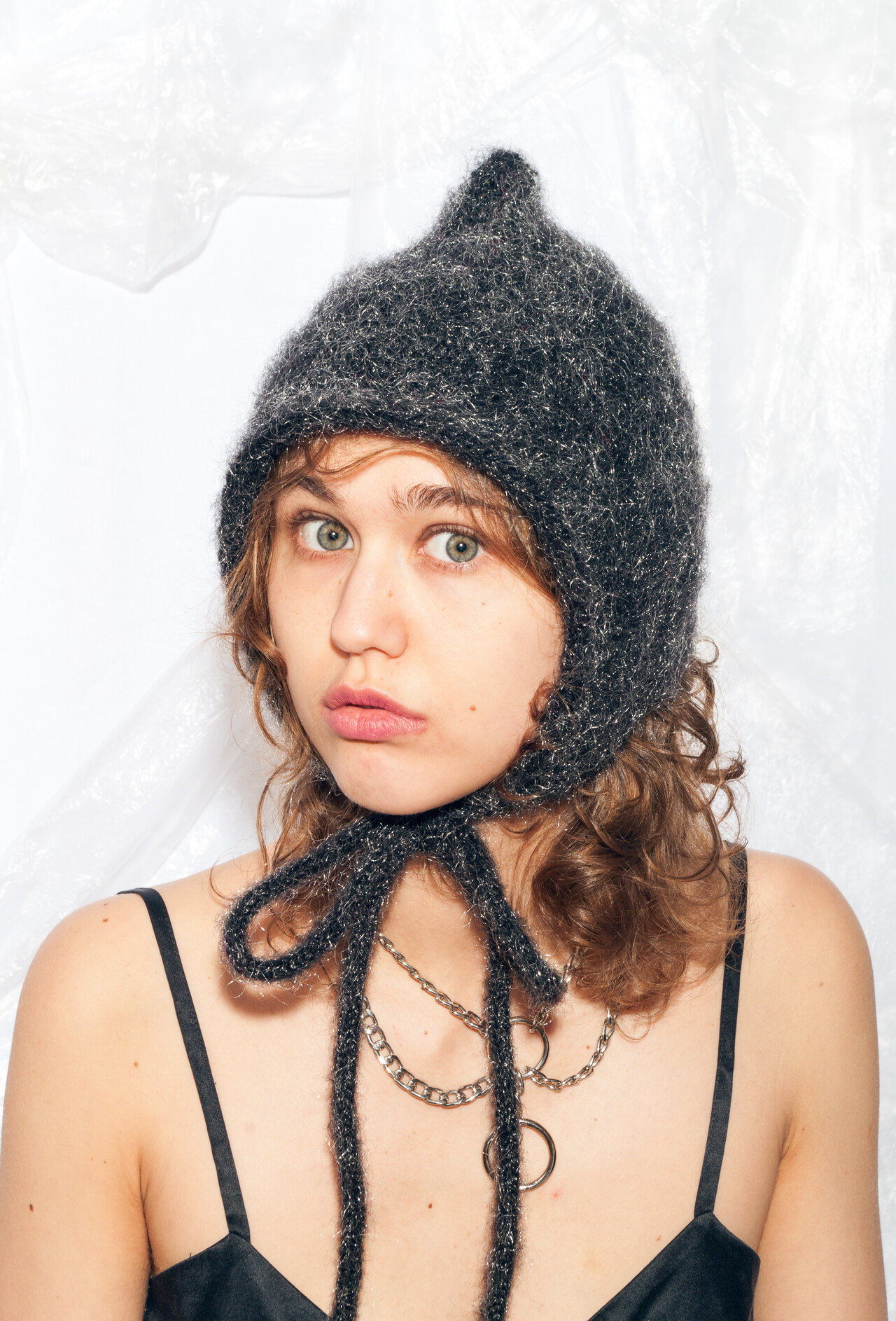 This handmade baby bonnet is the ultimate cuteness. Knitted from shimmer vintage yarn, it’s the perfect accessory for transporting yourself back to the early 2000s in style.