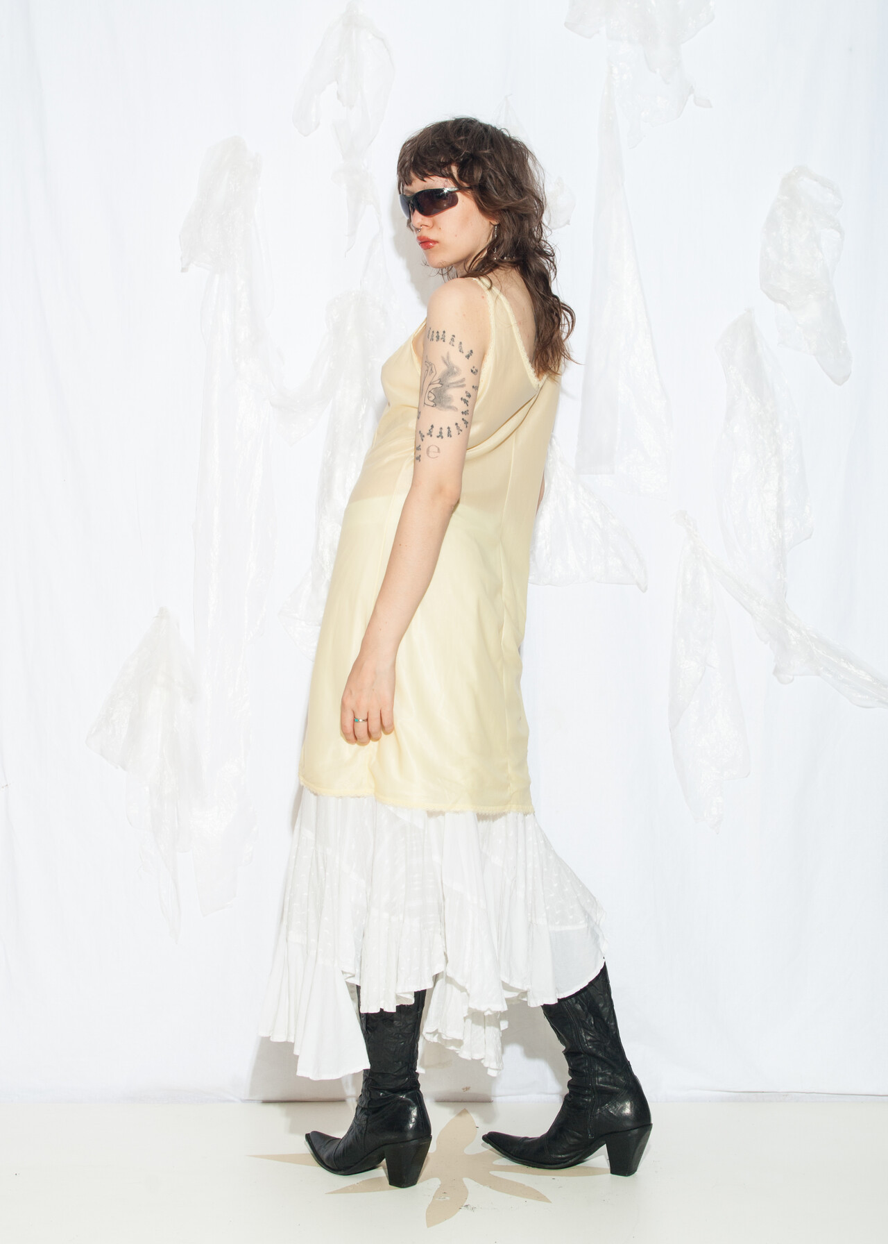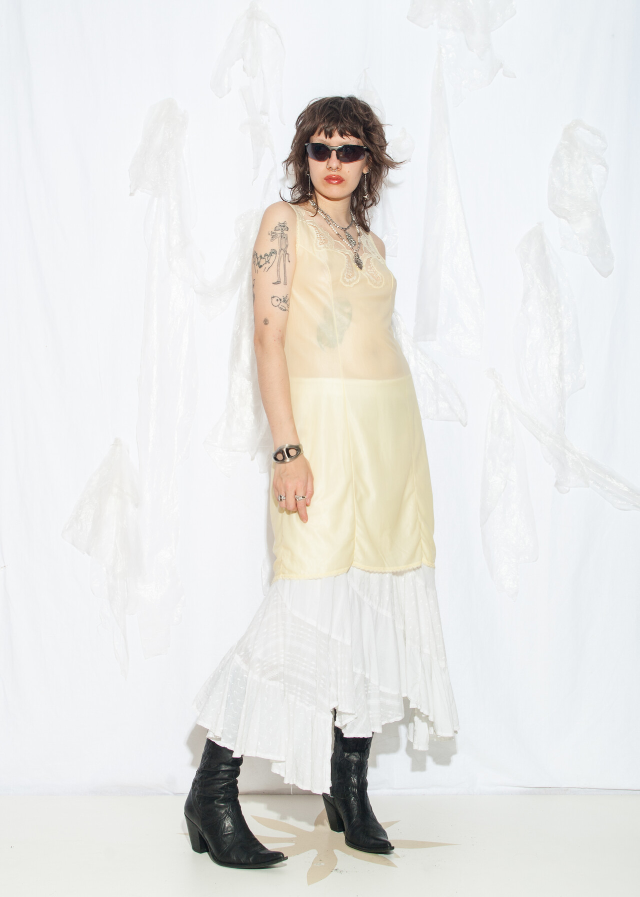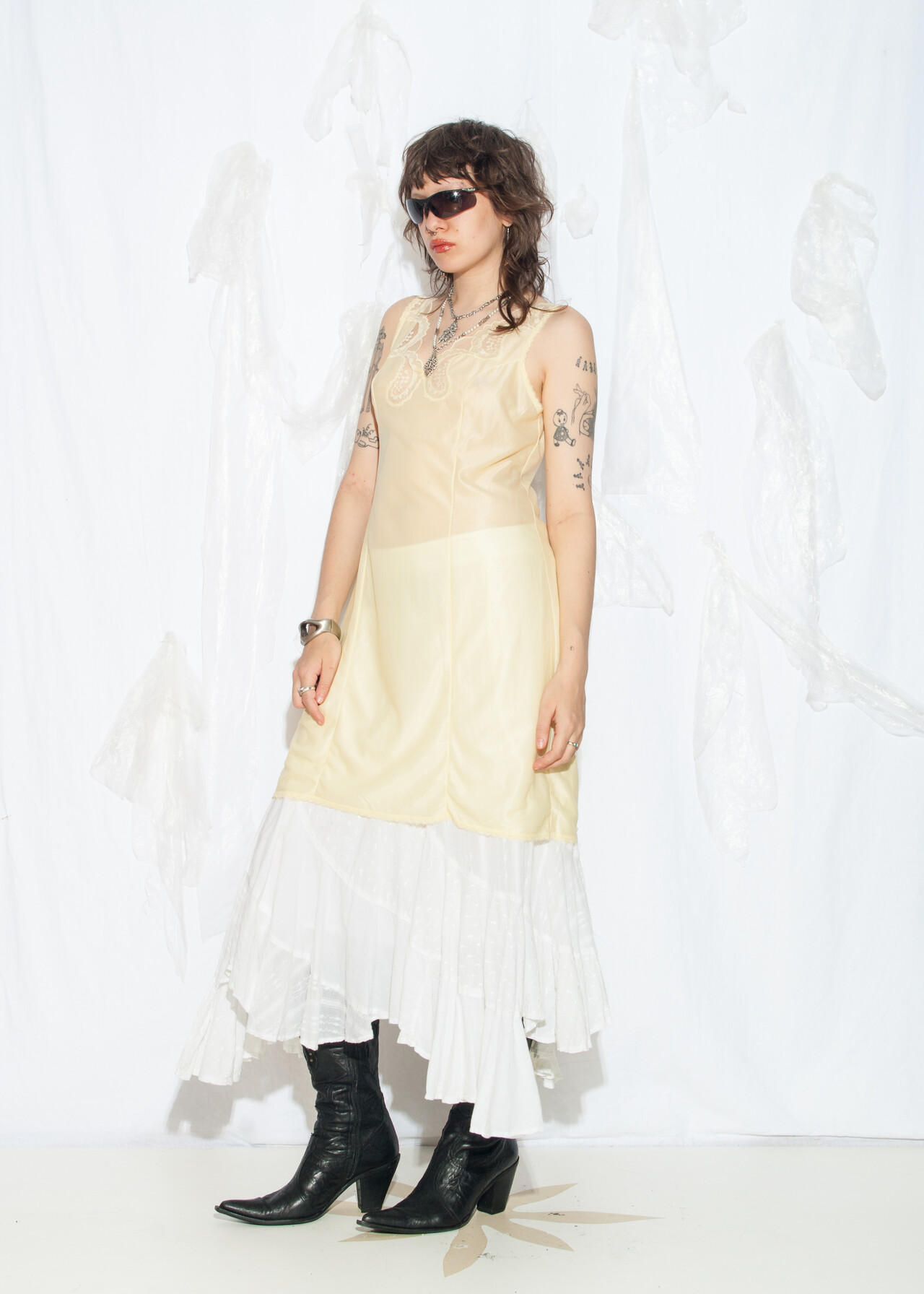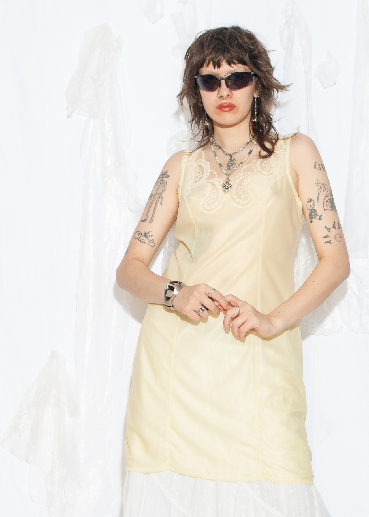 Tags: 70s vintage fashion, fairycore grunge, festival outfit, lace slip dress, layer dress, nightgown, nylon babydoll, see-through dress, sheer midi dress, whimsigoth