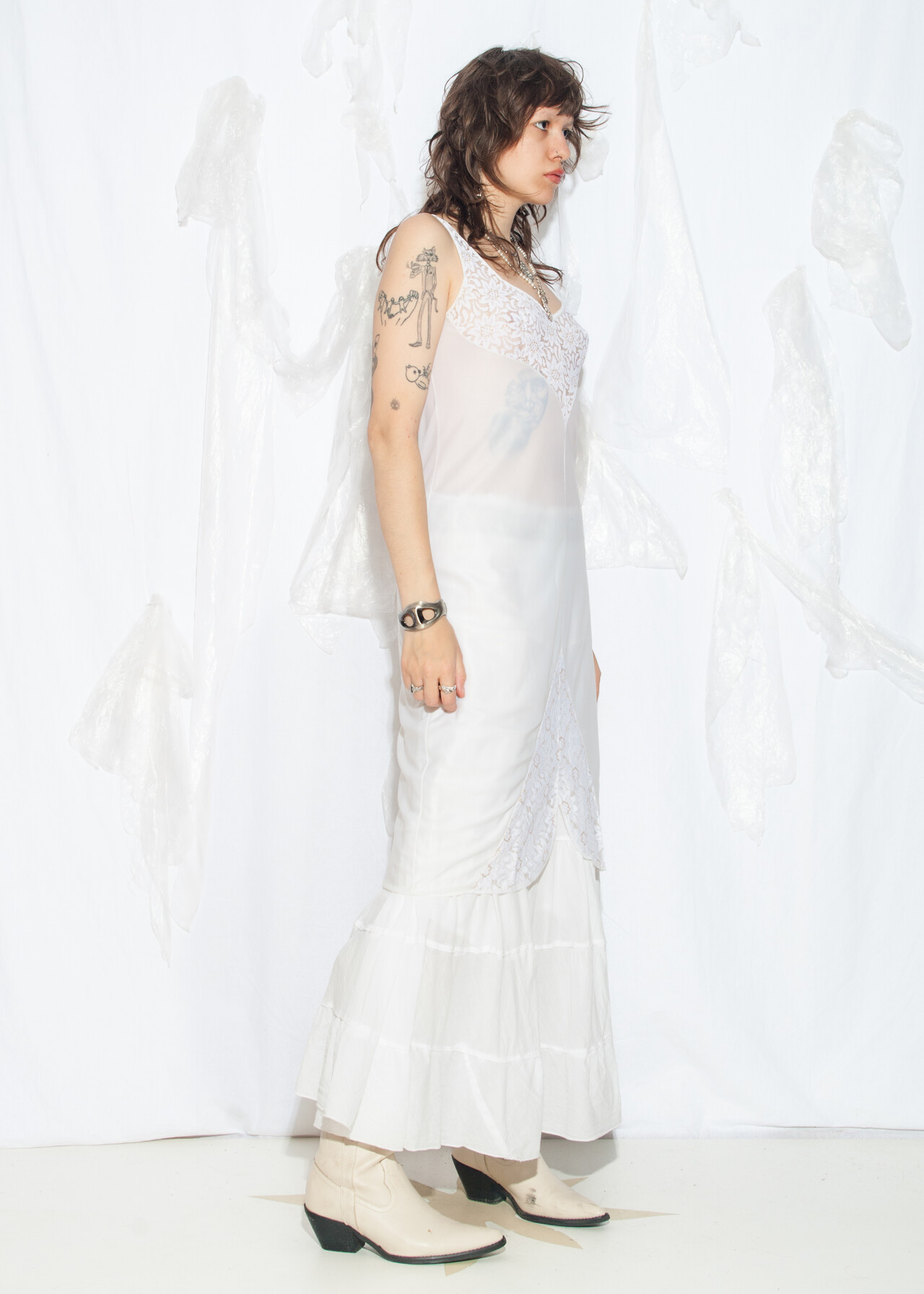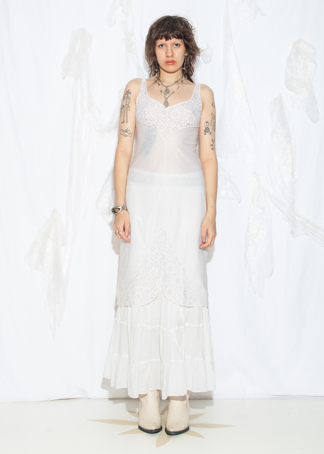 Tags: 70s vintage fashion, fairycore grunge, festival outft, lace lingerie, lace slip dress, layer dress, nightgown, nylon babydoll, see-through dress, sheer midi dress, whimsigoth