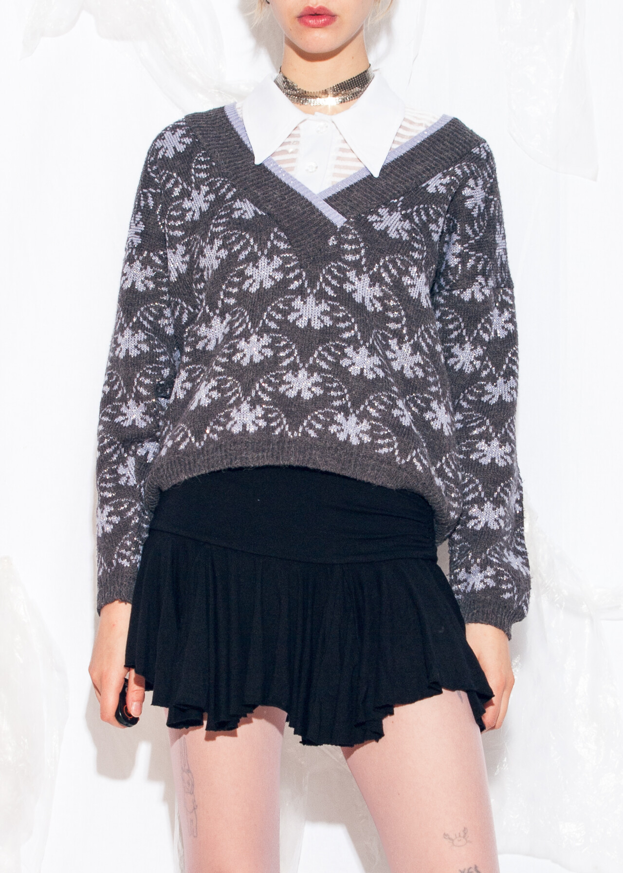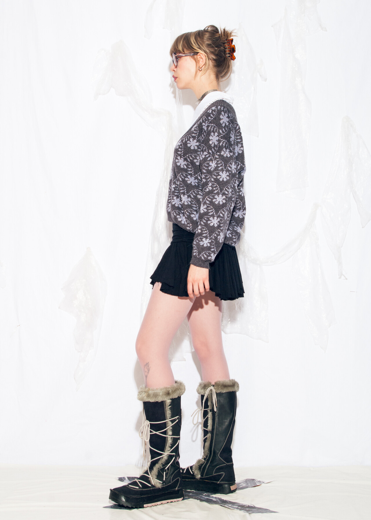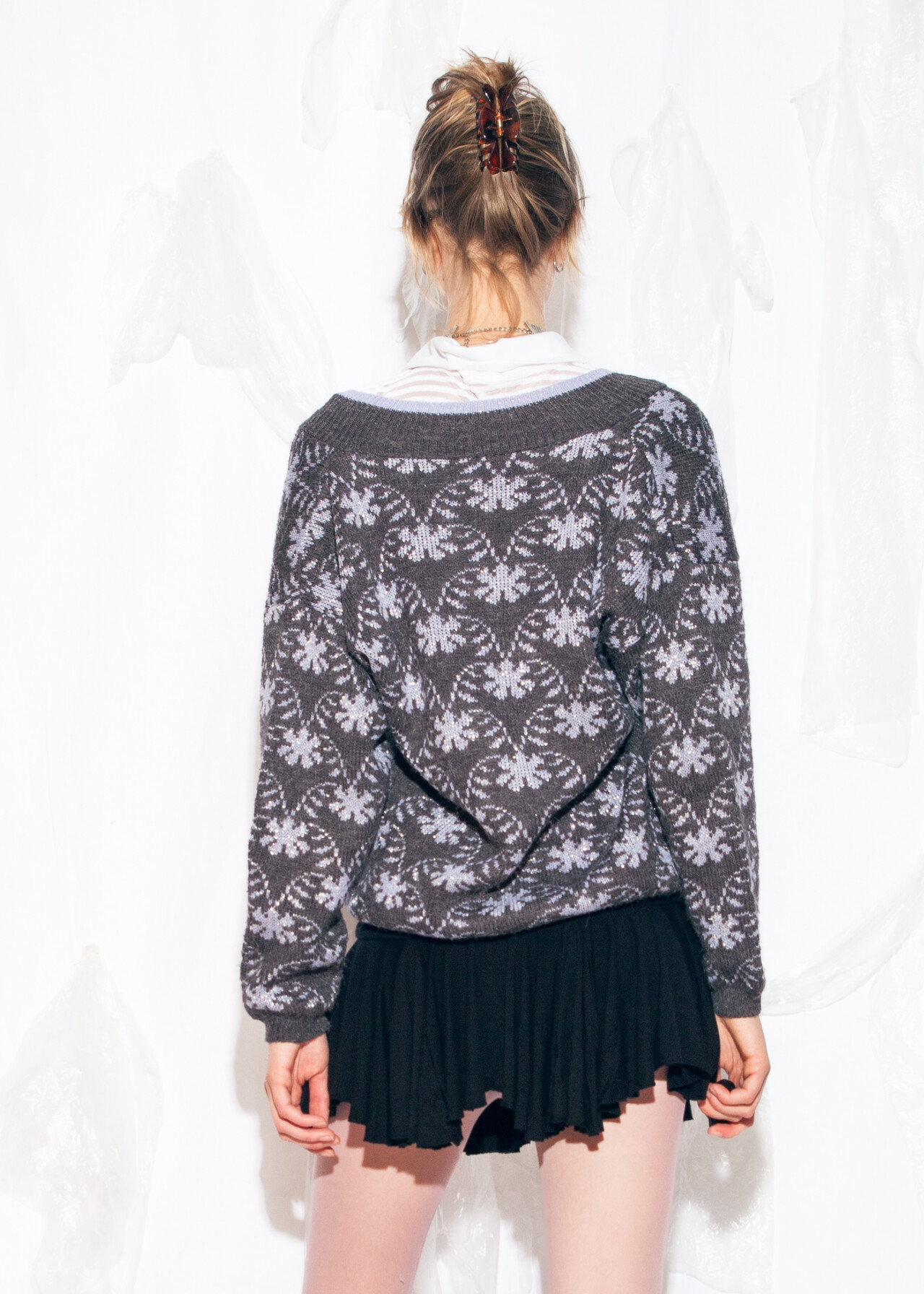 This 80s vintage knit jumper is like wearing your grandpa’s Christmas spirit in shades of silver and purple.