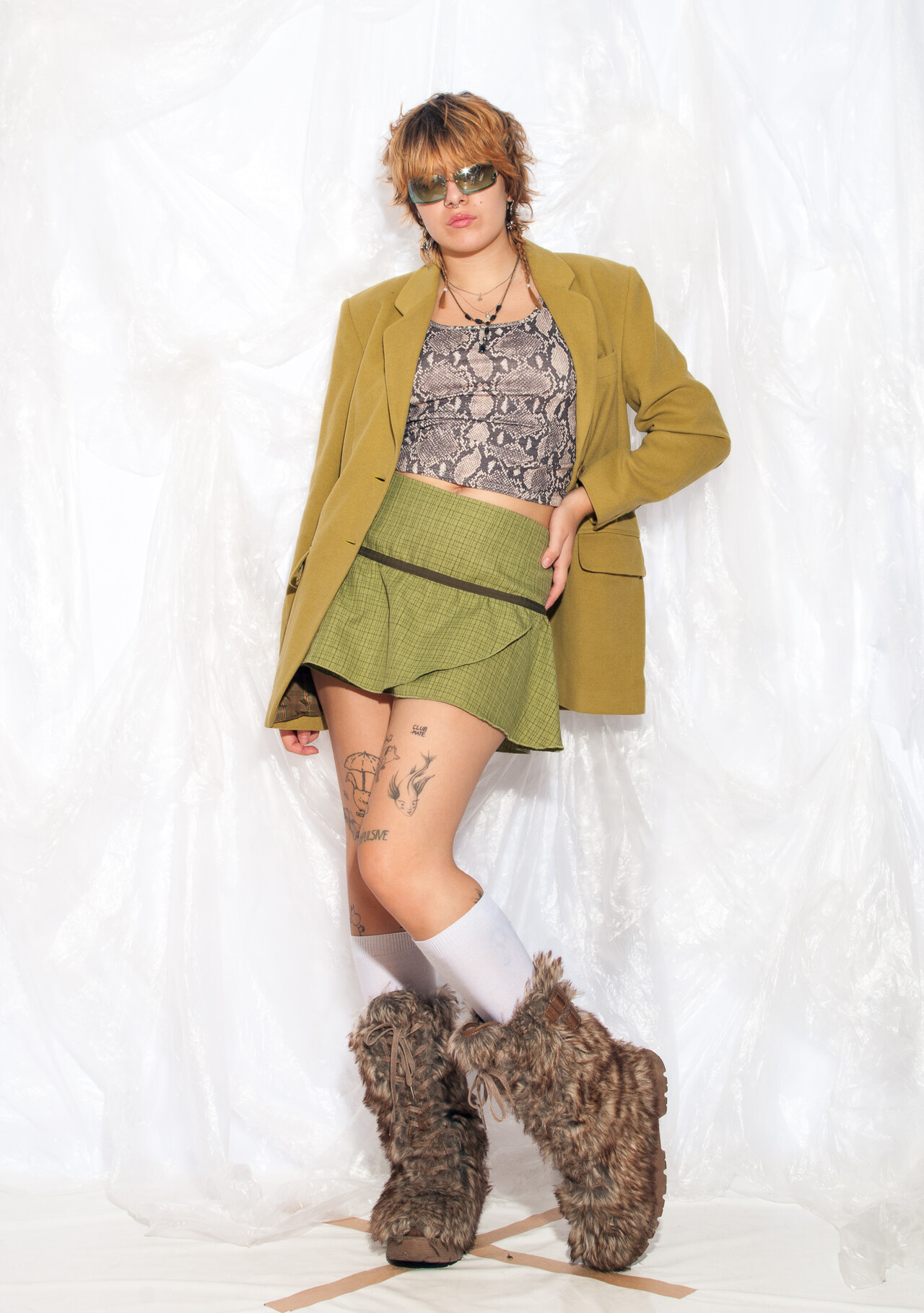 This 90s vintage blazer is like respacing Tetris blocks in jazzy green. Defy gravity, authority, and unbuttoned sanity with fashion that’ll practically make you pop a cassette tape right into your ol’ Walkman.