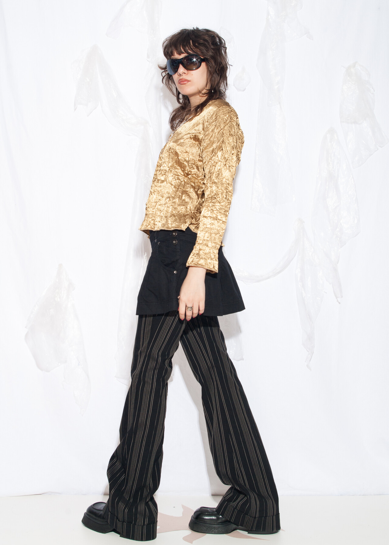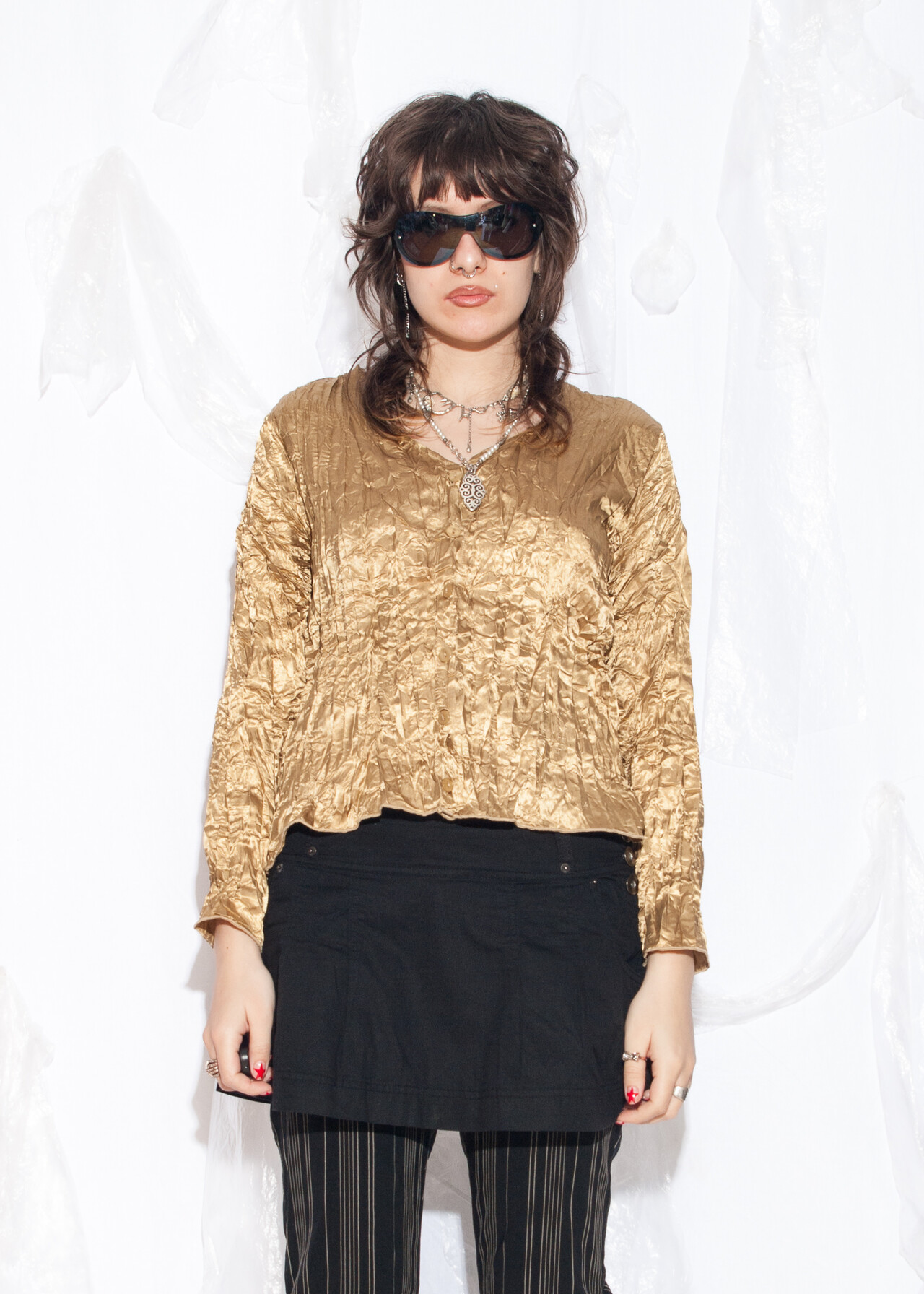 This 90s vintage blouse is like wearing a golden ticket straight from the creased-satin wonderland of grunge and glam.