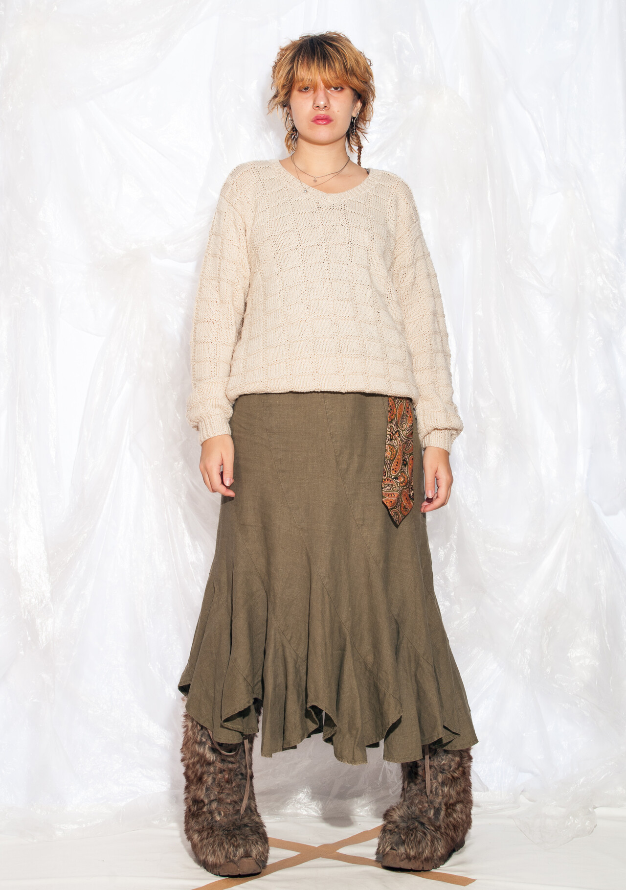 This handmade 90s vintage beige knit jumper is a cosy time capsule straight out of the buttoned-up era, when Friends dominated TV and the world was a little less tweaky.