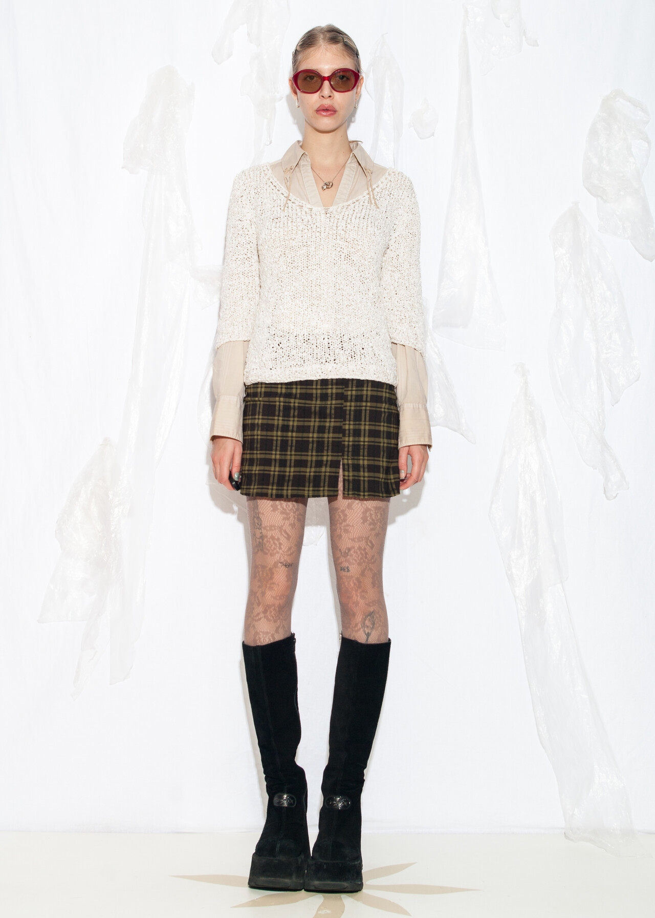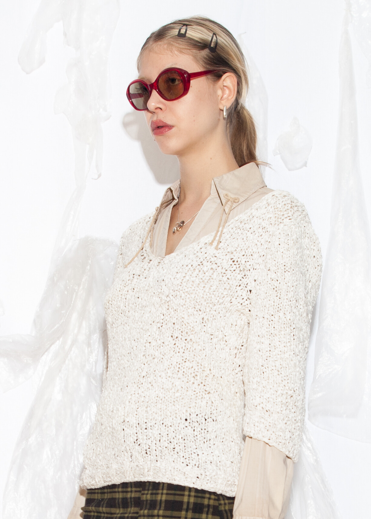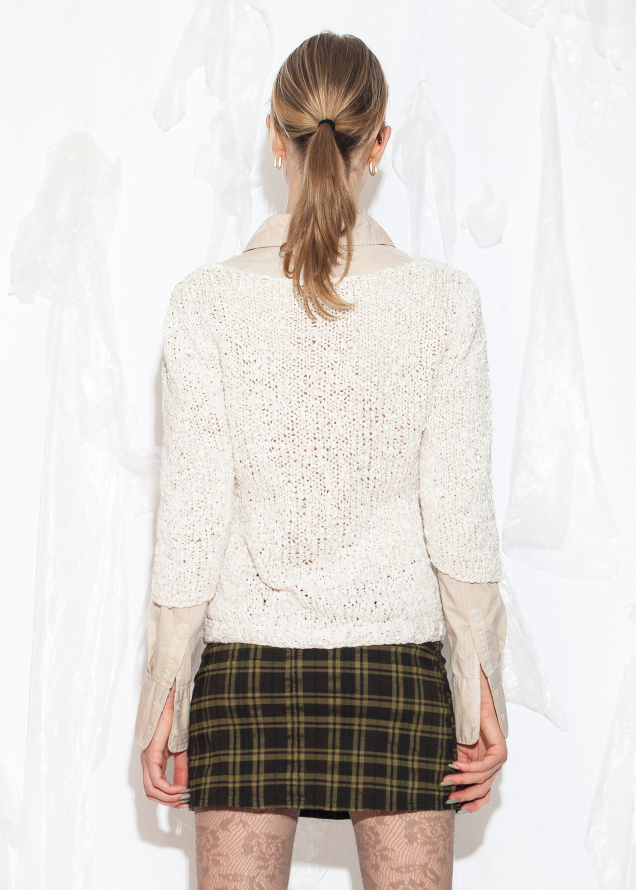 Tags: 90s vintage fashion, fitted sweater, loose knit jumper, white knitted top, y2k grunge outfit, y2k style clothing