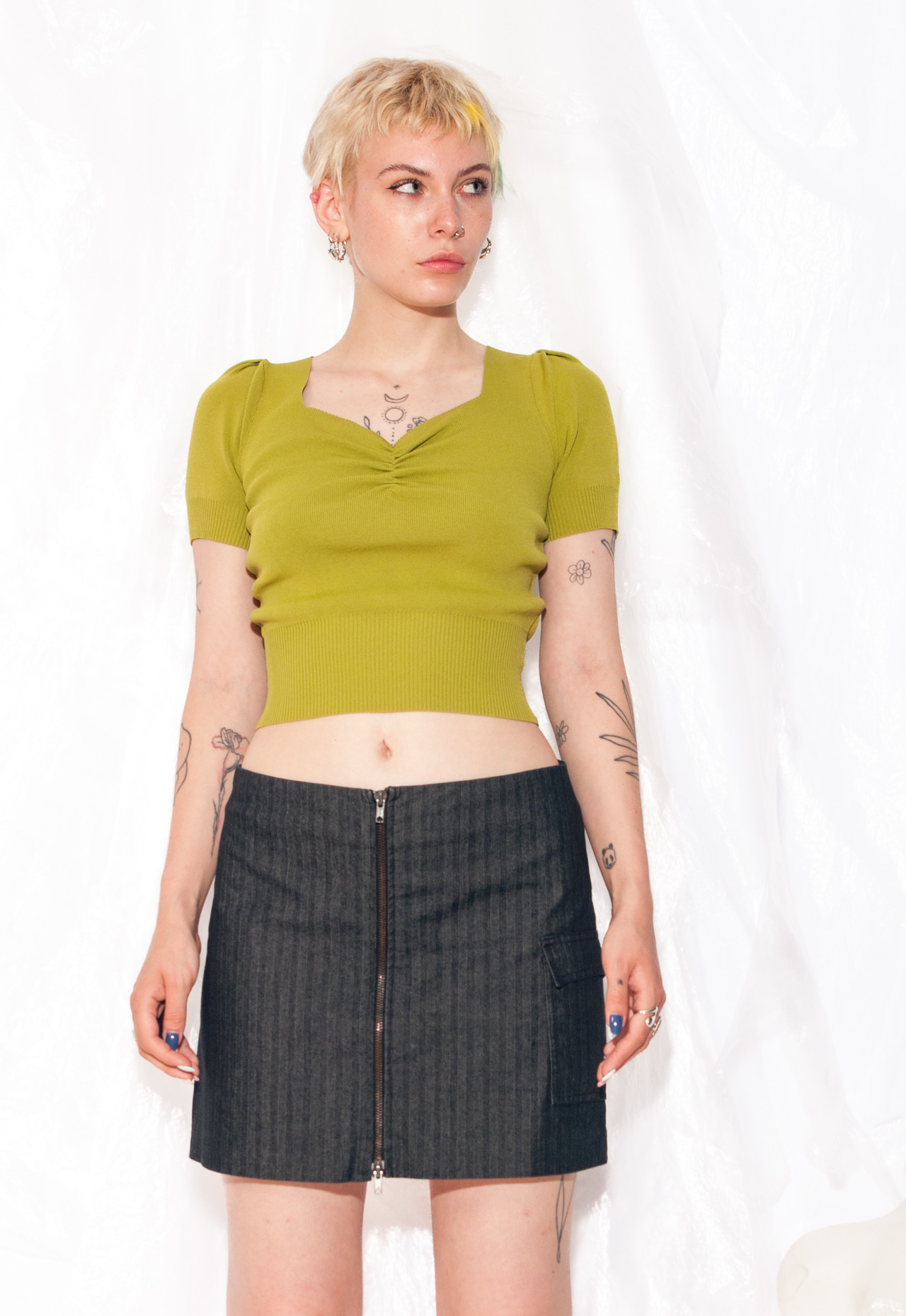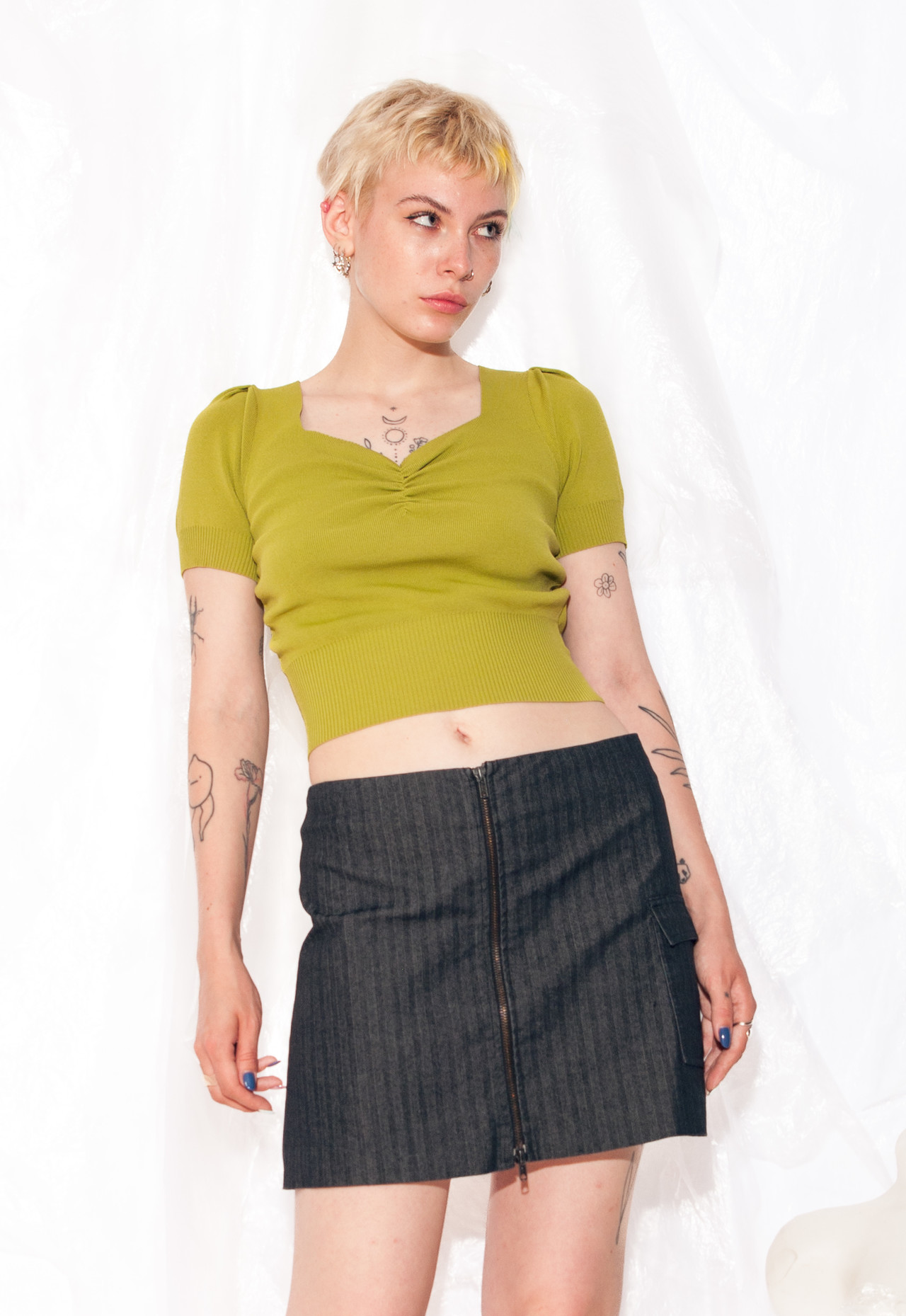 This Y2K vintage skirt is the epitome of radness. Made from cotton, it’s as comfortable as an eternal Sunday morning lie-in. With its mini style, two-way zip, grey hue, and one pocket for your gadgets (or snacks), it’s the ultimate fashion hack from the past.