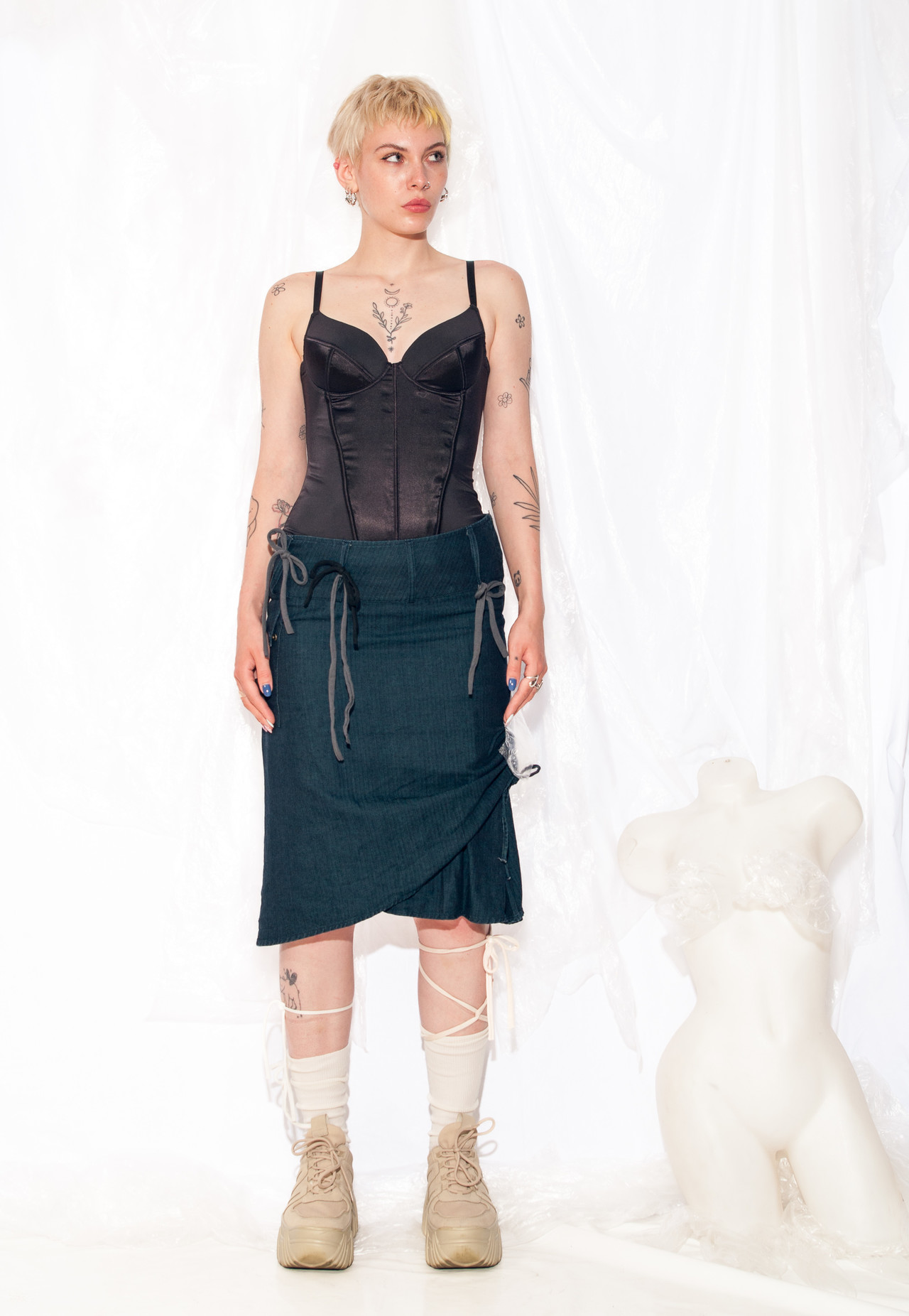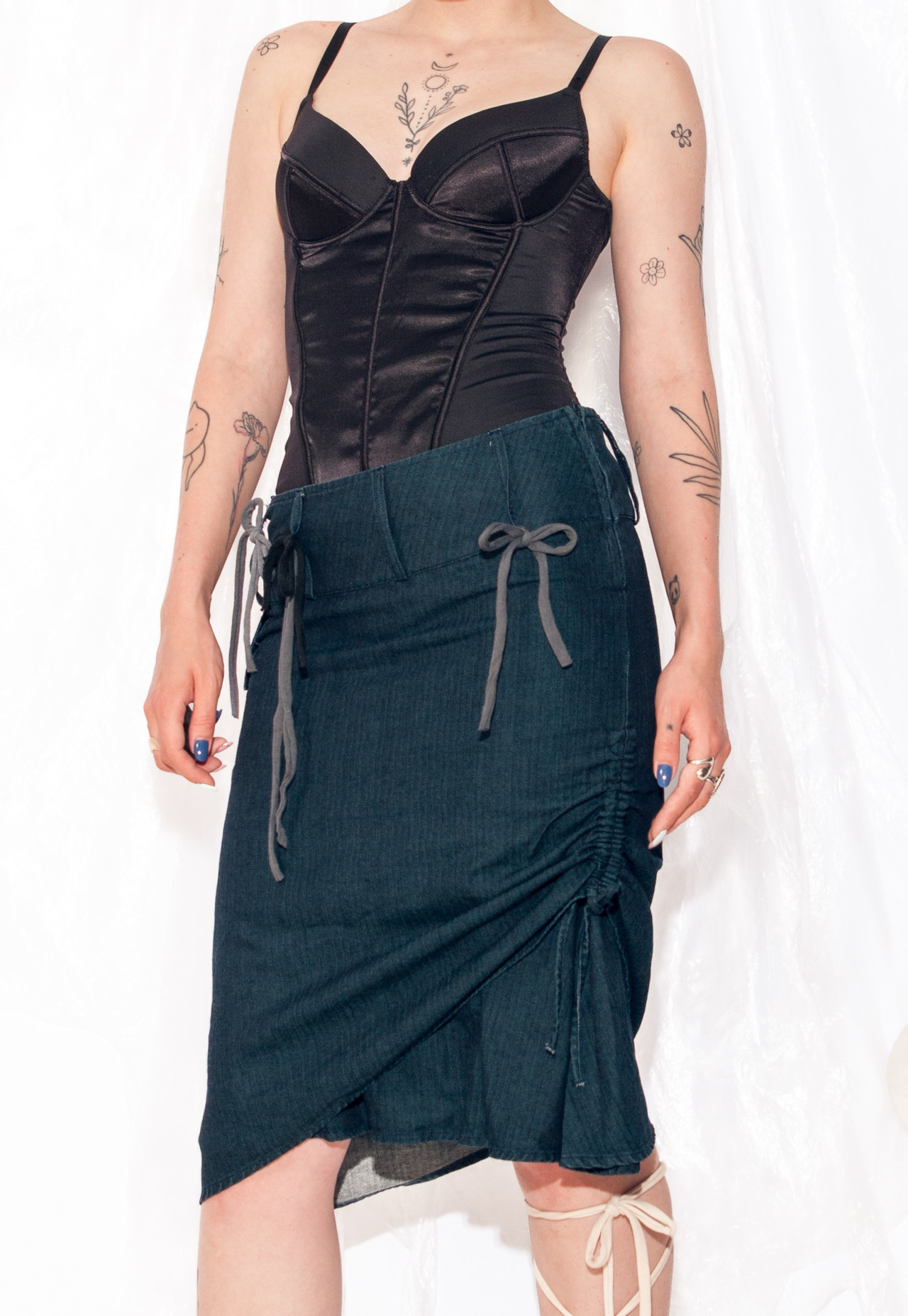 Be the first to review “Vintage Denim Skirt Y2K Ruched Bow Midi in Blue” Cancel reply