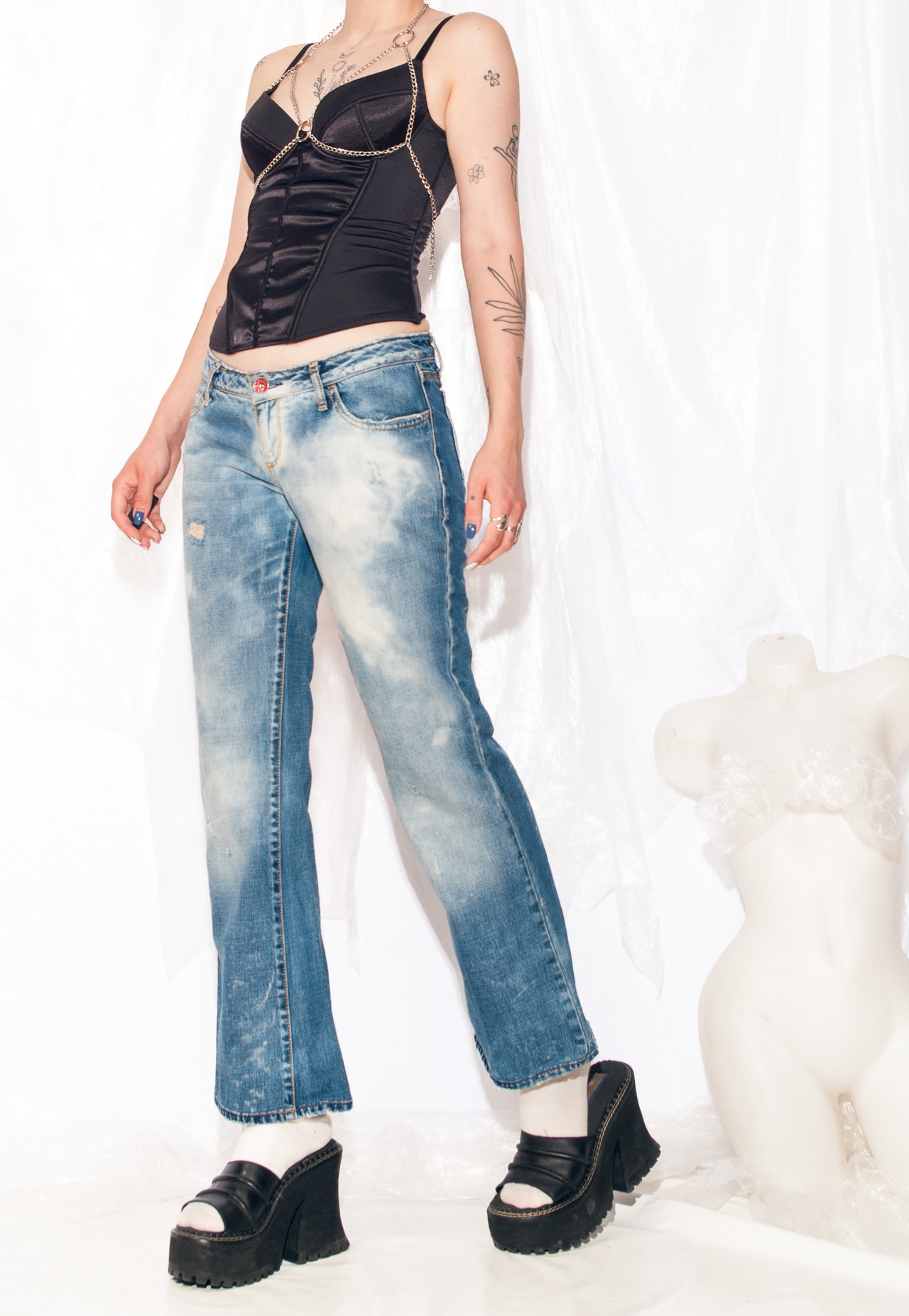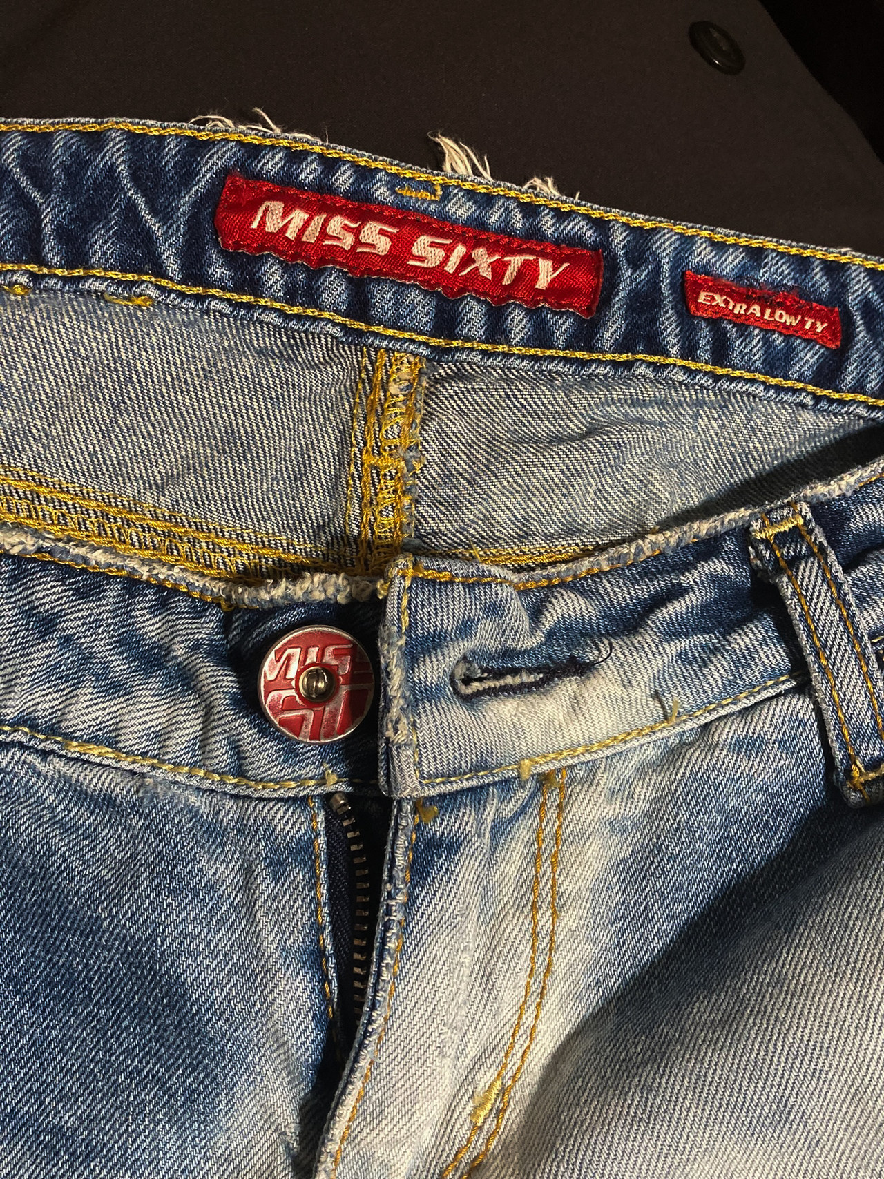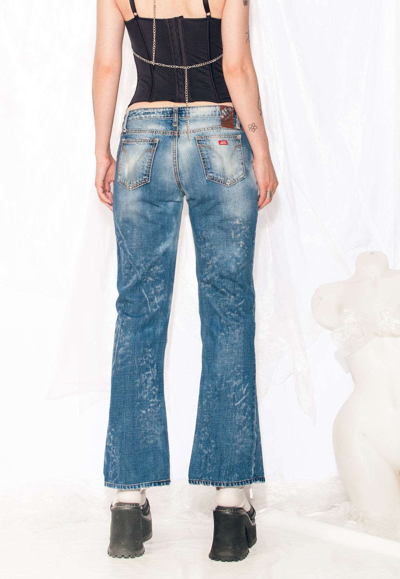Miss Sixty Y2K vintage low-rise jeans. With their acid-washed, distressed flares, these dreamy blue beauties are the epitome of quirky cool. Sporting a zip closure and five handy pockets, they prove that sustainability can be as trendy as it is timeless.