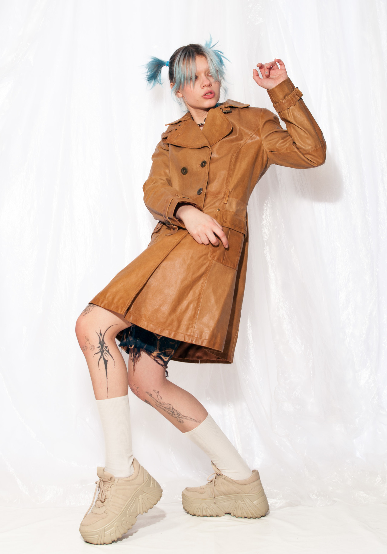 Vintage Leather Jacket Y2K Trench Coat in Brown