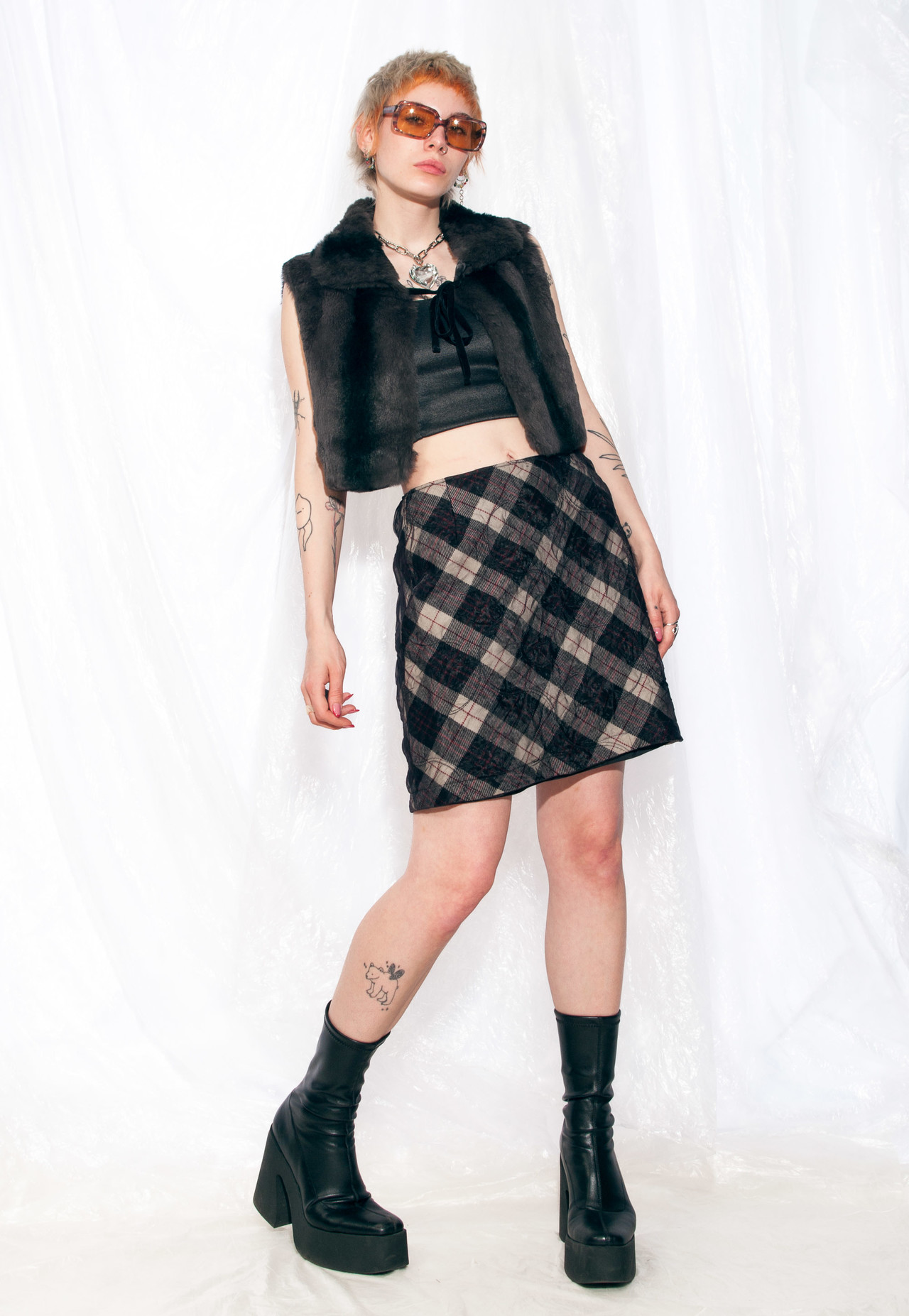 Y2K vintage plaid skirt with a twist. Made of wool and lined for maximum comfort, this mini skirt boasts a zip closure and an embroidered sheer upper layer. Plus, you’ll be helping the planet while looking rad.