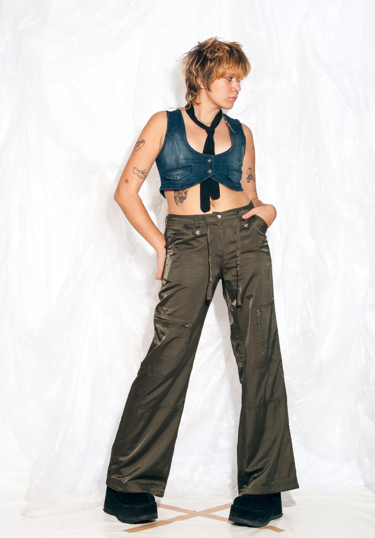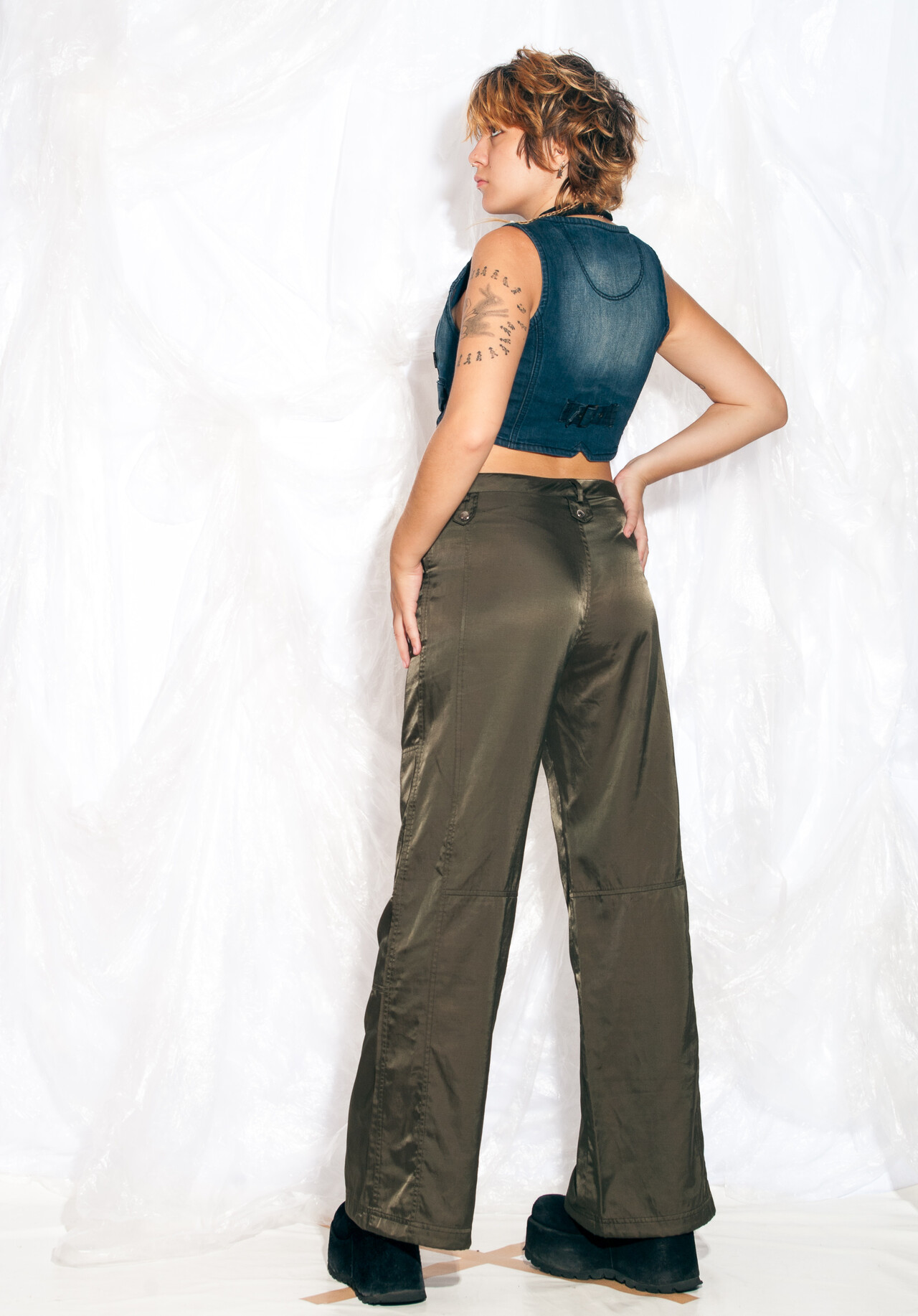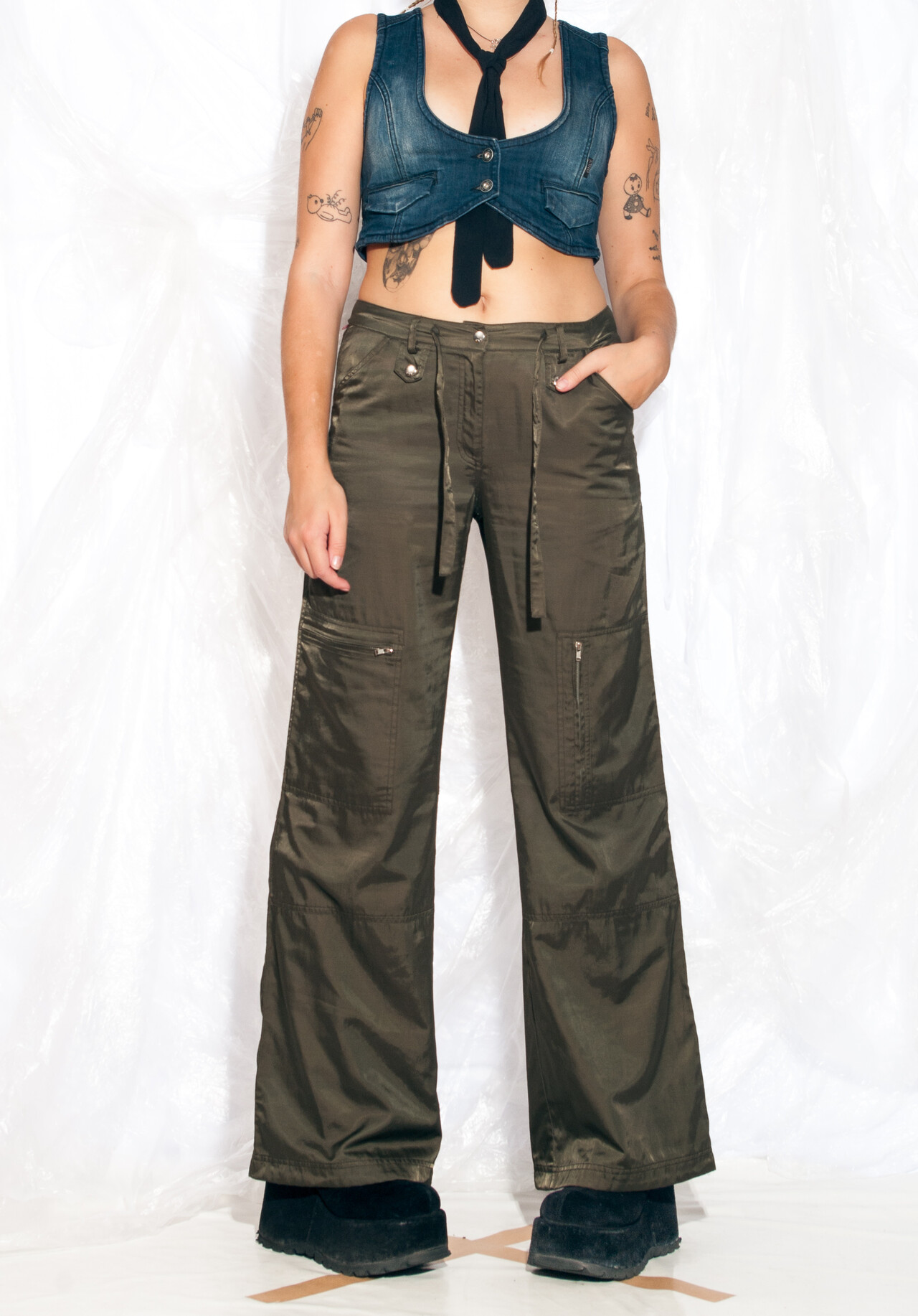 Vintage Y2K Cargo Flare Trousers in Khaki Satin
