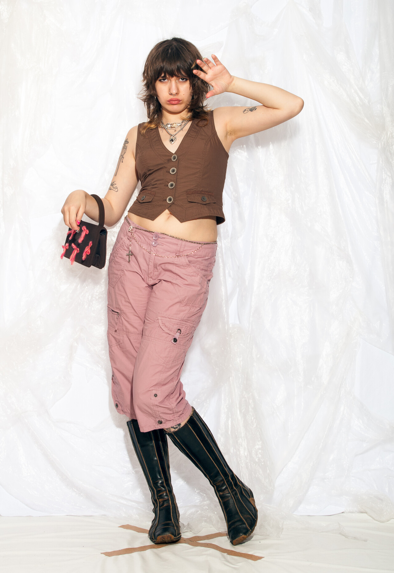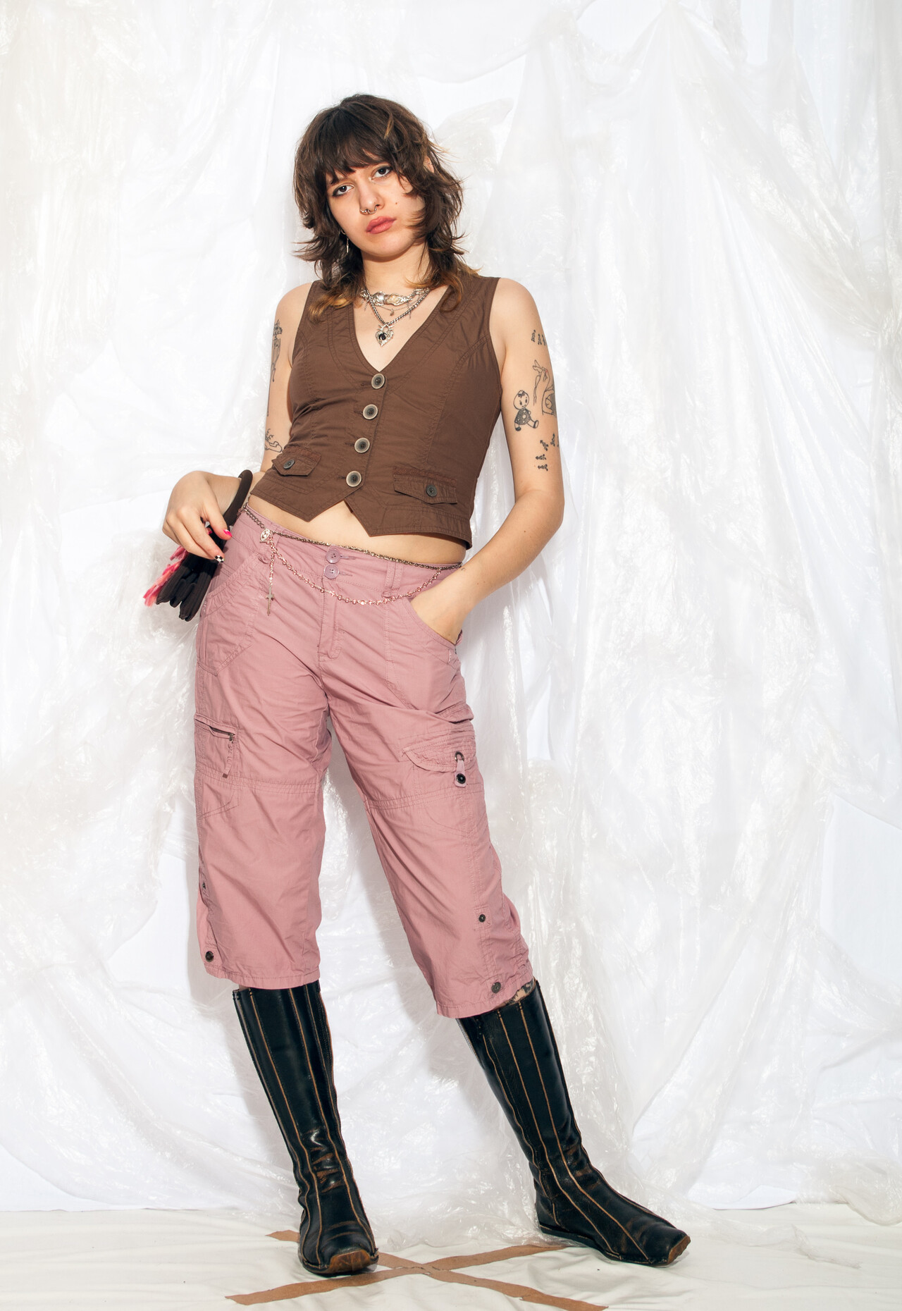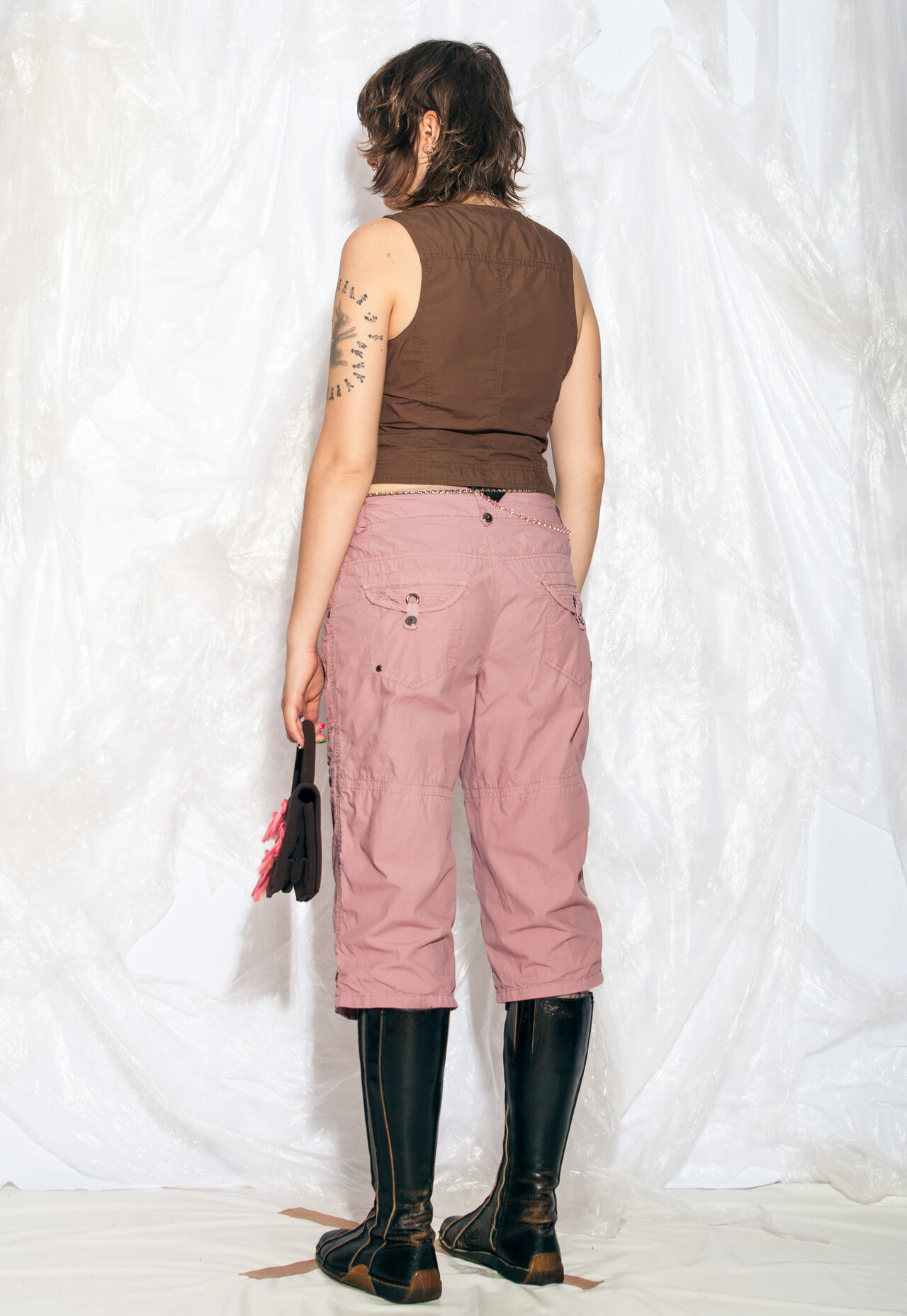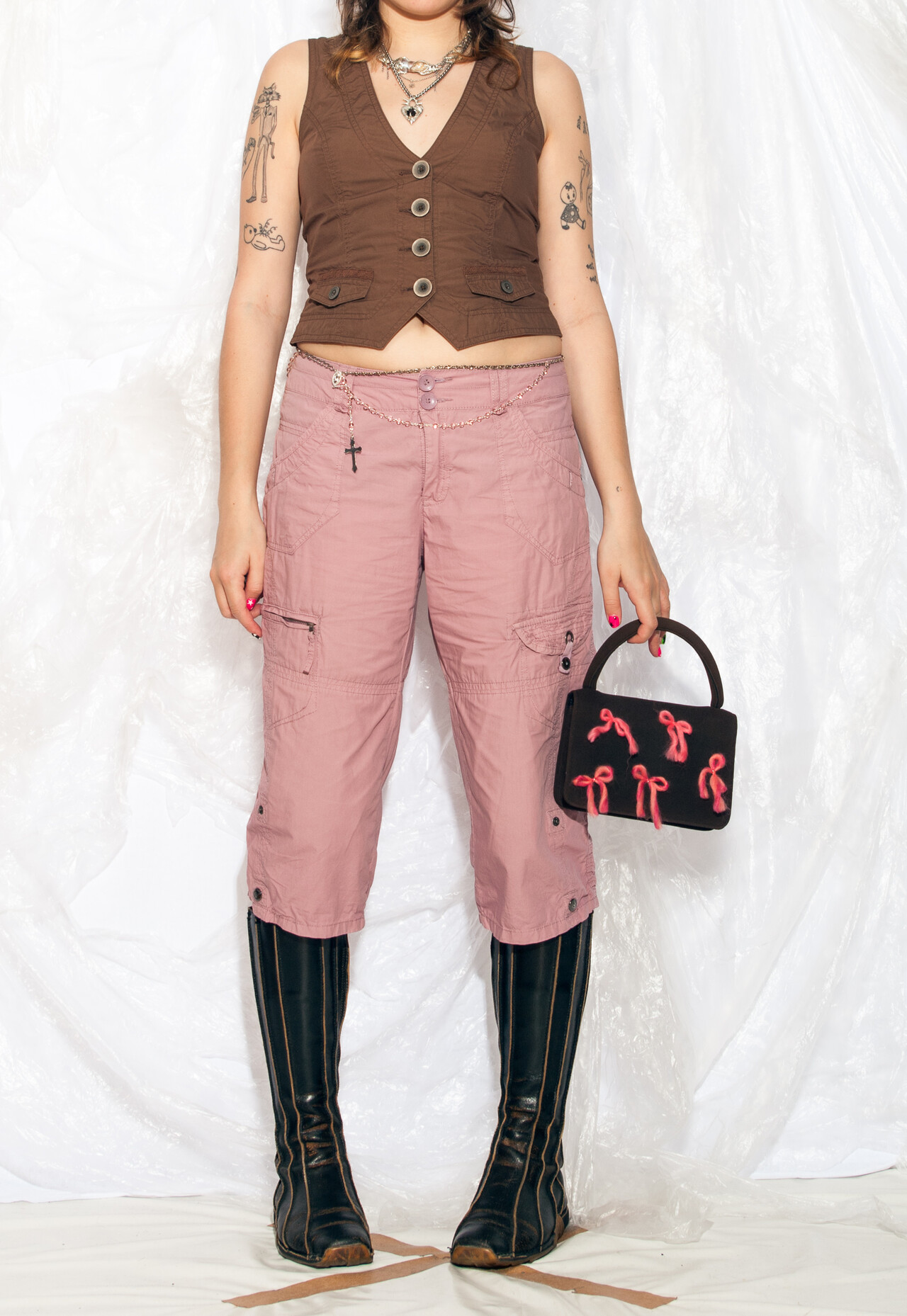 Y2K vintage capri pants – because nothing says “cyber grunge” like pink cargo shorts that can hold all your angst and snacks from the early 2000s!