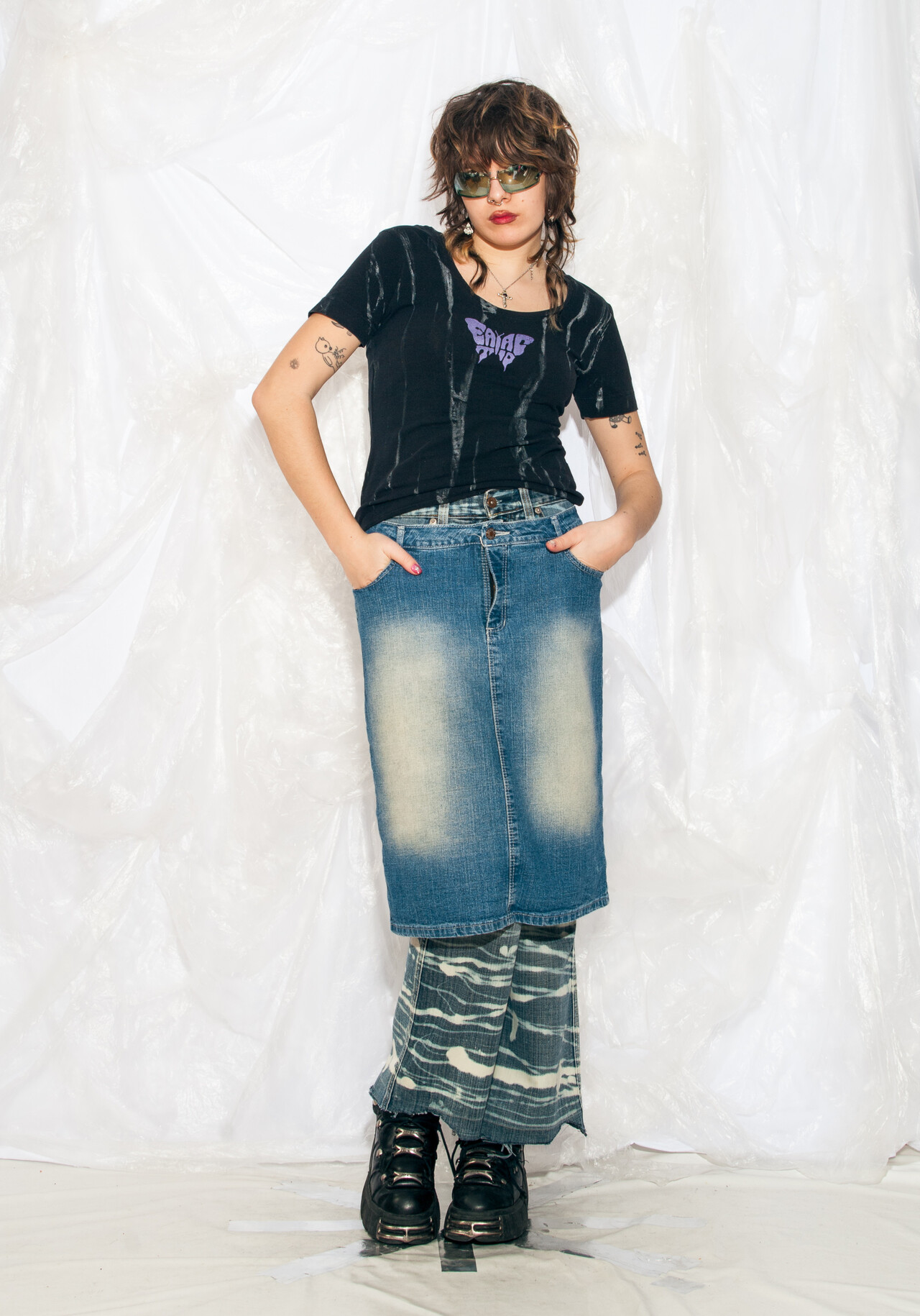 A Y2K vintage denim skirt in flawless condition. It features four pockets, stonewashed details and a zip closure. Not to mention its perfect midi cut.