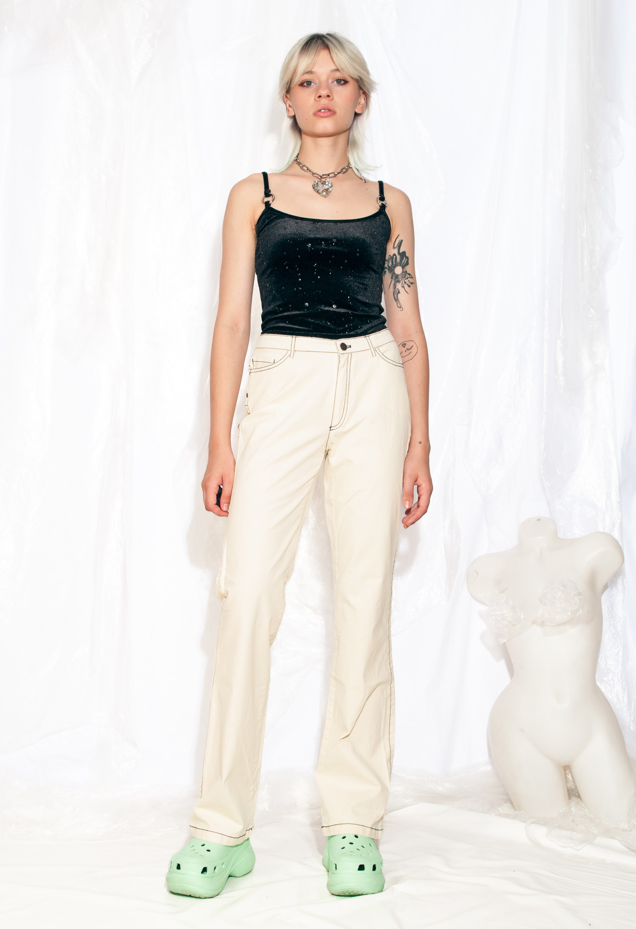 Y2K vintage trousers by Eugen Klein. These flares are like winning a time-travelling lottery ticket – one second you’re sipping tea, the next you’re grooving to Spice Girls on a Nokia 3310. Beige, cotton, zip closure, five pockets – it’s everything you never knew you needed.