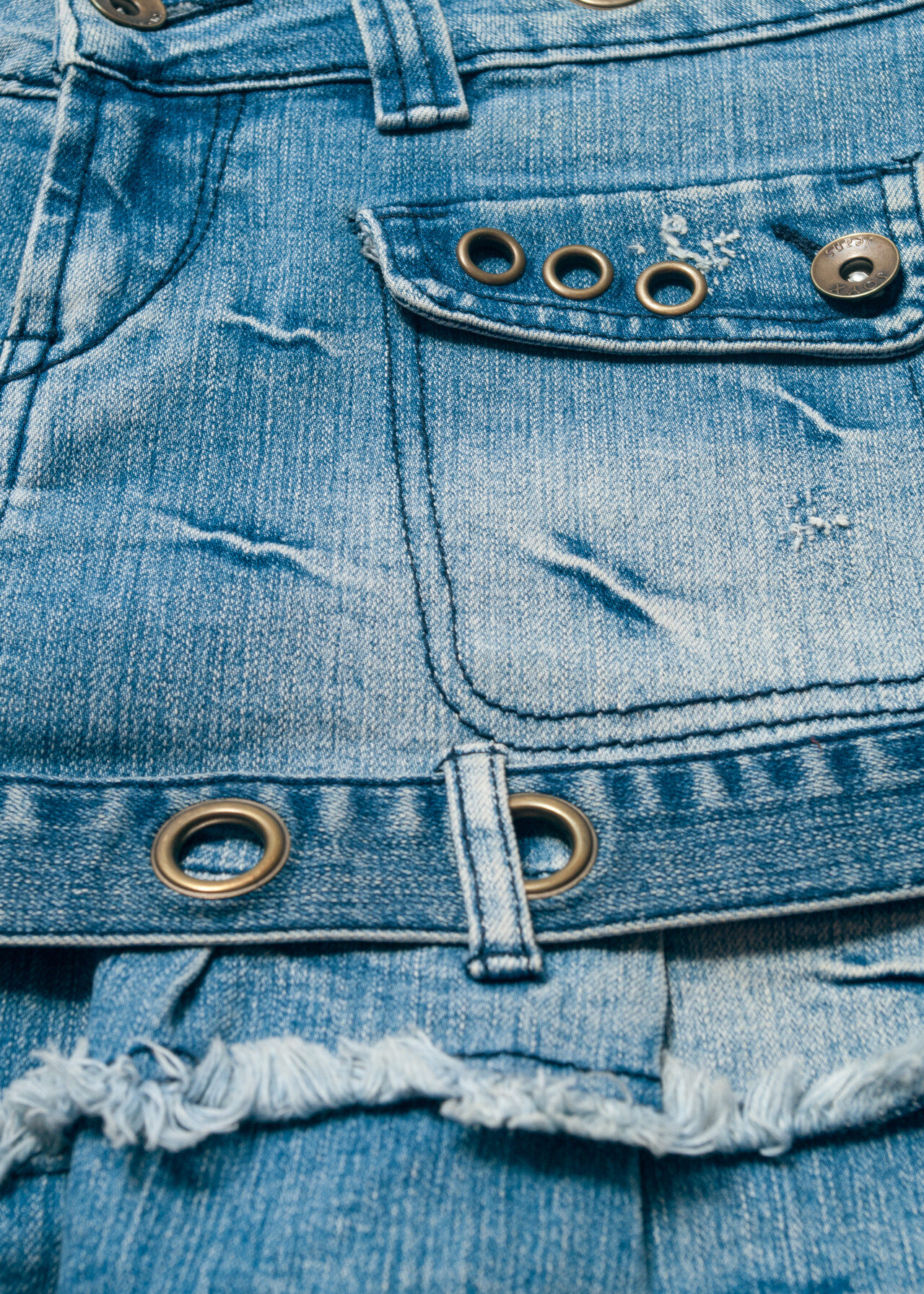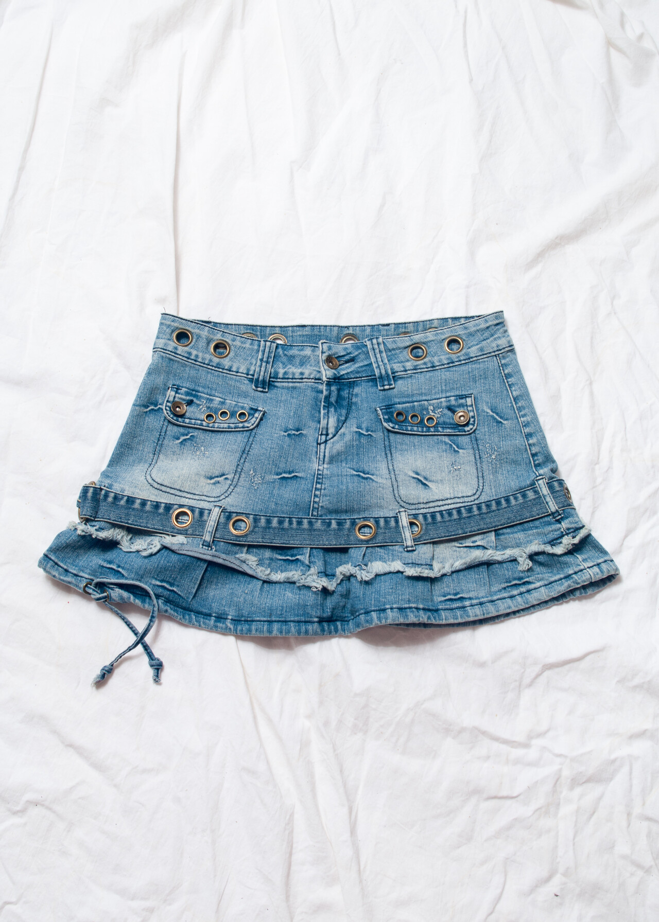 Tags: 2000s vintage style, belt skirt, denim micro skirt, frilly skirt, low rise waist, stonewashed
