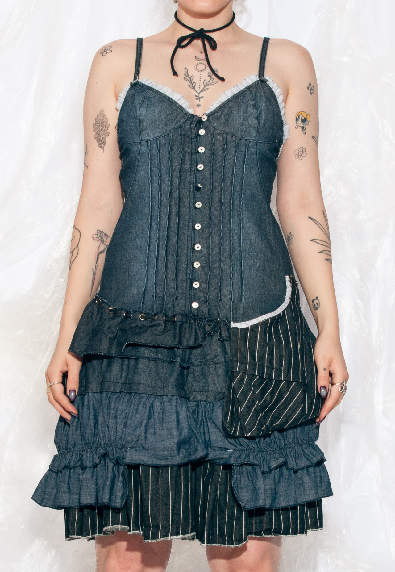 This whimsical Y2K vintage dress is pure magic with its patchwork-style ruffle skirt and corset-like top part.