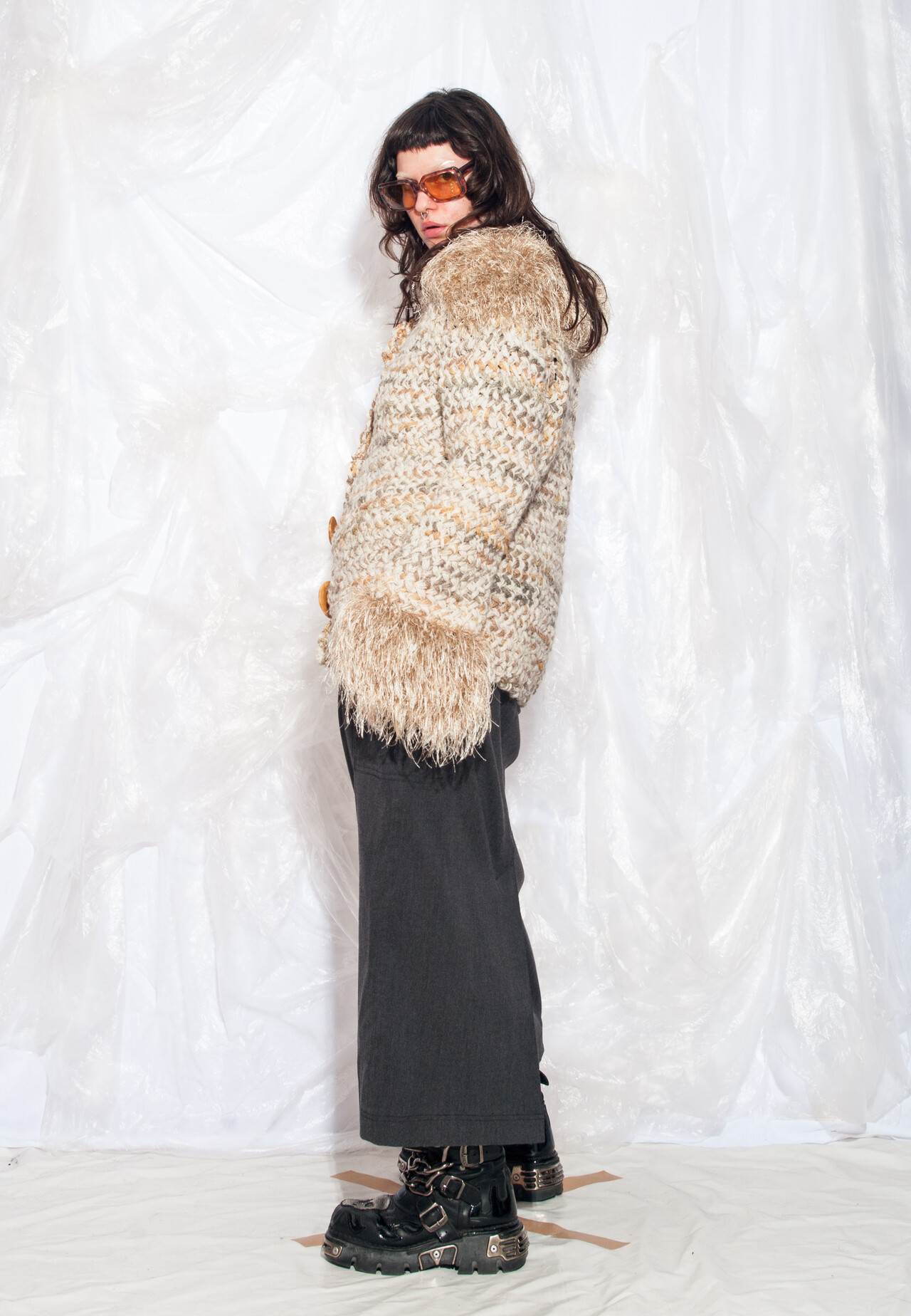 This Y2K vintage knit cardigan with its furry collar is like a warm hug from the past – a cosy hand-knitted perfection that will transport you back to a simpler time. Wrapping up nostalgia and style in one beige package.