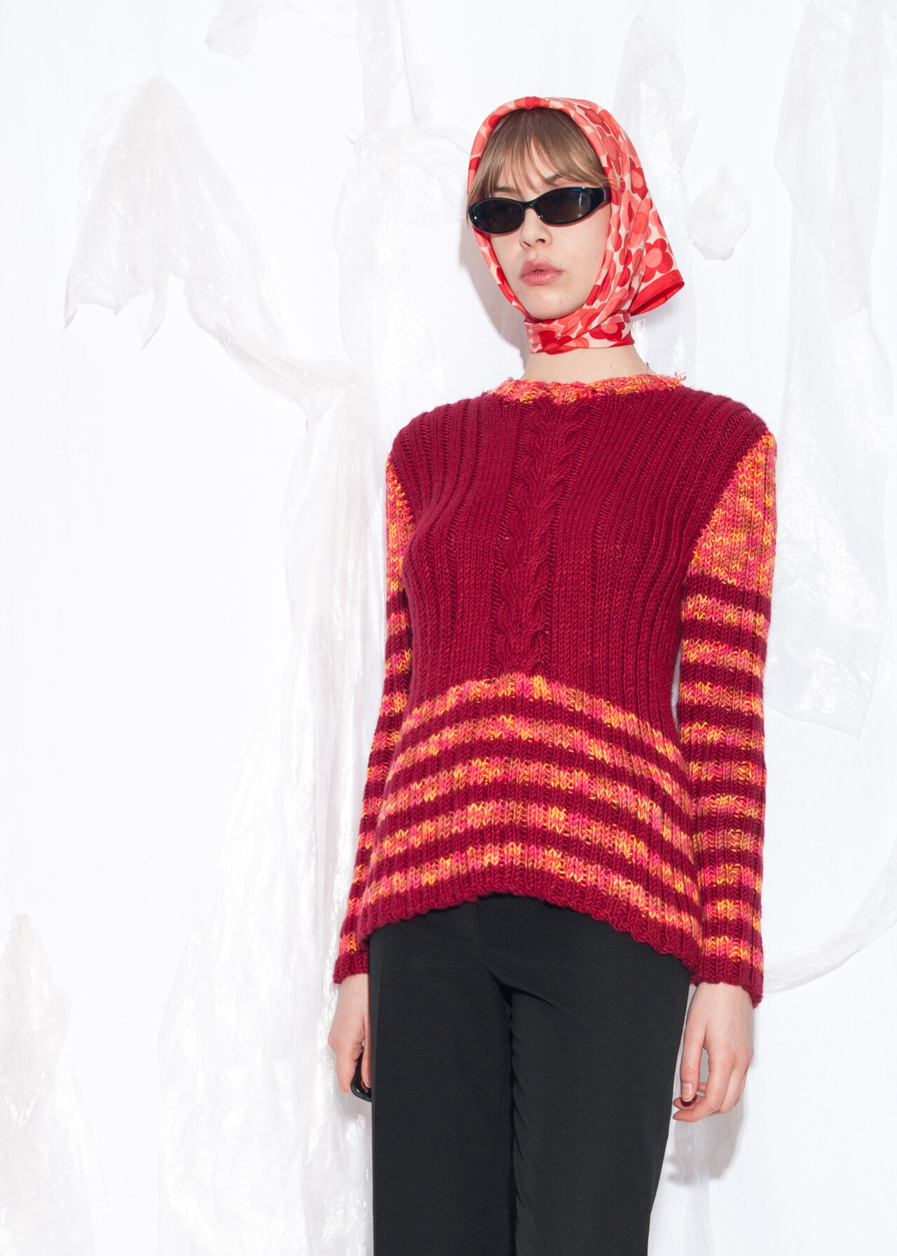 This Y2K vintage knit jumper is a snuggle-worthy hand-knitted masterpiece that takes you back to the era of butterfly clips and boy bands, one whimsical stripe at a time.