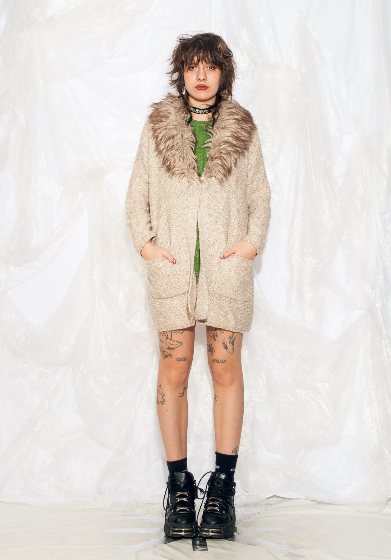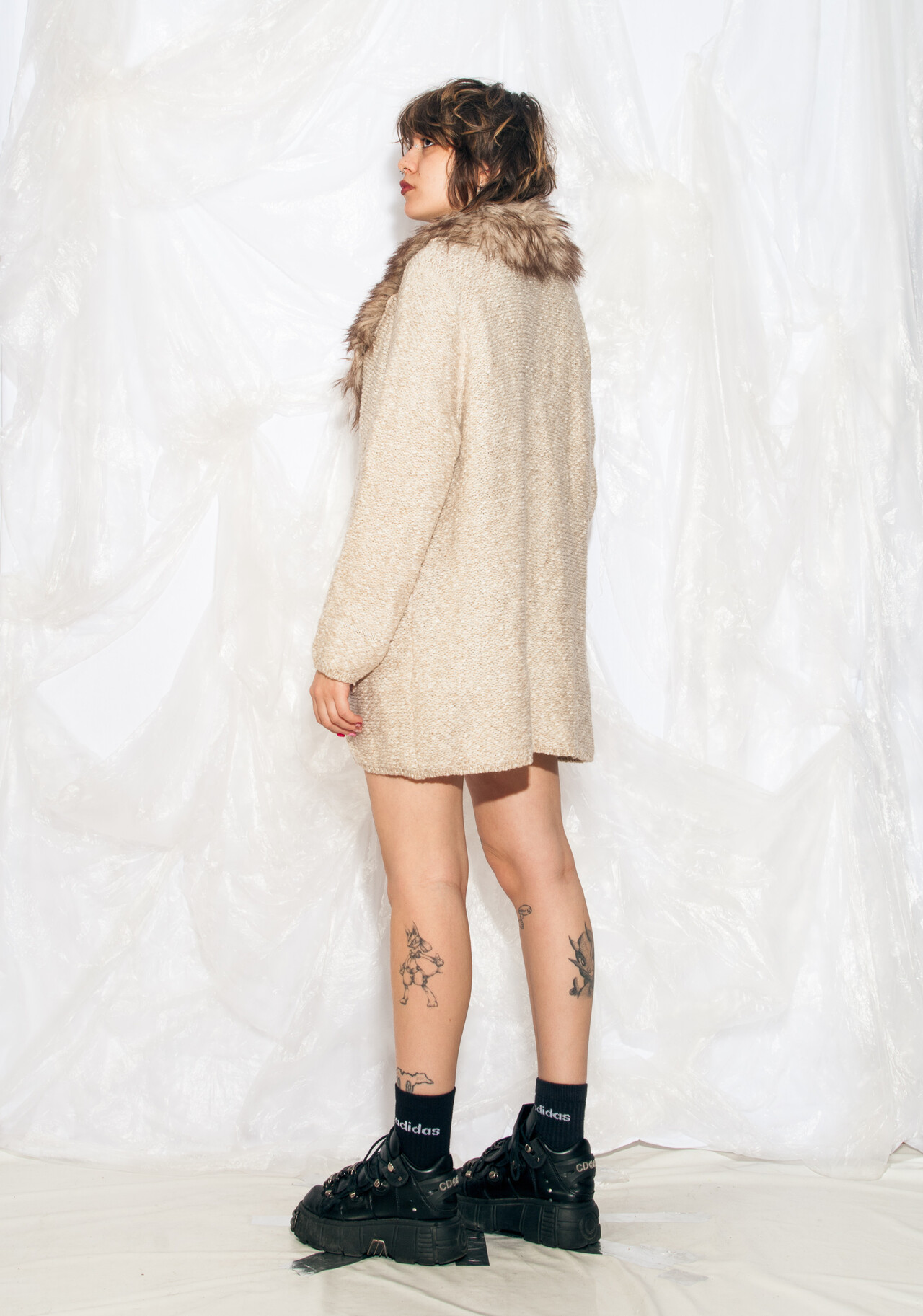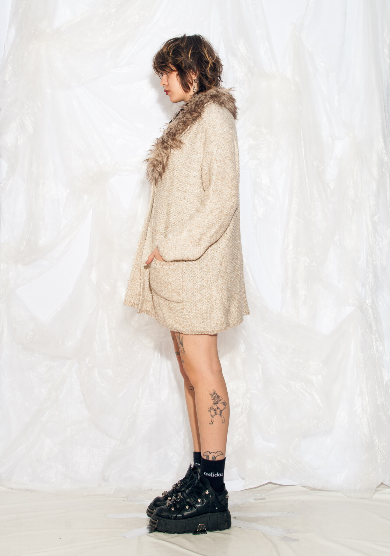 This oversized Y2K vintage knit cardigan belongs in a sitcom wardrobe. With its faux fur collar and beige hue, you’ll be ready to tackle any quirky situation that comes your way – all while staying snug and stylish.