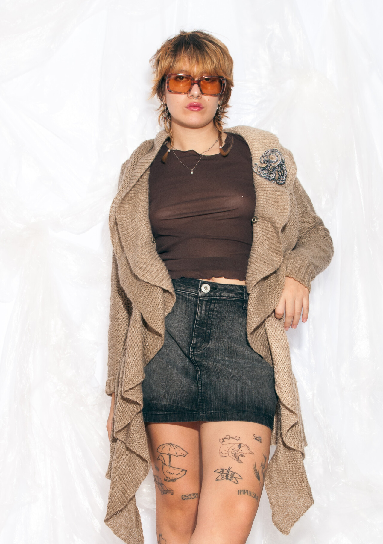 This Y2K vintage knit cardigan is a frilly blast from the past. With knitted roses on the lapel, it’s like wearing a bouquet…but on your sweater. Brown and long-sleeved, it brings a touch of Y2K eccentricity into the present.