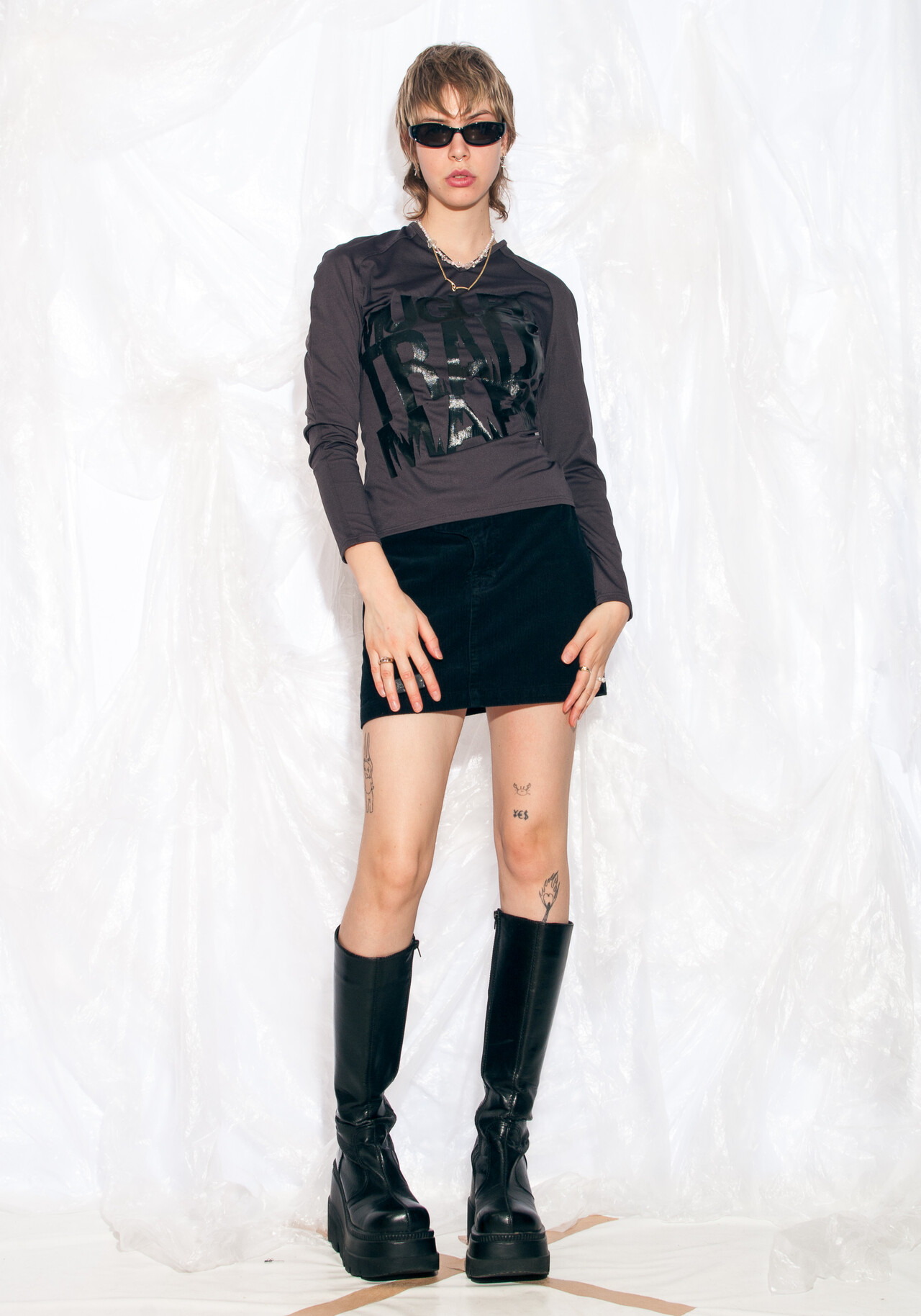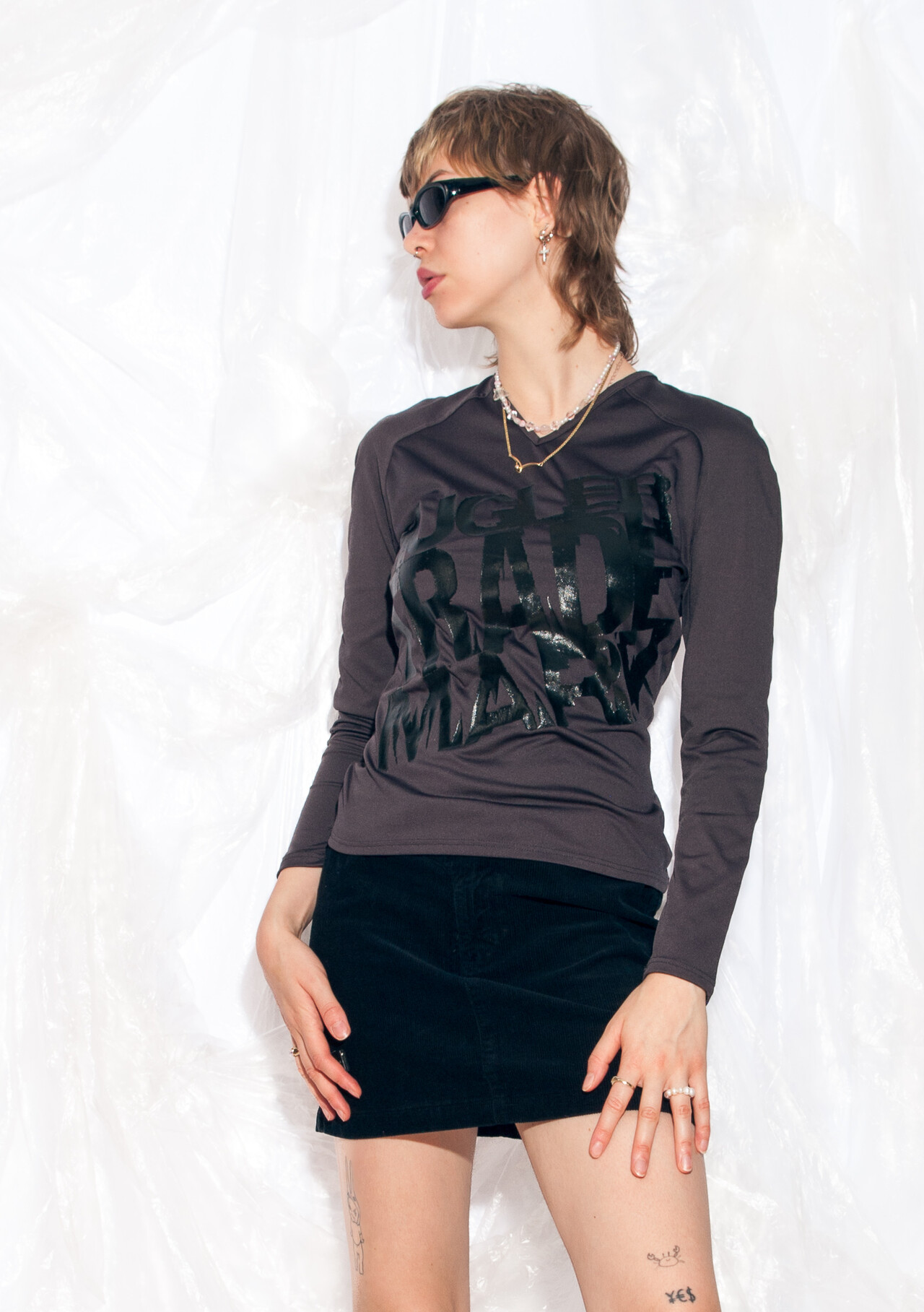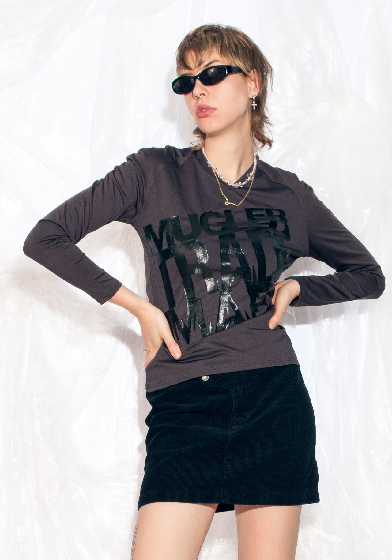 Step into the early 2000s with this mega-rad Y2K vintage spell out Mugler top. Rock this grey gem like you’re ready to hit the early Internet.